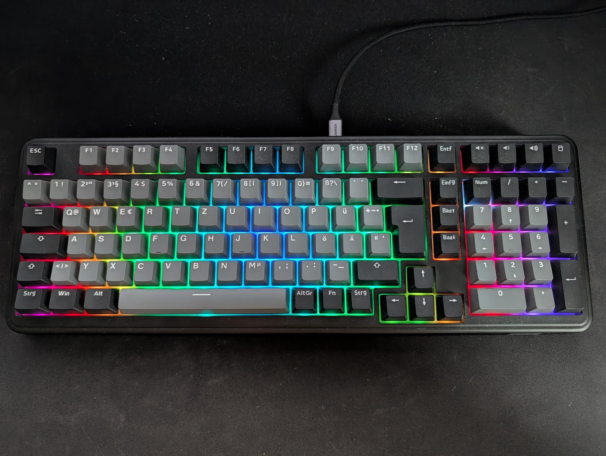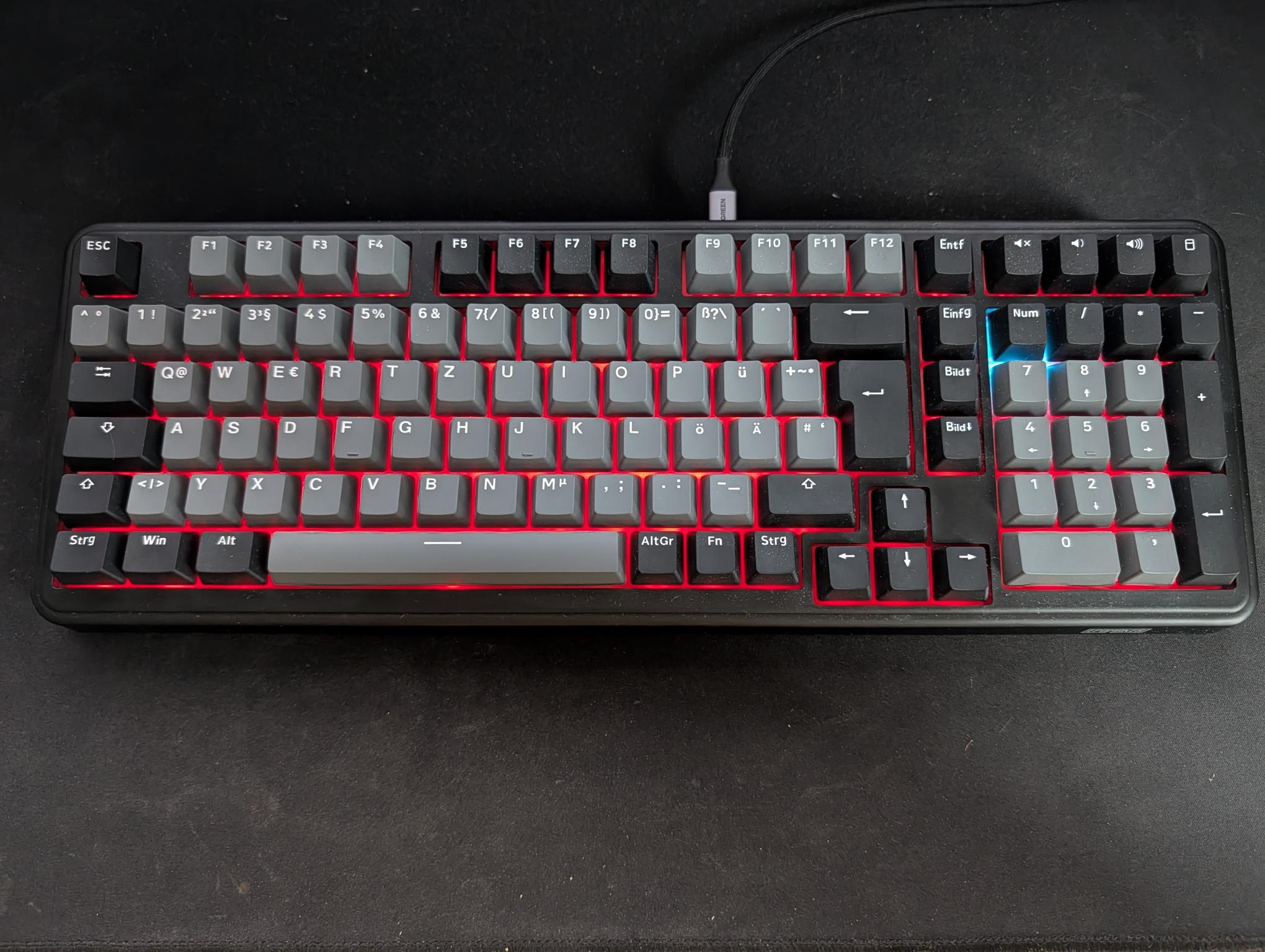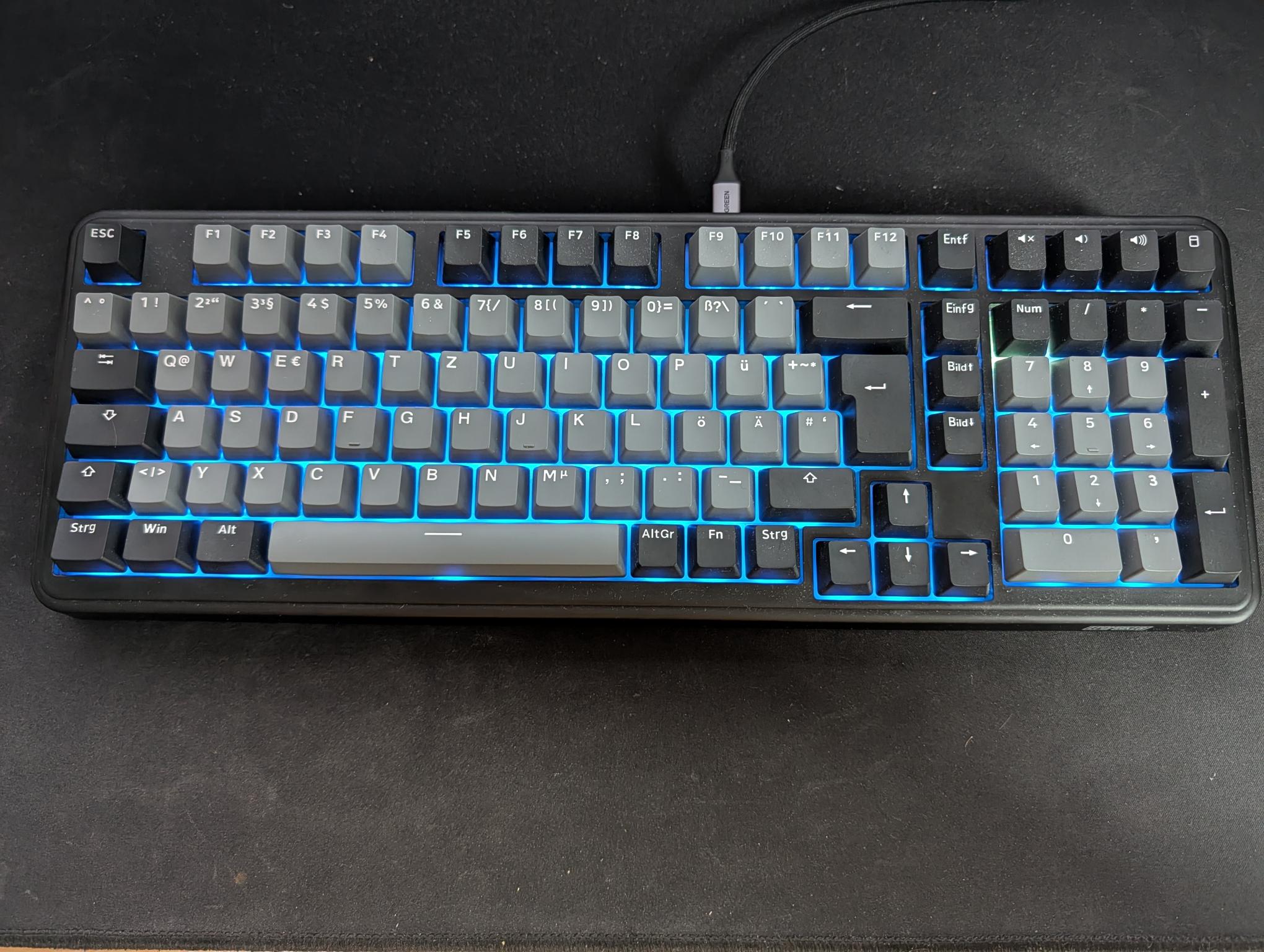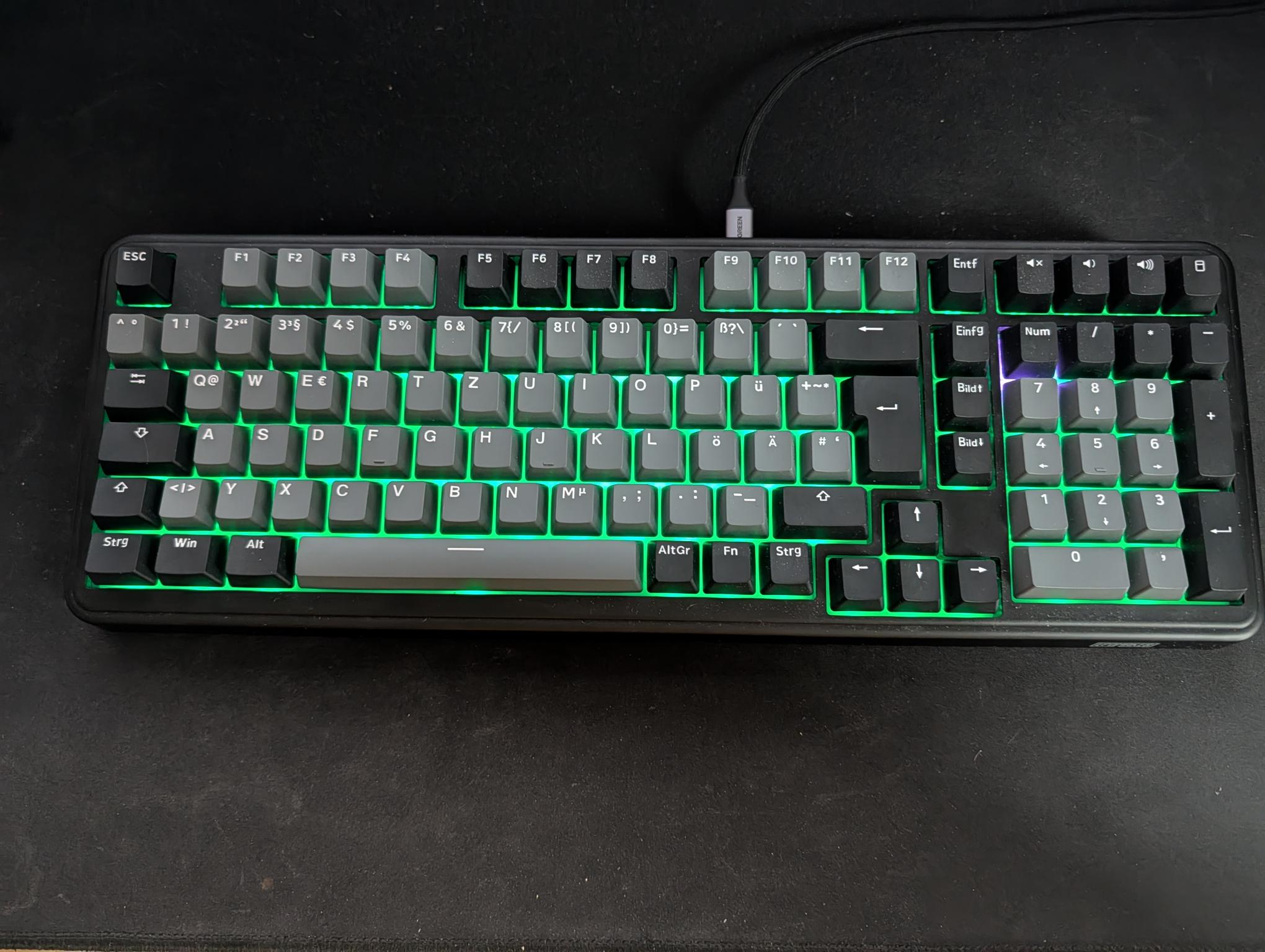 Die Tastatur besteht haptisch vollständig aus Kunststoff, wirkt durch ihr Gewicht von 1,14 Kilogramm jedoch äußerst hochwertig. Aktuell ist nur ein alltagstaugliches Design mit schwarzen und grauen Tasten erhältlich. Die Tasten bestehen im Übrigen komplett aus Kunststoff in dieser Farbe und sind nicht irgendwie eingefärbt oder überzogen. Im Vergleich zu meinen vorherigen Tastaturen fällt mir jedoch sofort auf, dass die Tasten nicht direkt leuchten, sondern nur die Hintergrundbeleuchtung aktiv ist. Im Dunkeln ist dennoch alles gut erkennbar, aber es ist einfach schöner, wenn der Buchstabe selbst leuchtet. Dafür kommen LED-Fans hier aber voll auf ihre Kosten, dazu später noch mehr. Die Epomaker TH99 ist 42 Zentimeter lang, 15 Zentimeter breit und im Verlauf von oben nach unten 4,2 bis 2,7 Zentimeter dick. Im Vergleich zu meinen vorherigen Tastaturen mit flachen Tasten und Gehäuse ist das ein himmelweiter Unterschied, an den man sich jedoch überraschend schnell gewöhnt.