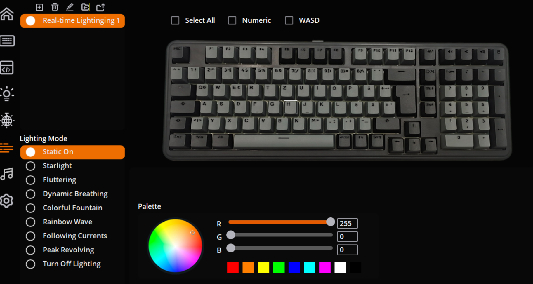 Laut Hersteller ist mit einem 8000-mAh-Akku ohne Beleuchtung eine Laufzeit von 160 Stunden möglich. Dass jemand die Tastatur komplett ohne LED nutzt, wage ich zu bezweifeln. Bei mir leuchten aktuell nur die Tasten auf, die ich auch drücke, sowie die Feedback-Beleuchtung, etwa das aktivierte Num-Pad. Die Zeit, bis die Tastatur ausgeht, lässt sich mit der Software auf eine Minute reduzieren oder auf 30 Minuten erhöhen; standardmäßig sind es fünf Minuten. Letztendlich musste ich die Tastatur in zwei Wochen Dauernutzung von mehreren Stunden am Tag bisher nur einmal laden. 100 Stunden mit umfangreicher LED-Beleuchtung sollten also locker drin sein, sodass man sich hier wirklich keine Gedanken über die Laufzeit machen muss.