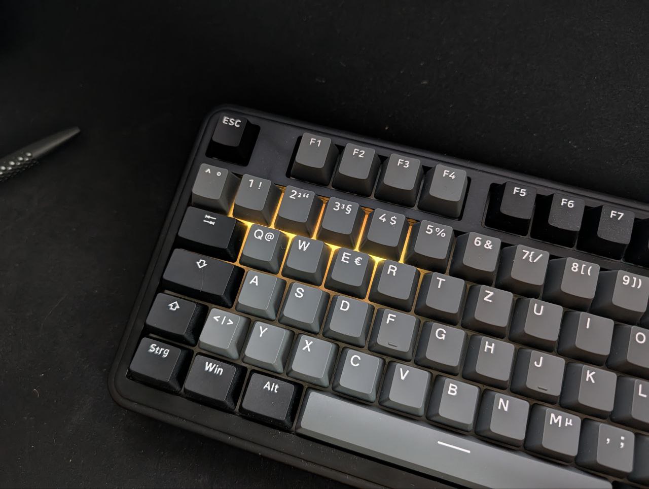 Die Tastatur verfügt über 103 Tasten, ein extra Numpad und bildet damit 96% des Standardlayouts ab. Am schwersten fiel mir die Nutzung der Entfernen-Taste. Sie befindet sich nämlich in der obersten Reihe der Tastatur. Nach drei Wochen klappte das aber auch zuverlässig. Als passionierter Counterstrike-Spieler sind natürlich auch die Tasten W, A, S, D, STRG und Leertaste extrem wichtig. Hier gewöhnte ich mich innerhalb weniger Tage an die größeren Tasten. Die vorgeschmierten Silent-Schalter sind eine Wucht und gleichzeitig auch noch angenehm leise. Epomaker gibt die Auslösekraft mit 45 ± 5 gf an, wobei Bottom-out bei 51 ± 5 gf erreicht wird. Der Vorlaufweg beträgt 1,8 ± 0,4 mm und der Gesamtweg 3,5 ± 0,4 mm. Im Vergleich zu meinen vorherigen Tastaturen und auch zu Laptop-Tastaturen ist das richtig viel, aber man erhält im Gegenzug einfach ein besseres und genaueres Feedback. Für die hier verbauten Sea-Salt-Silent-Schalter gibt Epomaker zudem eine Lebensdauer von 60.000.000 Klicks an.