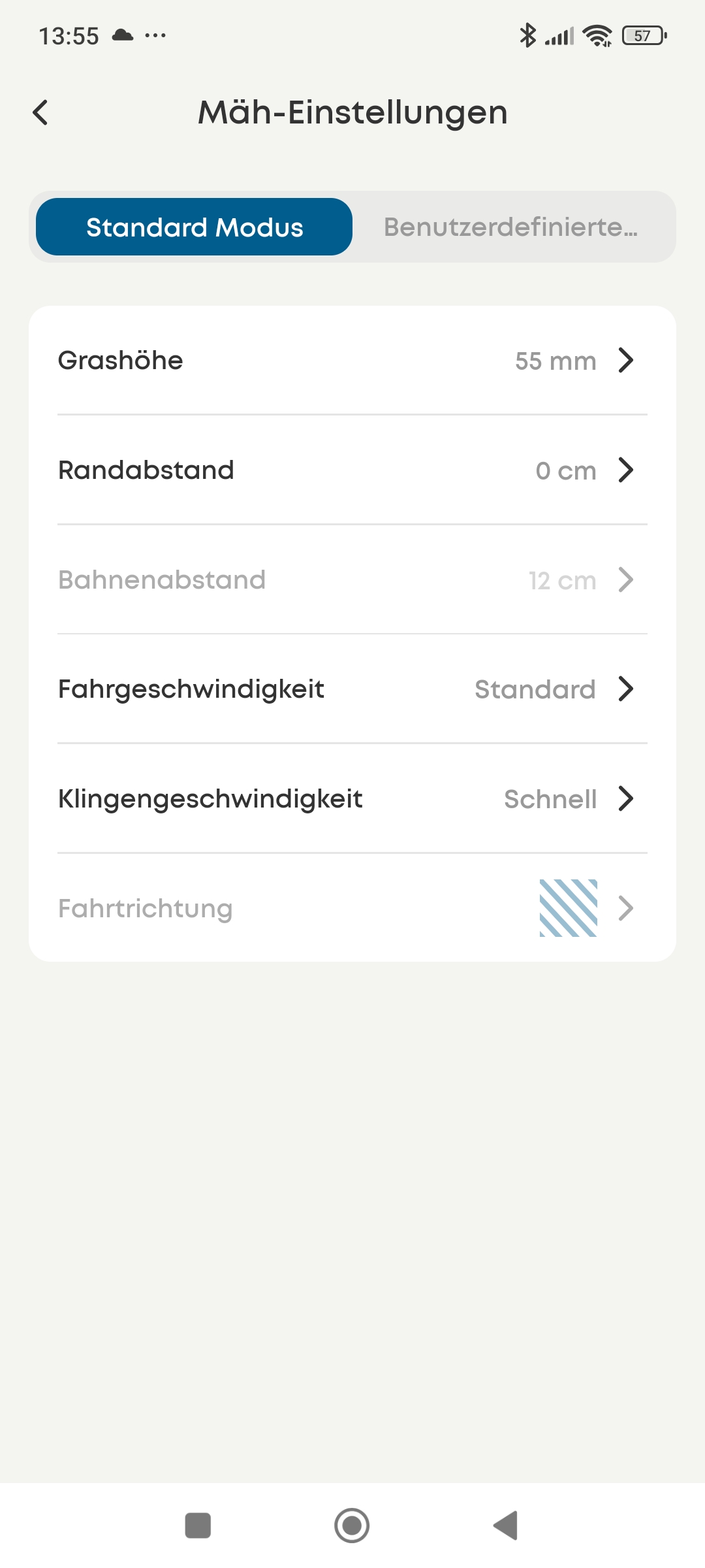 Die Einstellung des Randabstandes ermöglicht es, die Entfernung von den Rädern zur Rasenkante einzustellen. Somit kann der Eufy E15 auch so konfiguriert werden, dass Rasenbegrenzungen wie Randsteine direkt befahren werden. Eine Änderung des Bahnenabstandes führt zu einer höheren/geringeren Überlappung der Bahnen. Somit kann das Mähergebnis zu Ungunsten des Akkuverbrauches und der Schnittleistung verbessert werden. Sowohl die Fahr- als auch die Klingengeschwindigkeit beeinflussen das Schnittbild und die Flächenleistung pro Stunde. Eine hohe Klingengeschwindigkeit kann vor allem bei sehr dichtem Gras ein deutlich besseres Mähergebnis erzeugen. Unter dem Menüpunkt „Fahrtrichtung“ lässt sich die Mährichtung stufenlos in Bezug zur Basistation einstellen. Somit werden ständig gleiche Fahrtwege vermieden. Hier wäre noch ein Automatikmodus (Ändern der Richtung pro Mähauftrag) oder ein Kreuzschnitt/Schachbrettmuster wünschenswert, wie es zahlreiche andere Hersteller anbieten.