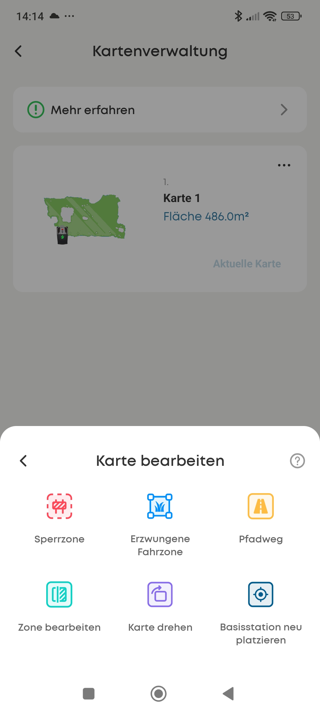 Nach erfolgreicher Installation wird der Eufy E15 mittels der Anleitung in der App hinzugefügt und in das heimische WLAN aufgenommen. Im Anschluss werden ausstehende Firmwareupdates installiert und der Kartierungsmodus gestartet. Dieser arbeitet vollständig autonom und ohne Eingreifen des Nutzers. Der Eufy agiert hier ähnlich wie ein Staubsaugerroboter und erkundet mithilfe der Kamera euren Garten. Die Kartierung wird äußerst sorgfältig durchgeführt und hat für unsere 460m² große Fläche rund eine Stunde Zeit in Anspruch genommen. Unterteilt sich eure Rasenfläche in mehrere Bereiche, die durch Wege oder Pflastersteine voneinander getrennt sind, kann ein Pfadweg zwischen den Flächen eingerichtet werden. Somit werden auch Rasenflächen erreicht, die bei der Erstkartierung nicht erfasst wurden. Die Kartenbearbeitung ermöglicht weiterhin das Erstellen von Sperrzonen und erzwungenen Fahrzonen. Zweitere sind Zonen, die normalerweise nicht als Rasenfläche erkannt wurden. Solltet ihr eure Basisstation noch einmal versetzen müssen, kann die Position manuell auf der Karte angepasst werden.