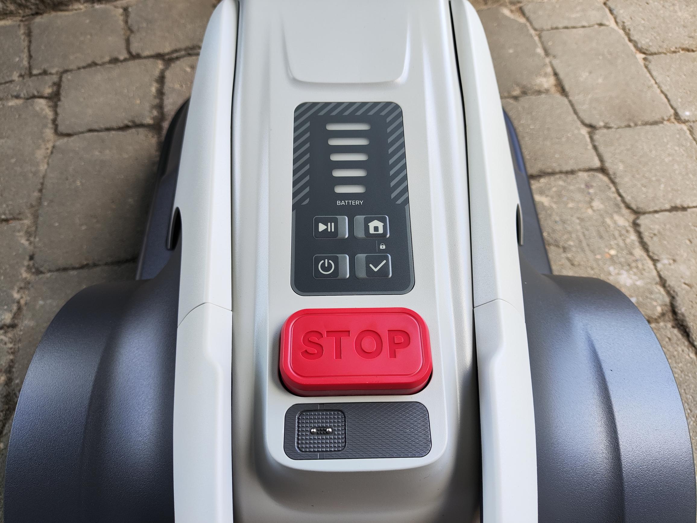 Die kräftigen Hinterräder sind mit einem Geländeprofil besetzt, das dem Eufy E15 eine Steigfähigkeit von 40% (18°) ermöglicht. Auf der Oberseite befindet sich gut sichtbar die STOP-Taste, die bei Betätigung den Roboter in Sekundenbruchteilen zum Stillstand bringt. Der darunterliegende Regensensor erkennt Niederschlag und lässt den Eufy selbstständig zur Ladestation zurückfahren. Das darüberliegende Bedienfeld bietet eine 5-Balken-Akkuanzeige und kann für die grundlegende Bedienung des E15 verwendet werden. Mithilfe der Tasten kann das Mähprogramm gestartet/pausiert, die Ladestation angefahren oder der Roboter aus/angeschaltet werden.
