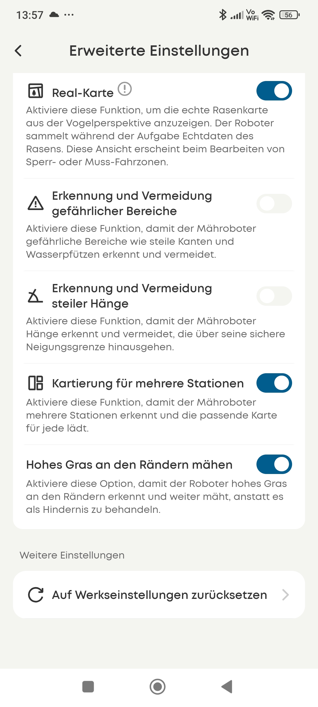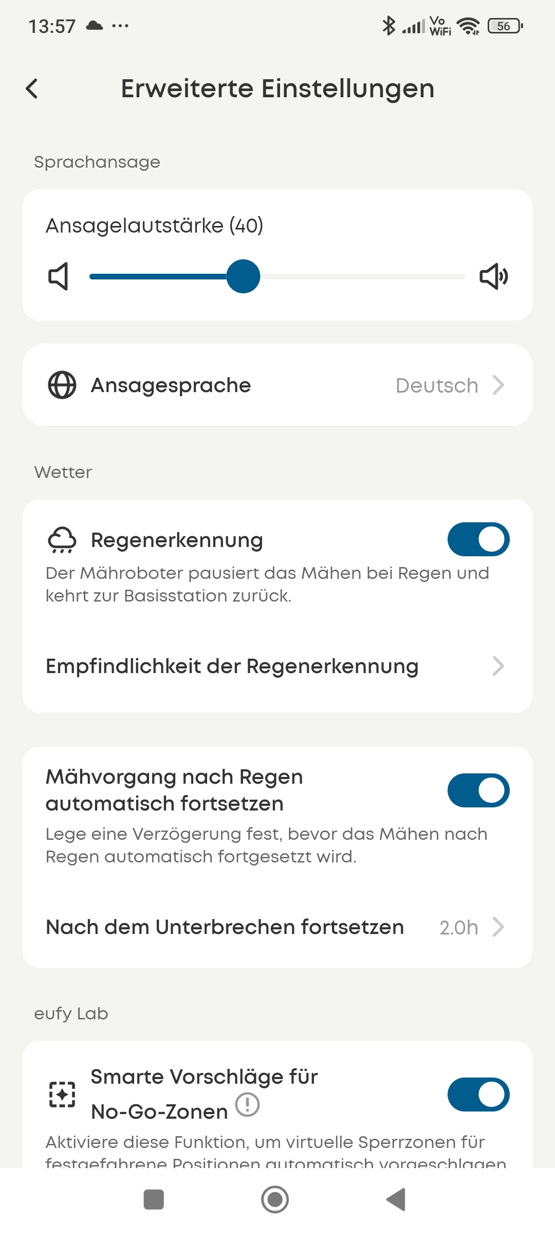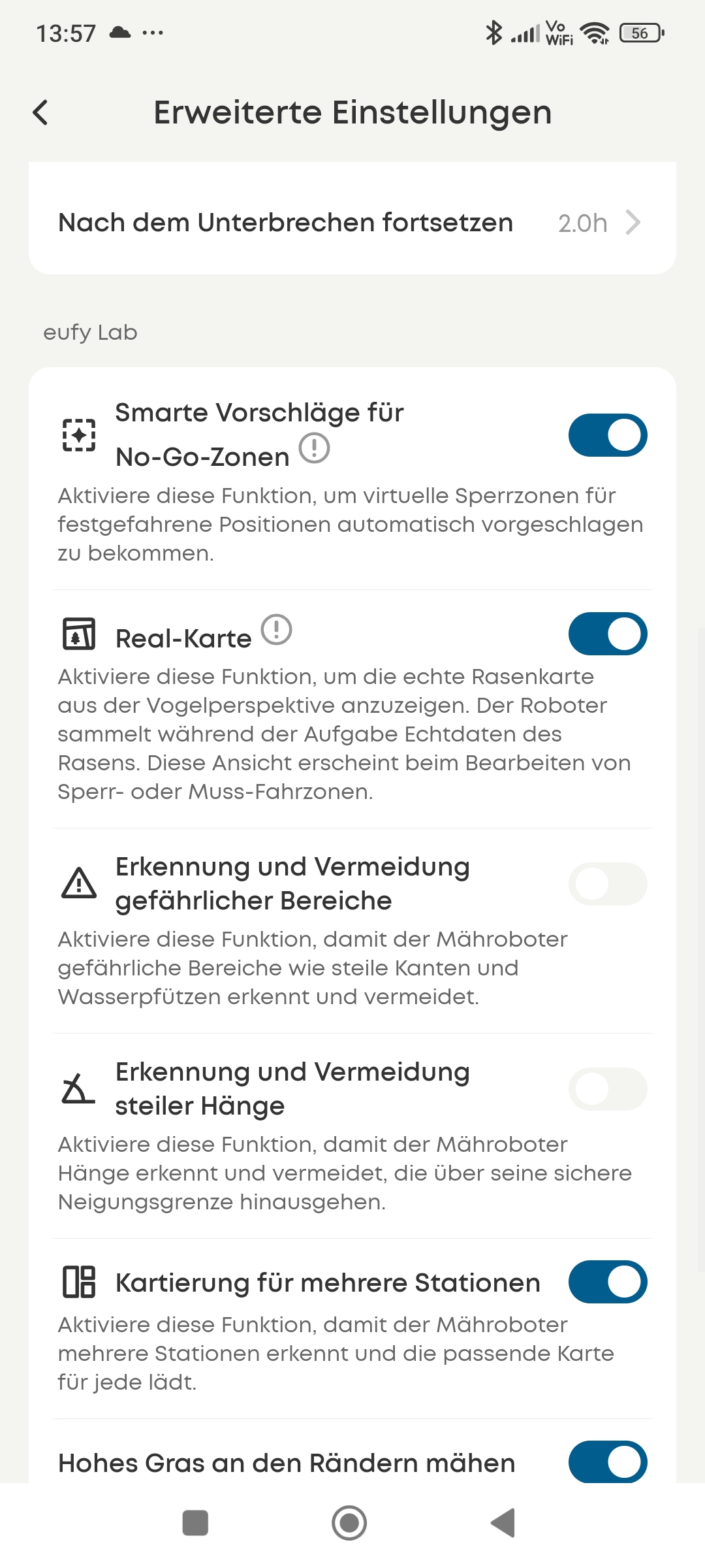 Angesichts der angebotenen Funktionen empfiehlt es sich, dass der Nutzer diese je nach Situation schrittweise ausprobiert. Vor allem die smarte Erkennung von gefährlichen Bereichen und die Vorschläge für No-Go-Zonen können hilfreich sein, um ein Festfahren des Roboters zu verhindern. Zusammenfassend bietet die Eufy App einen ausgesprochen hohen Funktionsumfang, der es erlaubt, den E15 an nahezu jede Rasenfläche anzupassen. Zudem ist die App optisch ansprechend und intuitiv zu bedienen.