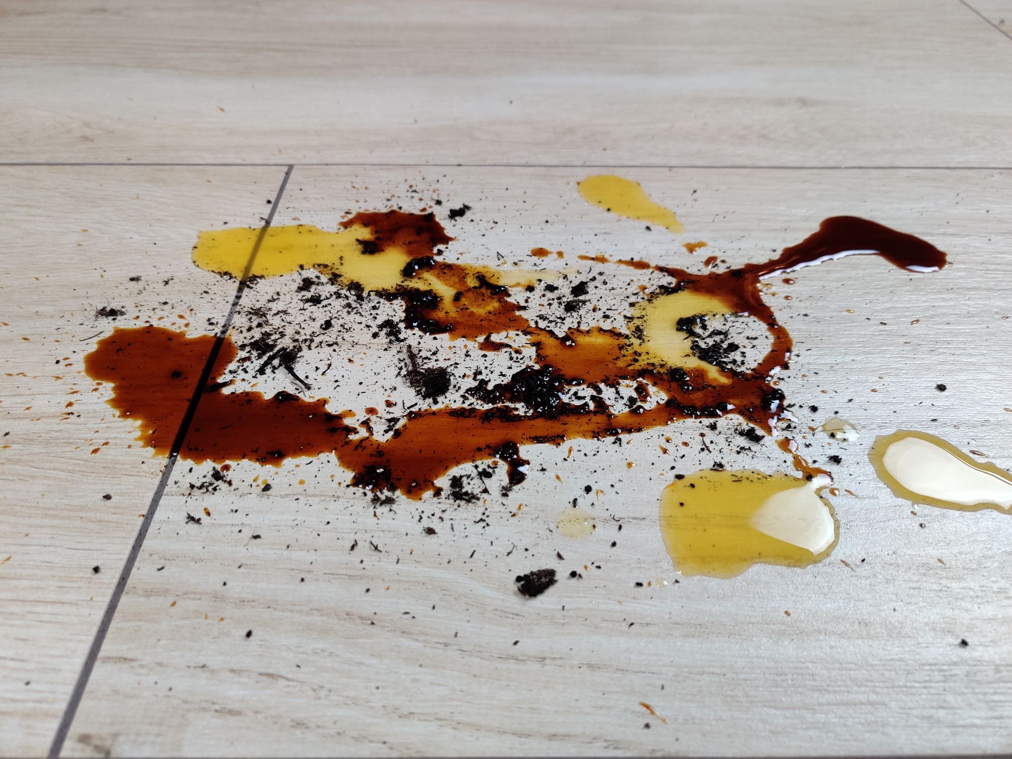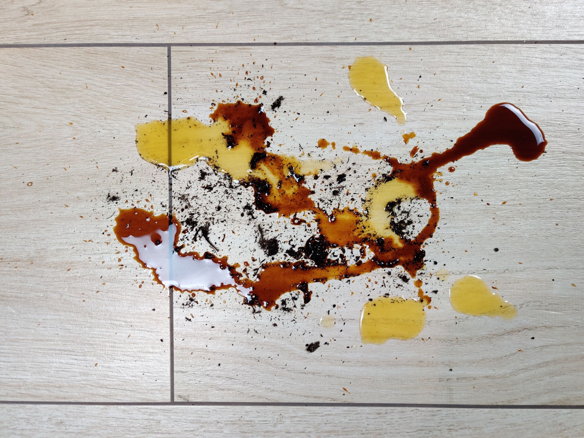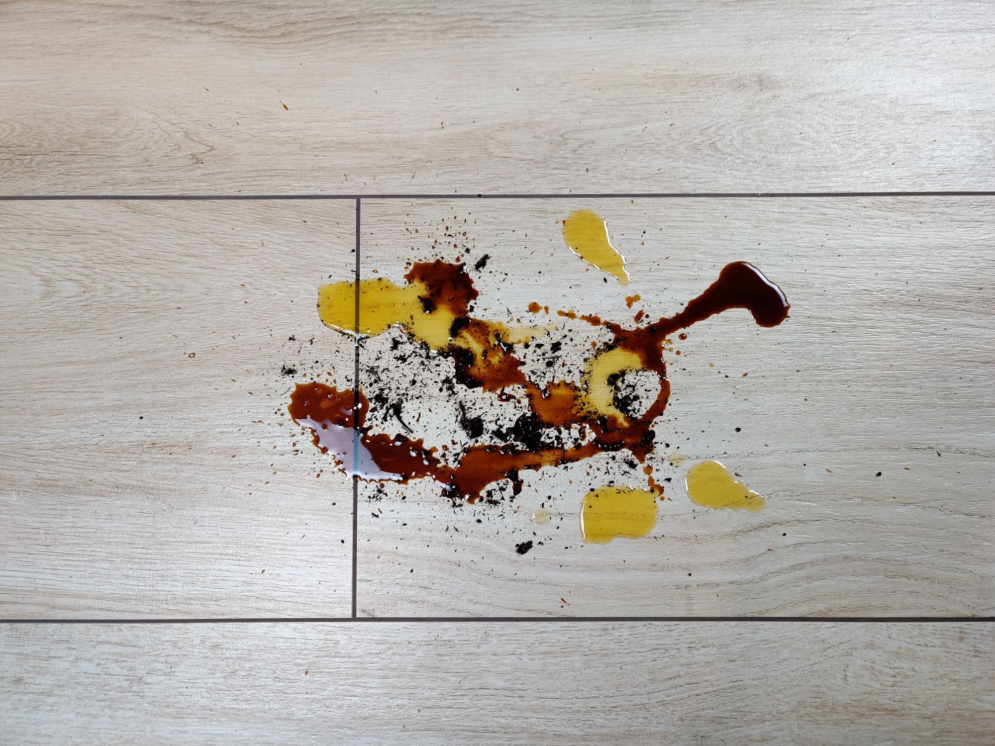 Ebenfalls keine Blöße gibt sich der Mach V1 Ultra beim Nasswischen. Im Testversuch mussten frisch ausgekippte Sojasoße, Orangensaft und feuchte Erde herhalten. Deutlich zu erkennen ist, dass alle 3 Substanzen optimal entfernt wurden und das sogar ohne mehrfach über den betreffenden Bereich fahren zu müssen. Was auf den Bildern allerdings nicht zu sehen ist, dass ein leichter matter Film auf dem Boden verblieben ist. Das war nicht nur ein optischer Effekt, sondern äußerte sich mit einer gewissen Klebrigkeit des Bodens. Somit musste die Stelle entsprechend im Nachgang nochmals gereinigt werden. Keinen Vorwurf an dieser Stelle, denn wie dem Mach V1 Ultra erging es im Test auch vielen Saugern mit Wischfunktion von anderen Herstellern.