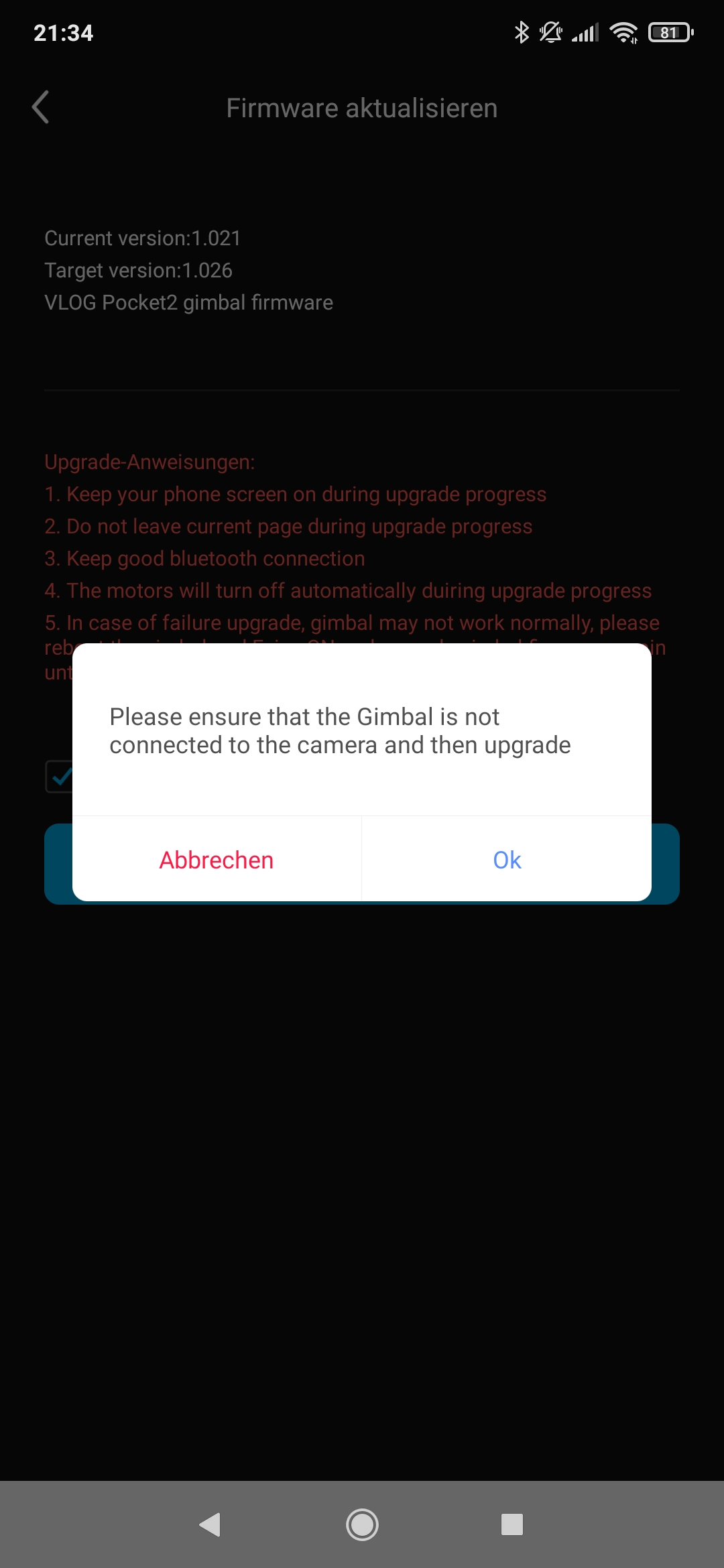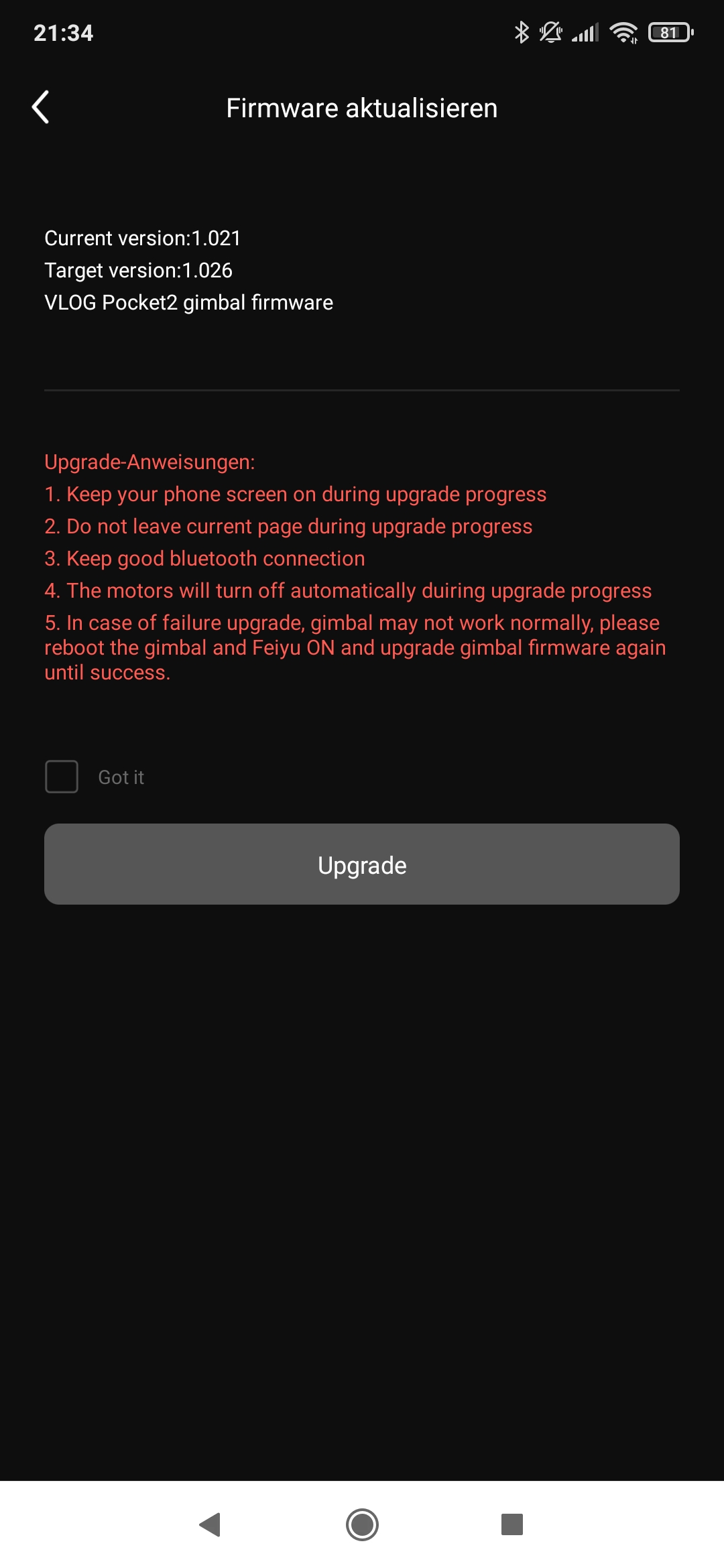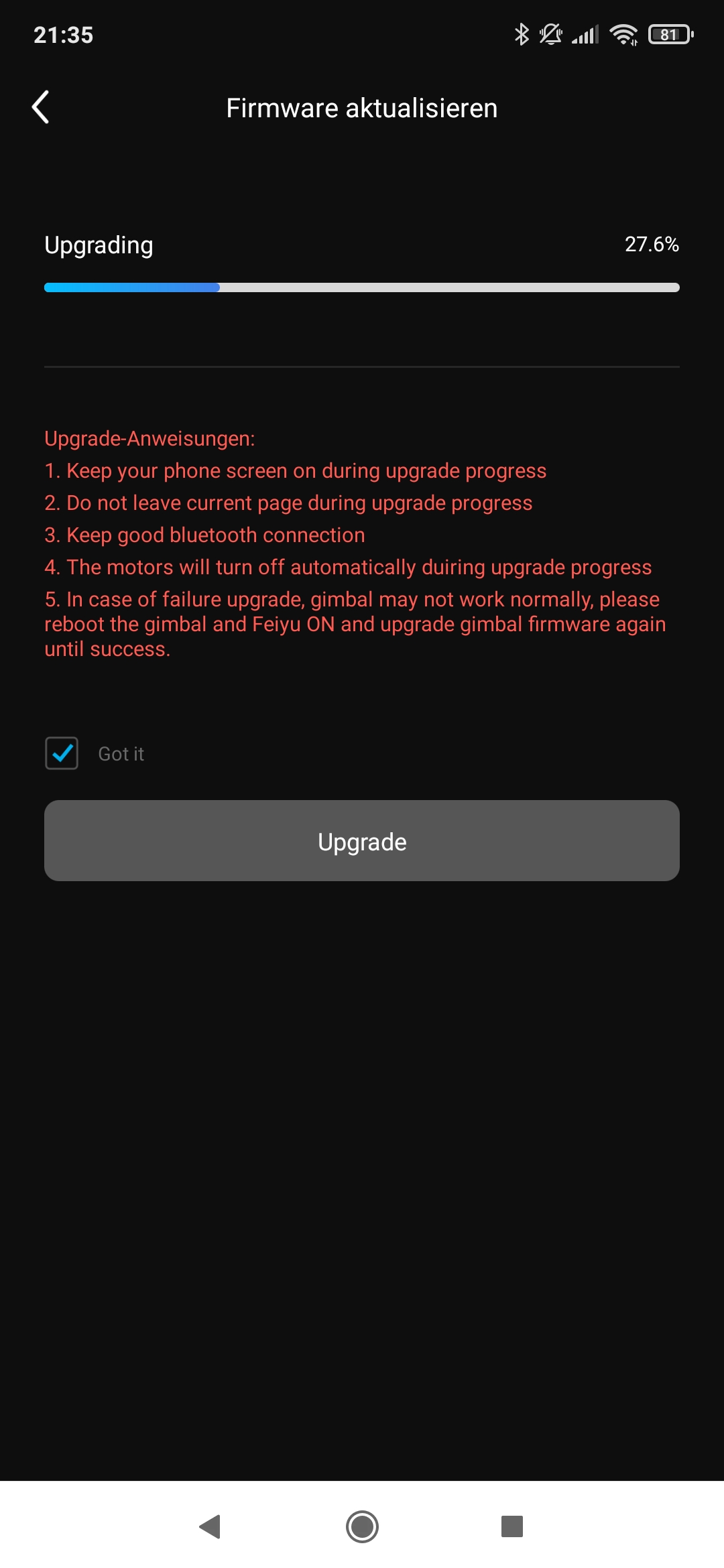 Das wirklich positive an der App des Herstellers ist, dass sie einen sehr großen Funktionsumfang besitzt und über zahlreiche Sprachen verfügt. Nett sind zudem die direkt aufrufbaren Tutorial Videos. Leider empfinde ich sie aber als etwas zu unübersichtlich und überladen. Nach ausführlicher Nutzung von Gimbal samt App, muss ich aber tatsächlich den eingangs erwähnten Negativbewertungen zustimmen. Die App scheint hier und da noch an diversen Kinderkrankheiten zu leiden. Fragwürdig hingegen ist auch, warum ich ein und das selbe Firmware Update unbegrenzt oft installieren kann? Das größte Problem sind aber tatsächlich die völlig wahrlosen Verbindungsabbrüche zwischen Gimbal und App. In solchen Fällen hilft nur das Ein- und Ausschalten des Gimbals zuzüglich Neuverbindung. Außerdem ist mir aufgefallen, dass sich jedes meiner Smartphones spürbar bei der Appnutzung erwärmt.