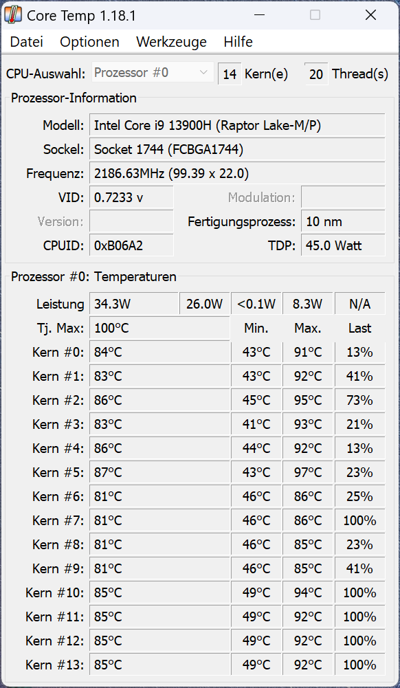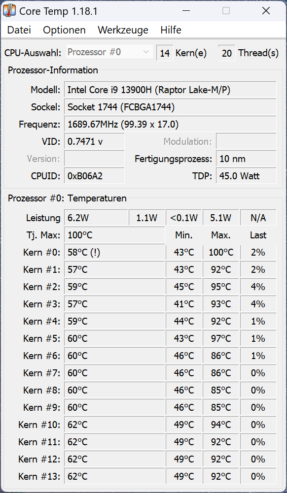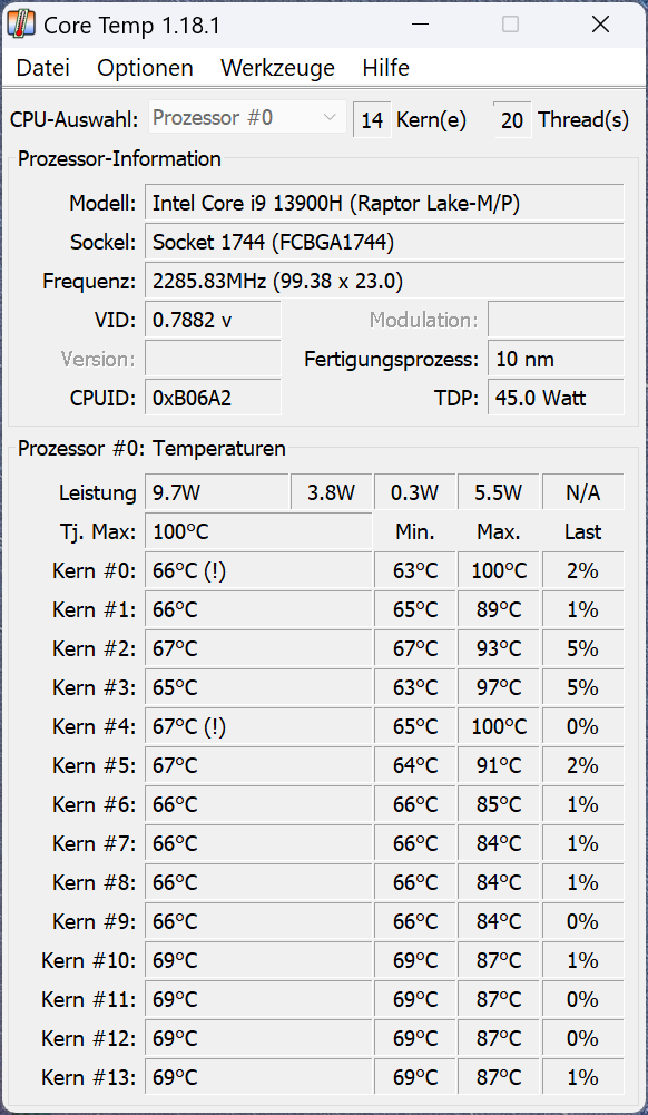 CPU-Z gibt einen guten Überblick über die grundlegenden Funktionen und Intels Datenbank zeigt eine Leistungsspezifikation als Mobilprozessor mit 45W. Diese werde gerne überschritten, solange gewisse Parameter stimmen. Bis zu 115 W darf sich die CPU genehmigen. Aufgrund der begrenzten Kühlung werden diese Werte aber nie erreicht.