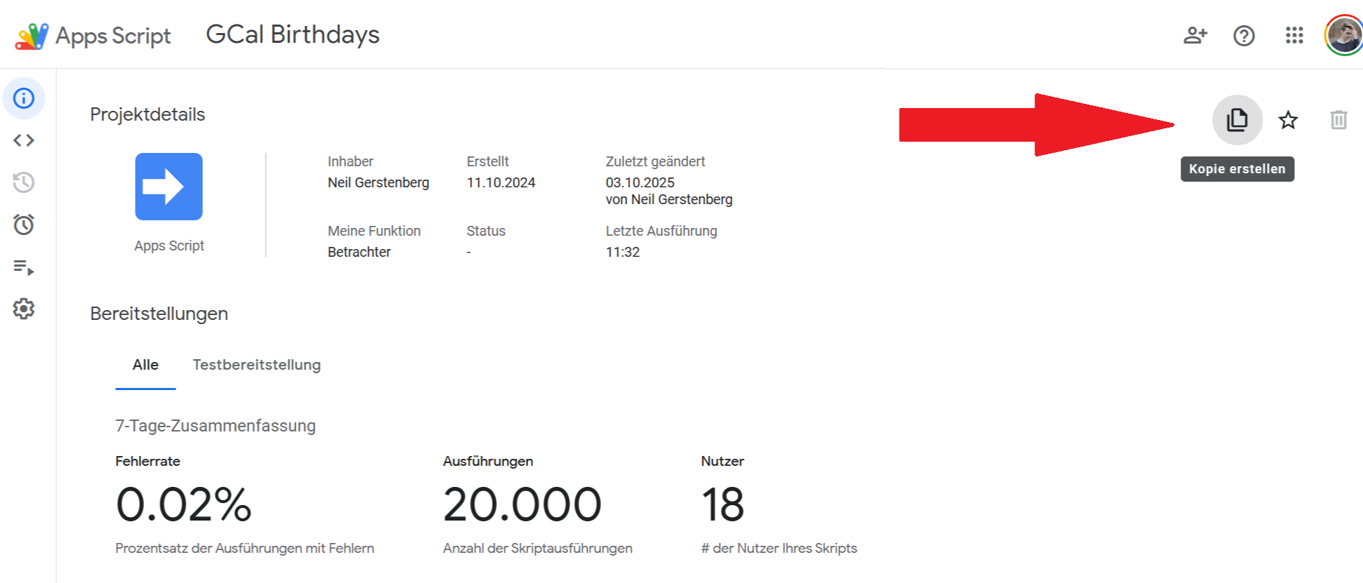 Öffnet das Skript-Projekt (Link im Video unten oder hier: Google Apps Script). Klickt oben links auf das Info-Symbol (i) und wählt oben rechts “Kopie erstellen”. Nun liegt das Skript in eurem Google Drive und ist eure eigene Kopie.