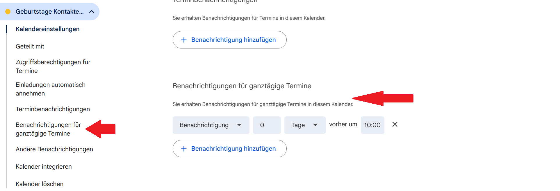 Sucht den Punkt “Benachrichtigungen für ganztägige Termine”.