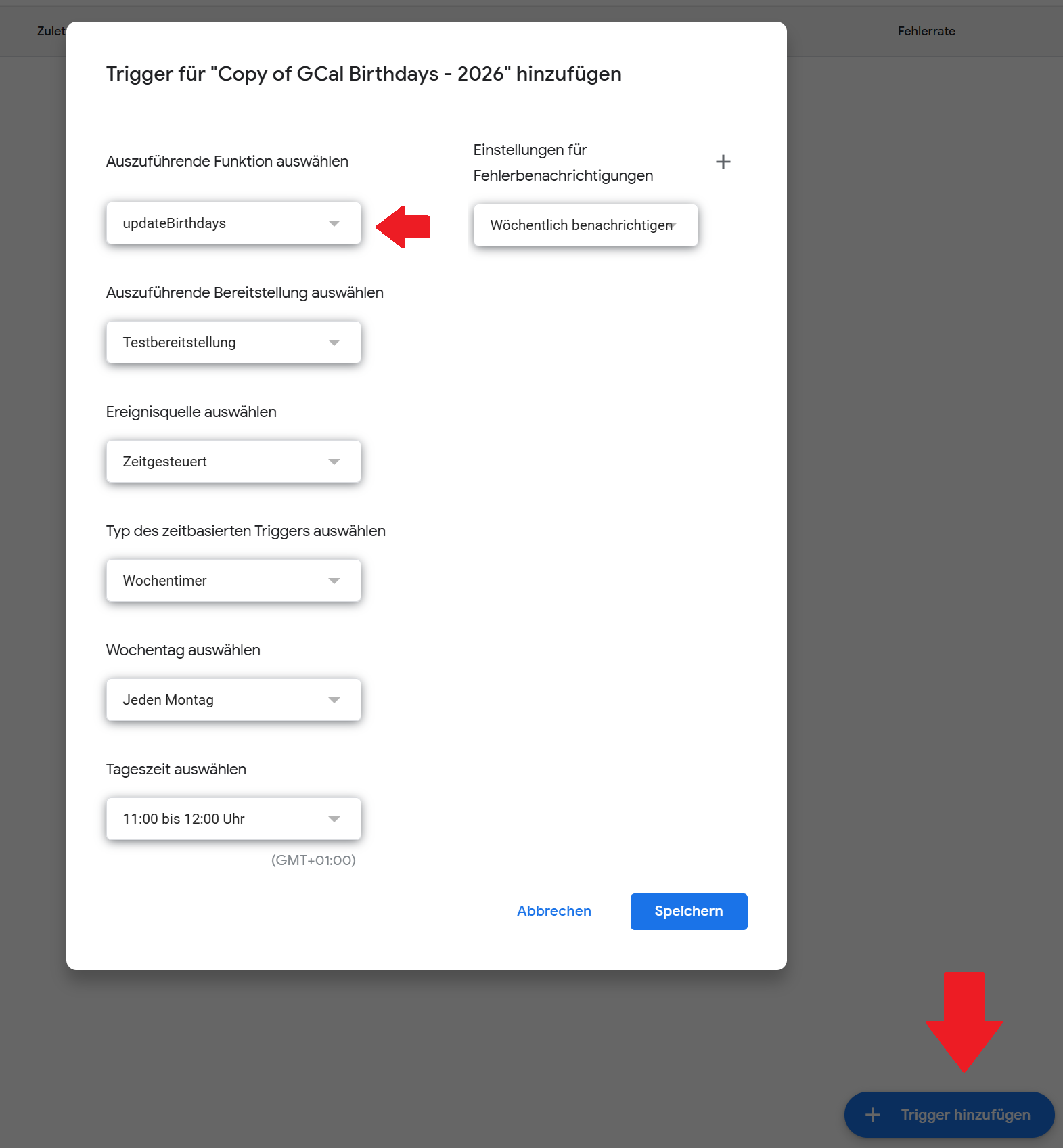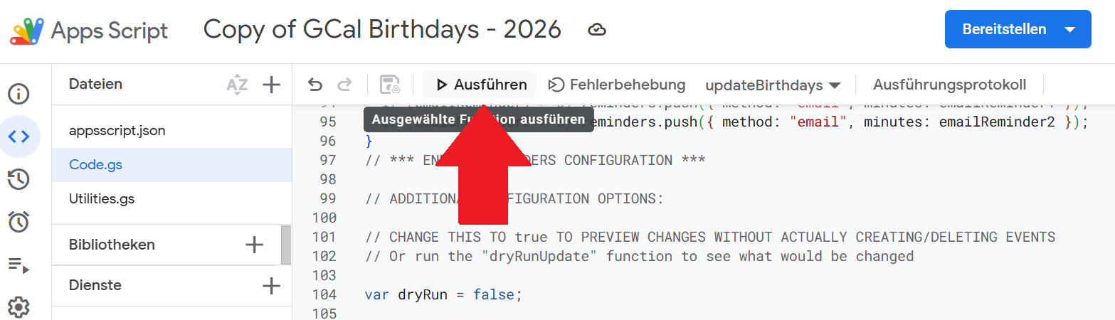 Wählt oben im Dropdown-Menü updateBirthdays aus und klickt auf “Ausführen”.