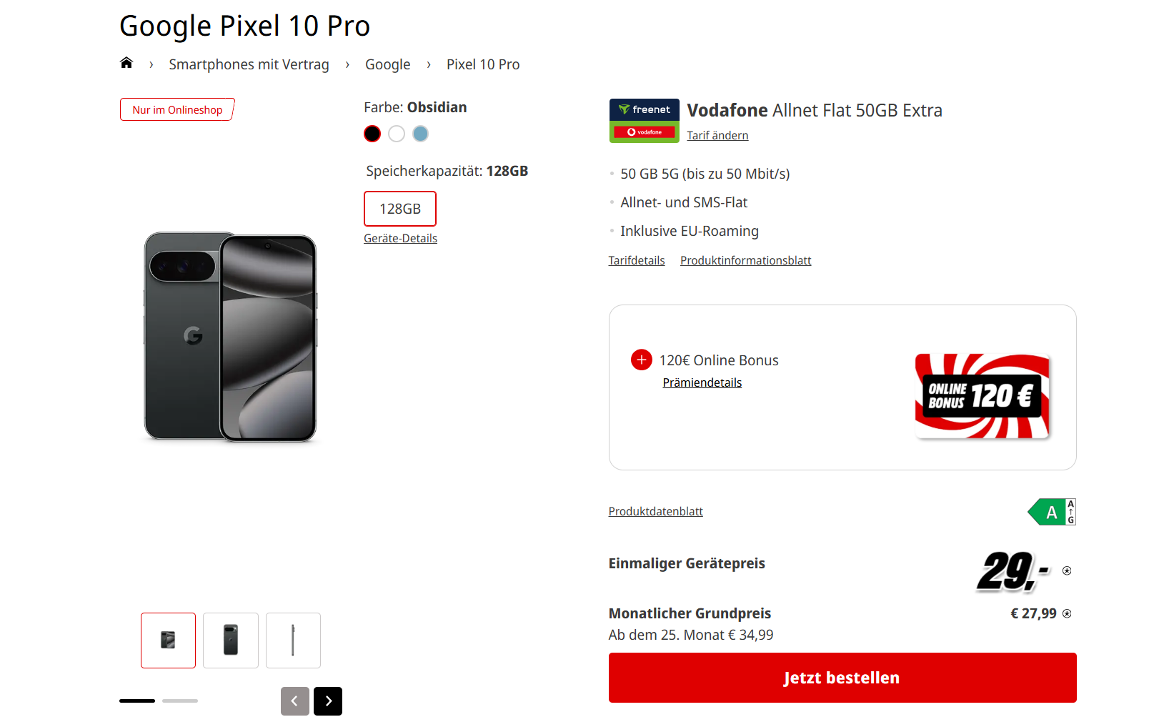 In der MediaMarkt-Tarifwelt laufen momentan die Karnevalsangebote und einen der besten Vertragsdeals gibt es für das Google Pixel 10 Pro (zum Test). Inklusive 50GB-Tarif im Netz von Vodafone zahlt ihr 627€ und damit weniger als den Vergleichspreis nur für das Telefon.