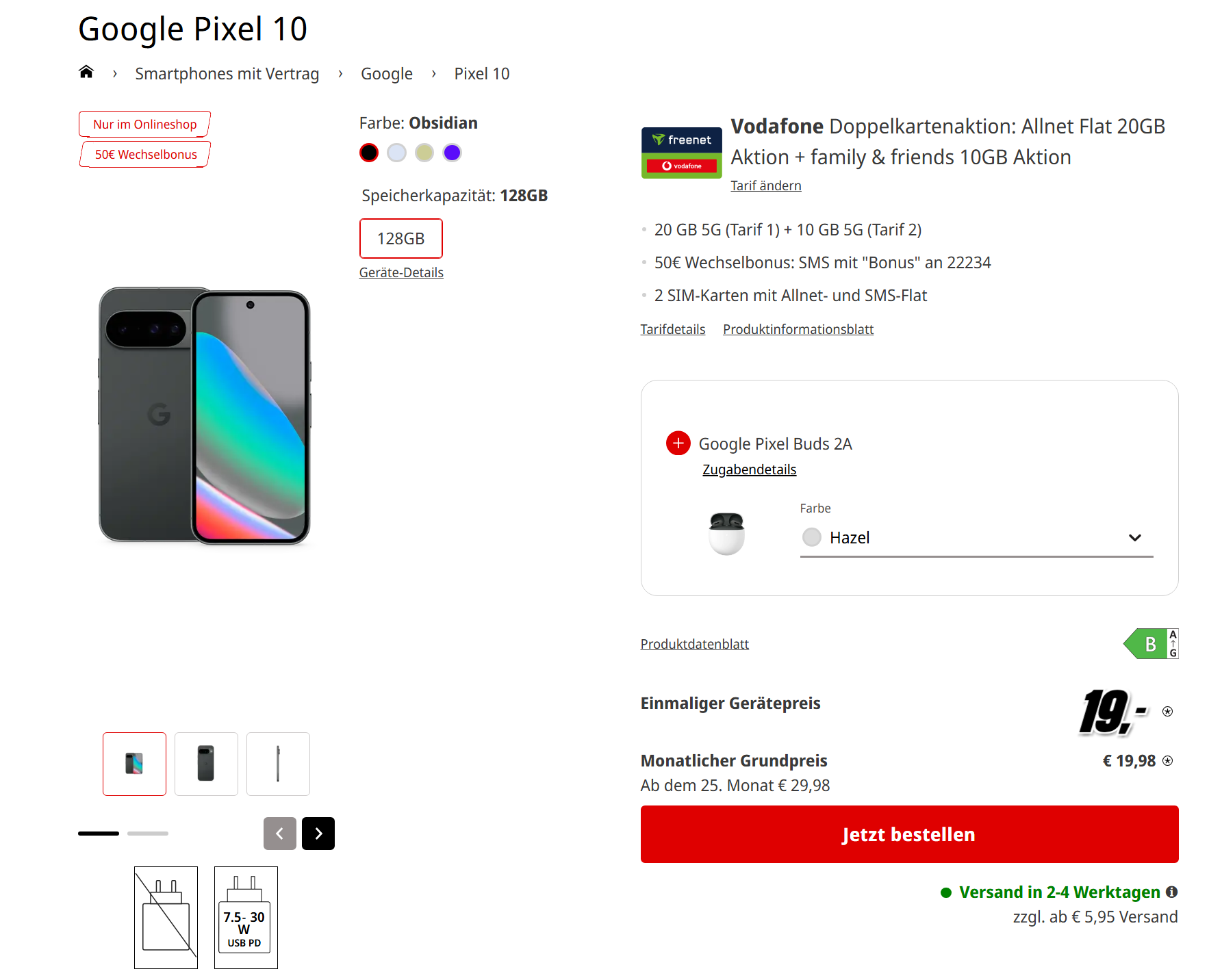 Google Pixel 10 + Pixel Buds 2a mit 20+10GB Vodafone Vertrag für 494€