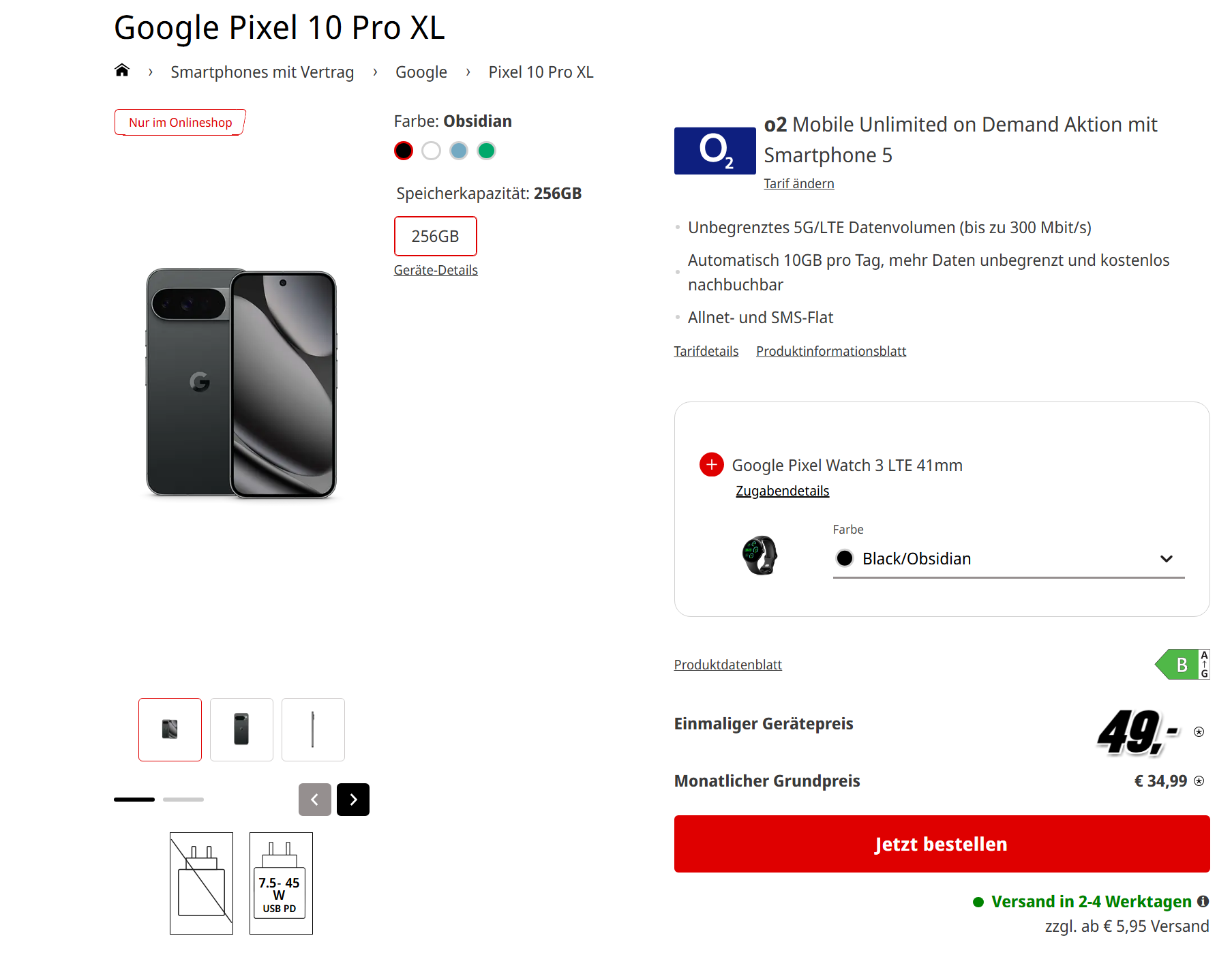 Google Pixel 10 Pro XL 256GB + Google Pixel Watch 3 LTE 41mm + Unlimited on Demand O2 Vertrag für 935€
