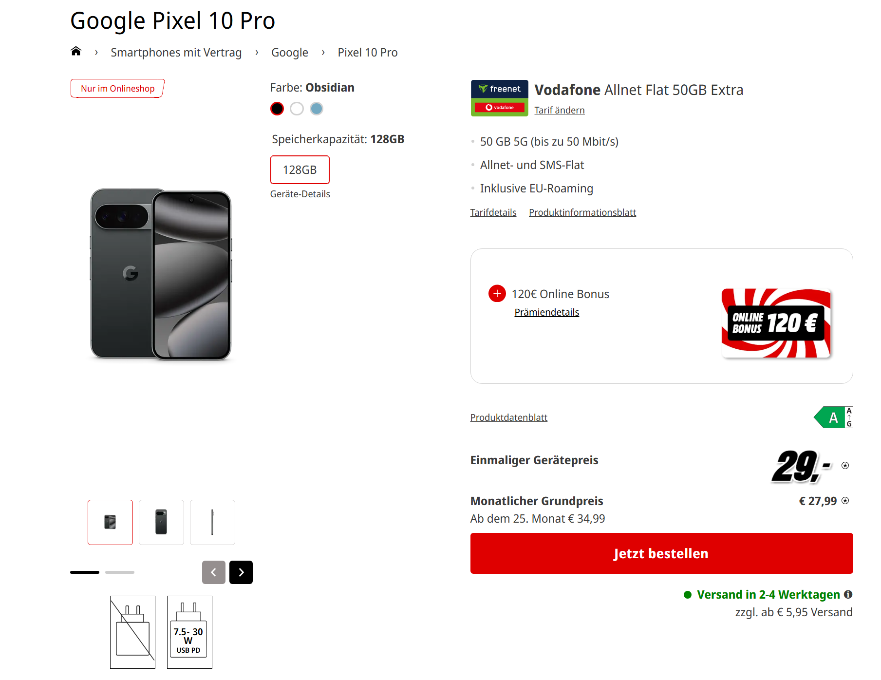 Google Pixel 10 Pro 128GB + 50GB Vodafone Vertrag für 627€
