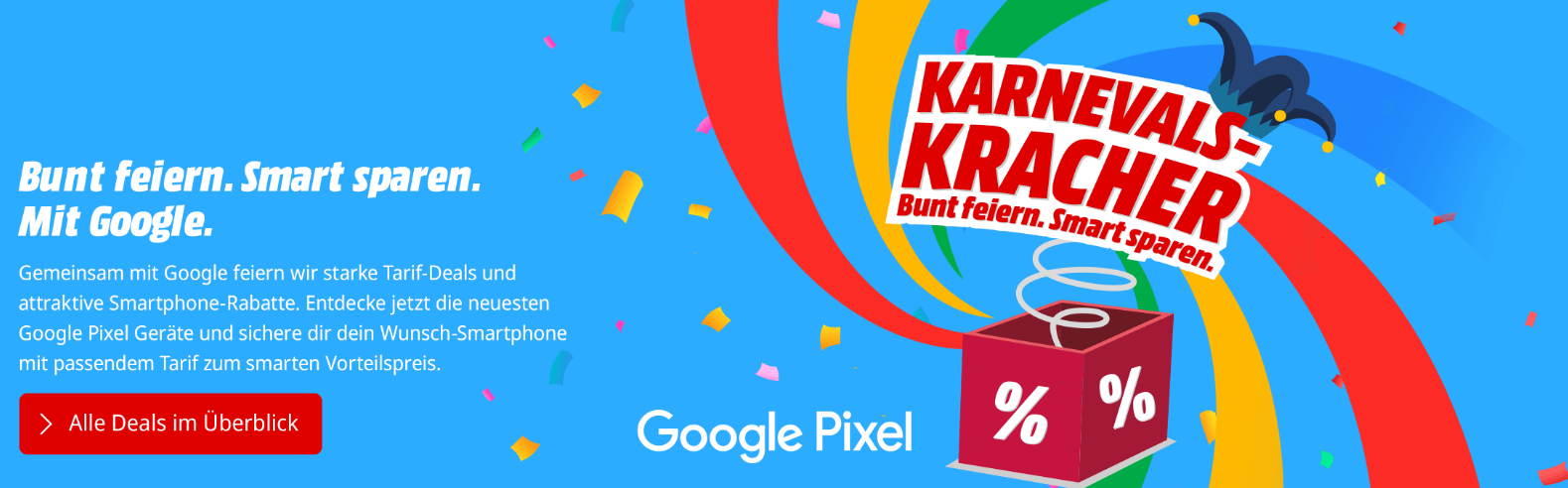 Wie erwartet feiert die MediaMarkt Tarifwelt auch 2026 Karneval und liefert einige Tarif-Bundles zu Top-Preisen. Dieses Jahr steht besonders Google mit der frischen Pixel 10 Serie im Fokus. Spannende Deals mit effektiv kostenlosen Verträgen gibt es für das Pixel 10 und Pixel 10 Pro. Auch das Pixel 10 Pro XL ist in Kombination mit der beliebten Pixel Watch 3 LTE zum Top-Preis im Angebot. Die Faschingspromo der Tarifwelt läuft bis einschließlich 24. Februar. Einzelne Deals können jedoch vorzeitig vergriffen sein, während neue Angebote folgen.