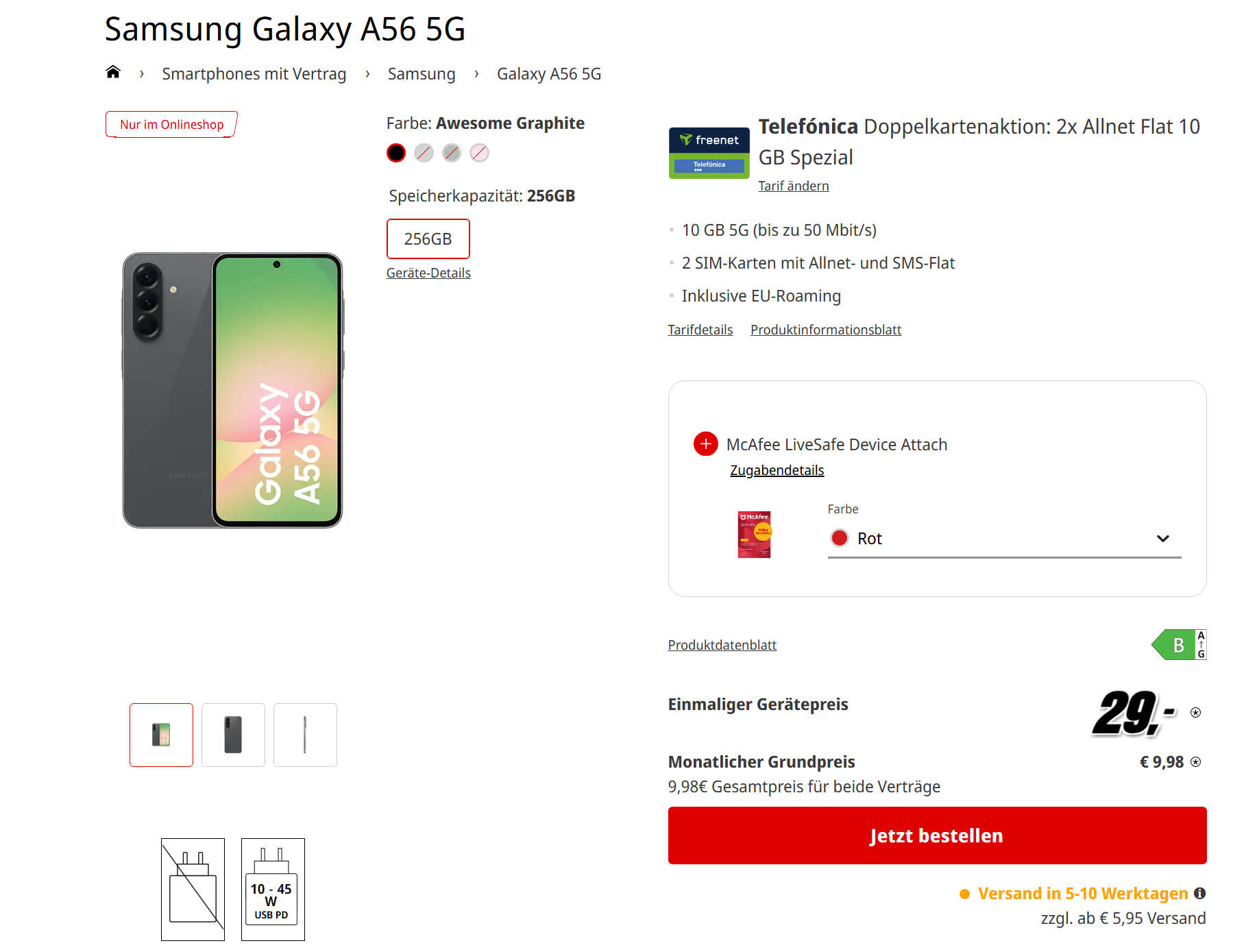 Auch Samsungs beliebtes Mittelklasse-Smartphone Galaxy A56 ist im Rahmen der MediaMarkt Karnevals-Kracher mit gleich zwei Verträgen erhältlich. Auch in diesem Fall liegen die Gesamtkosten für Smartphone und Verträge deutlich unter dem Einzelpreis von 320€ laut idealo.de. Wenn ihr also ein solides Mittelklasse-Smartphone und zwei 10GB 5G Verträge sucht, seid ihr hier goldrichtig.