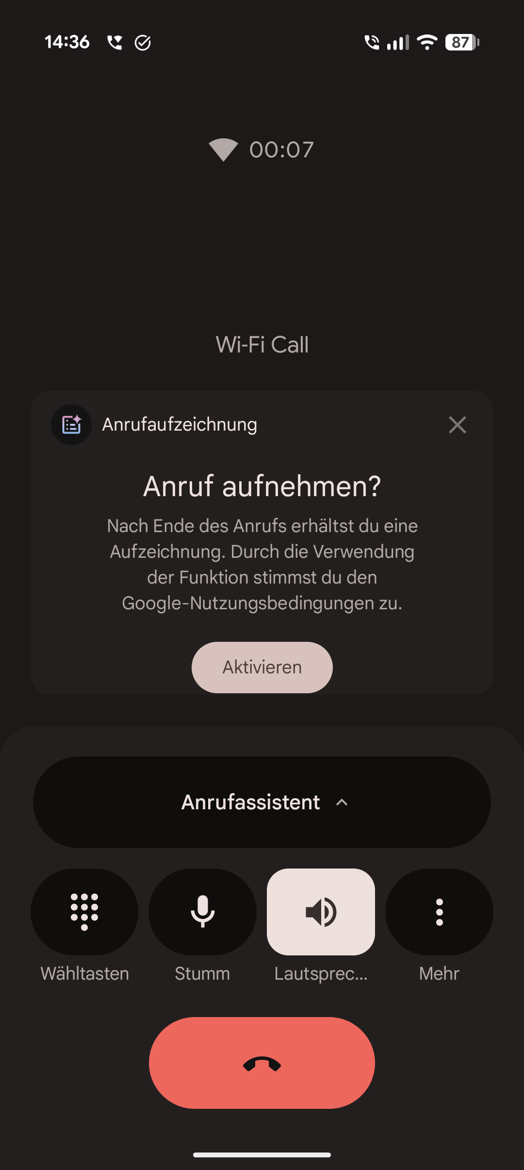 Während eines Telefonats könnt ihr nun auf „Anrufassistent“ klicken. Dort könnt ihr die Aufzeichnung starten, was mit einem kurzen Hinweiston und einer Sprachansage für beide Gesprächspartner verbunden ist. Sobald ihr die Aufzeichnung beendet, wird auch das per Sprachansage kommuniziert. Die Audiodatei wird als WAVE gespeichert und kann ganz einfach abgehört, gelöscht oder geteilt werden.