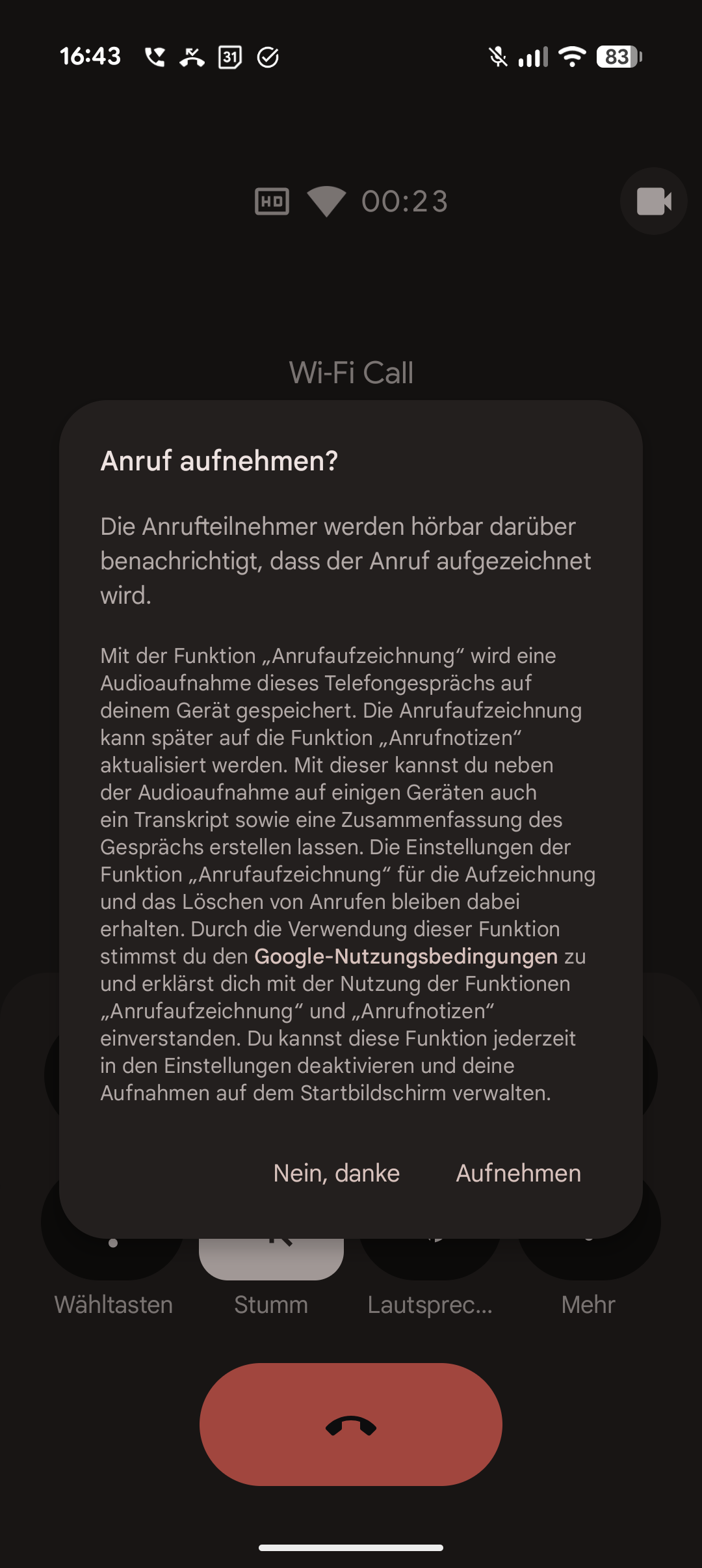 Die Anrufaufzeichnung finde ich ebenfalls interessant, auch wenn ich aktuell nicht wüsste, wann ich sie einsetzen würde, vor allem auch aufgrund der Gesetzeslage in Deutschland. Im Strafgesetzbuch steht nämlich, dass mit Geldstrafe oder Freiheitsstrafe von bis zu drei Jahren geahndet wird, wenn unbefugt „das nichtöffentlich gesprochene Wort eines anderen auf einen Tonträger“ aufgenommen wird. Der Gesprächspartner muss der Aufzeichnung also explizit zustimmen.
