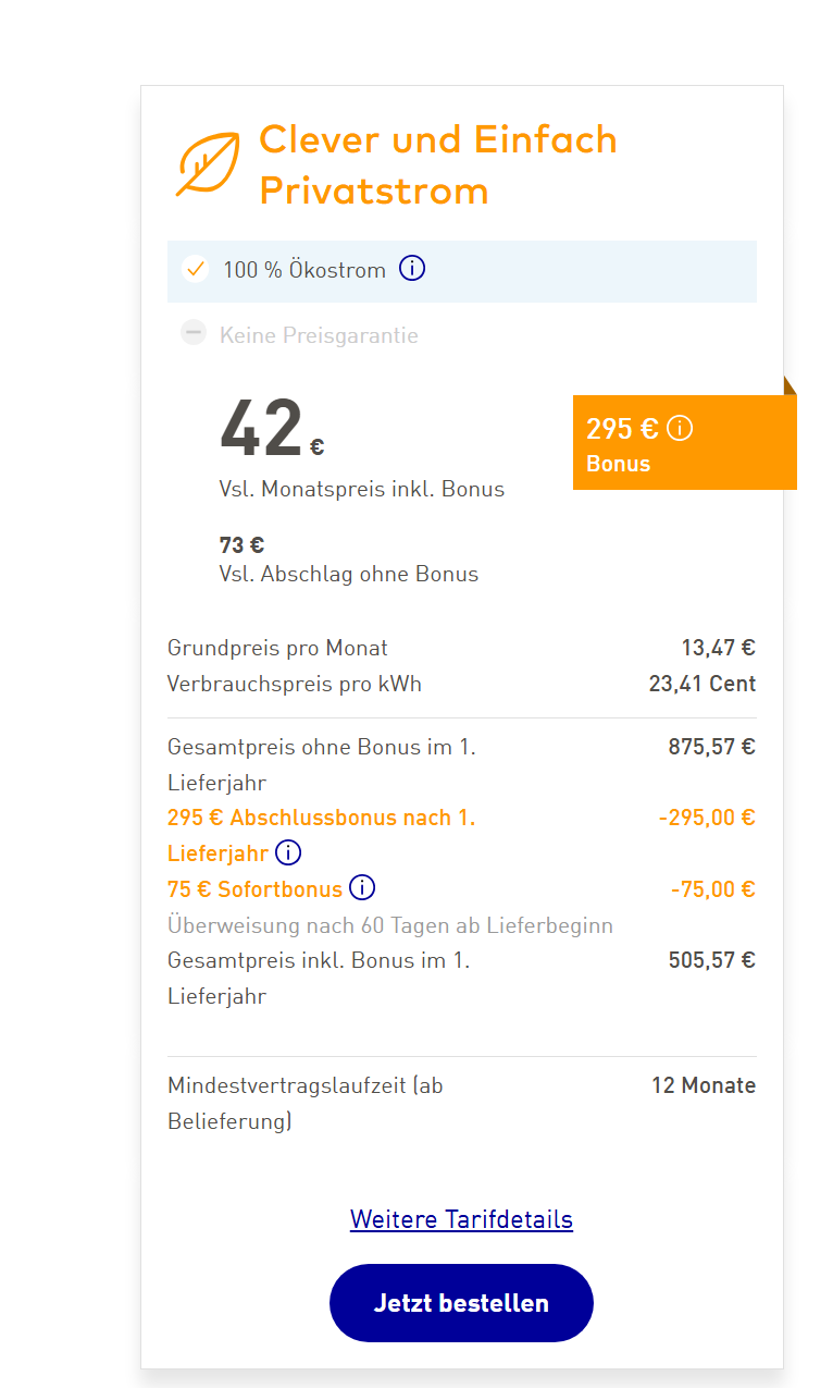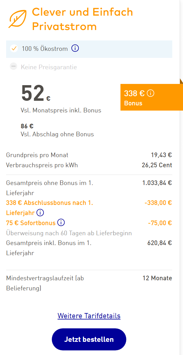 Das sorgt bei mir in Oberbayern (84XXX) für etwa effektive 16 Cent pro kWh bei einem Verbrauch von 3000kWh. Auch für meine Familie im Saarland (66XXX) habe ich das geprüft; auch dort sind es durch den hohen Bonus nur 23 Cent pro kWh. Auch Köln (50XXX) ist mit 20 Cent pro kWh sehr gut. Die attraktiven Preise kommen durch Gesamtboni von teils über 400€ zustande. Das Angebot richtet sich nur an Neukunden, es darf die letzten 6 Monate also kein EnBW-Vertrag an eurem Zähler bestanden haben. Ansonsten probiert einfach euer Glück mit der PLZ und votet das Angebot gerne nach oben, wenn ihr öfter solche Deals sehen wollt!