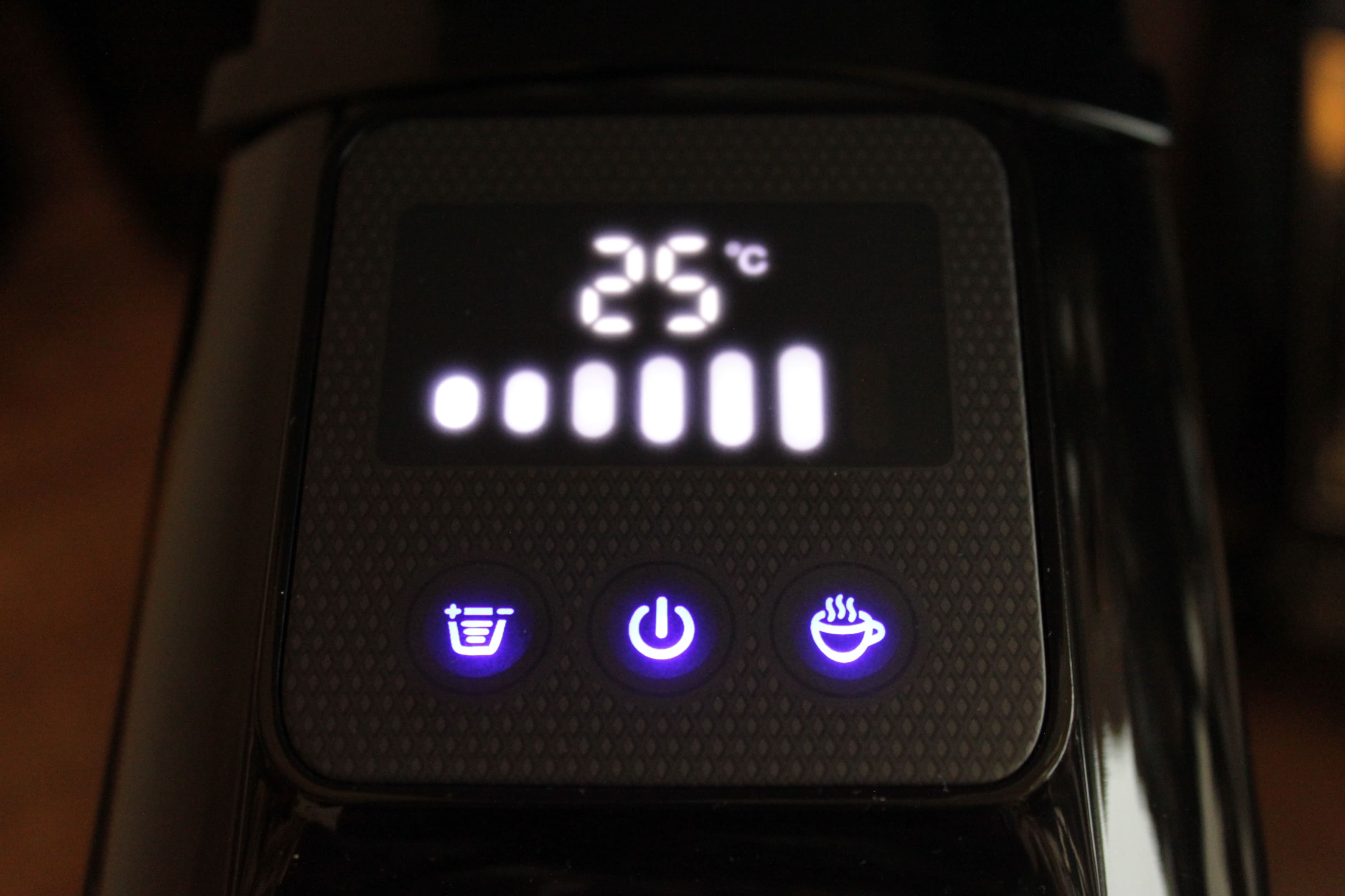 Die H2C merkt sich dabei das zuletzt verwendete Programm. So genügt nach dem Einschalten ein einfacher Fingertipp für den nächsten Bezug. Die Anpassung der Wassermenge erfolgt ebenfalls schnell, wenn auch mit einer leichten Verzögerung (~0,5 Sekunden), was bei hastigem Tippen zu Fehleingaben führen kann.