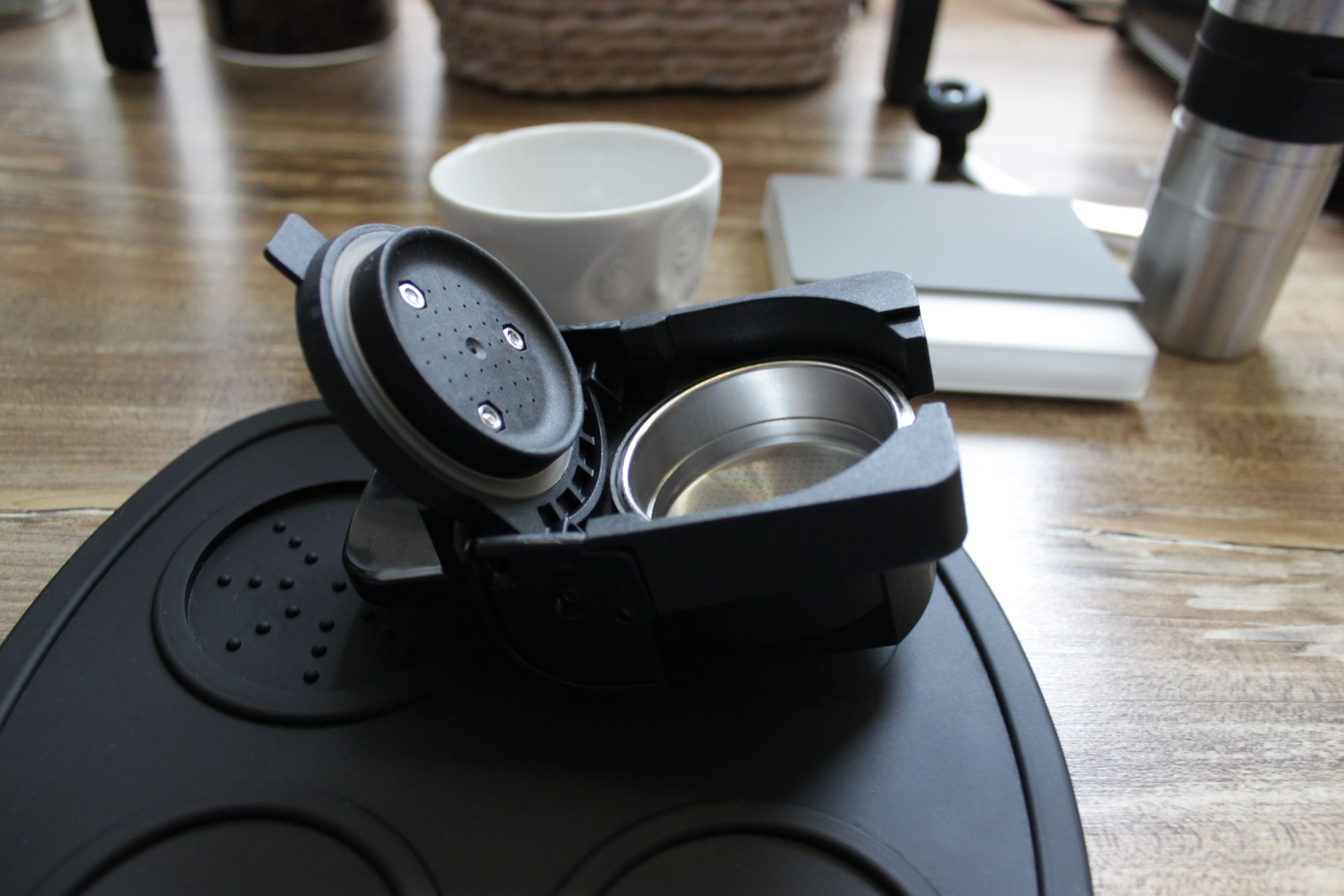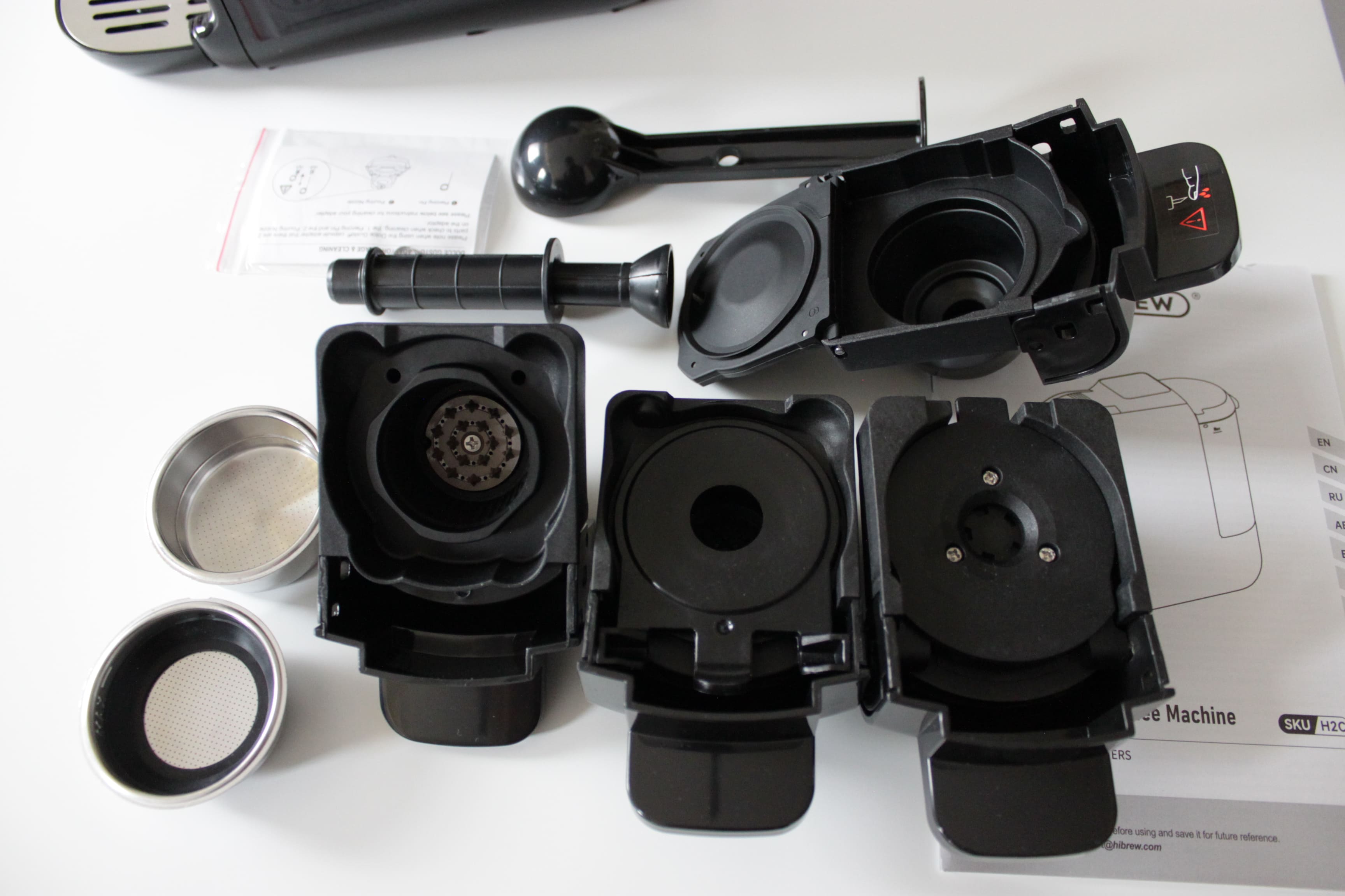 Die H2C wird mit einem angemessenen Zubehörpaket geliefert: fünf Adapter, ein einfacher Plastik-Tamper, Handbuch und eine kleine Wasserspritze. Die Adapter ermöglichen die Nutzung von Pads, gemahlenem Kaffee, Lavazza-, Dolce-Gusto– und Nespresso-Kapseln.
