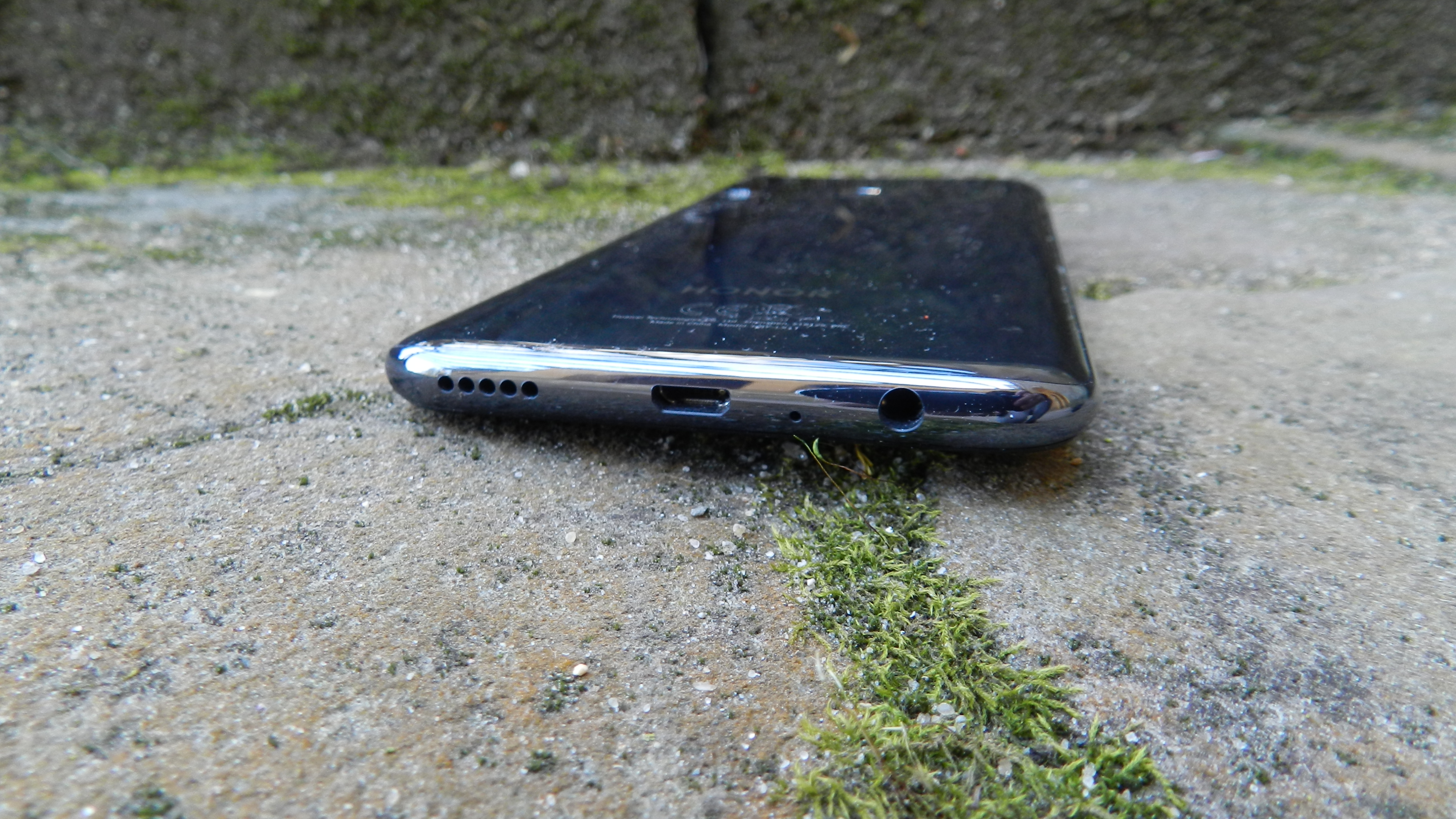Der SIM-Karten Schub befindet sich auf der Oberseite. Vorsicht! Neben dem Sim-Tray befindet sich direkt eine Mikrofonöffnung. Nicht, dass ihr darin herumstochert und 180 Puls bekommt, weil der Sim-Kartenhalter nicht herauskommt :). Die linke Seite ist vogelfrei. Rechts sind Volume-Wippe und Power Button untergebracht, die zwar einen tollen Druckpunkt haben, aber vor allem Letzterer hat ein relativ großes Spiel. Unterhalb sind neben der Mono-Lautsprecheröffnung, noch Mikrofon-Loch, erfreulicher Weise ein Headphone Jack und ein Micro USB-Port zum Laden des Honor 20 Lite zu finden. Einen veralteten Mirco-USB Anschluss will ich 2020 eigentlich nicht mehr sehen! Bei keinem Hersteller!