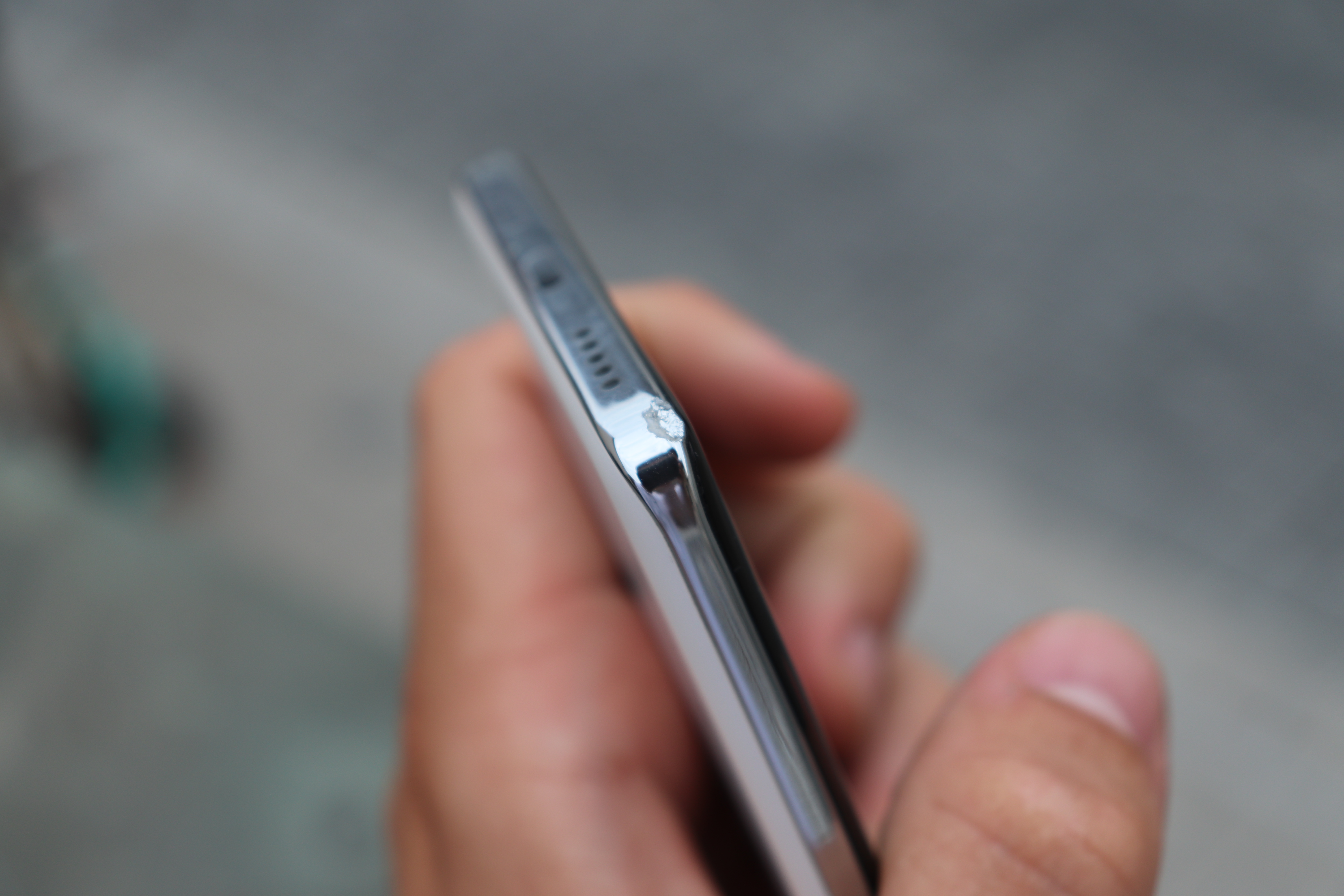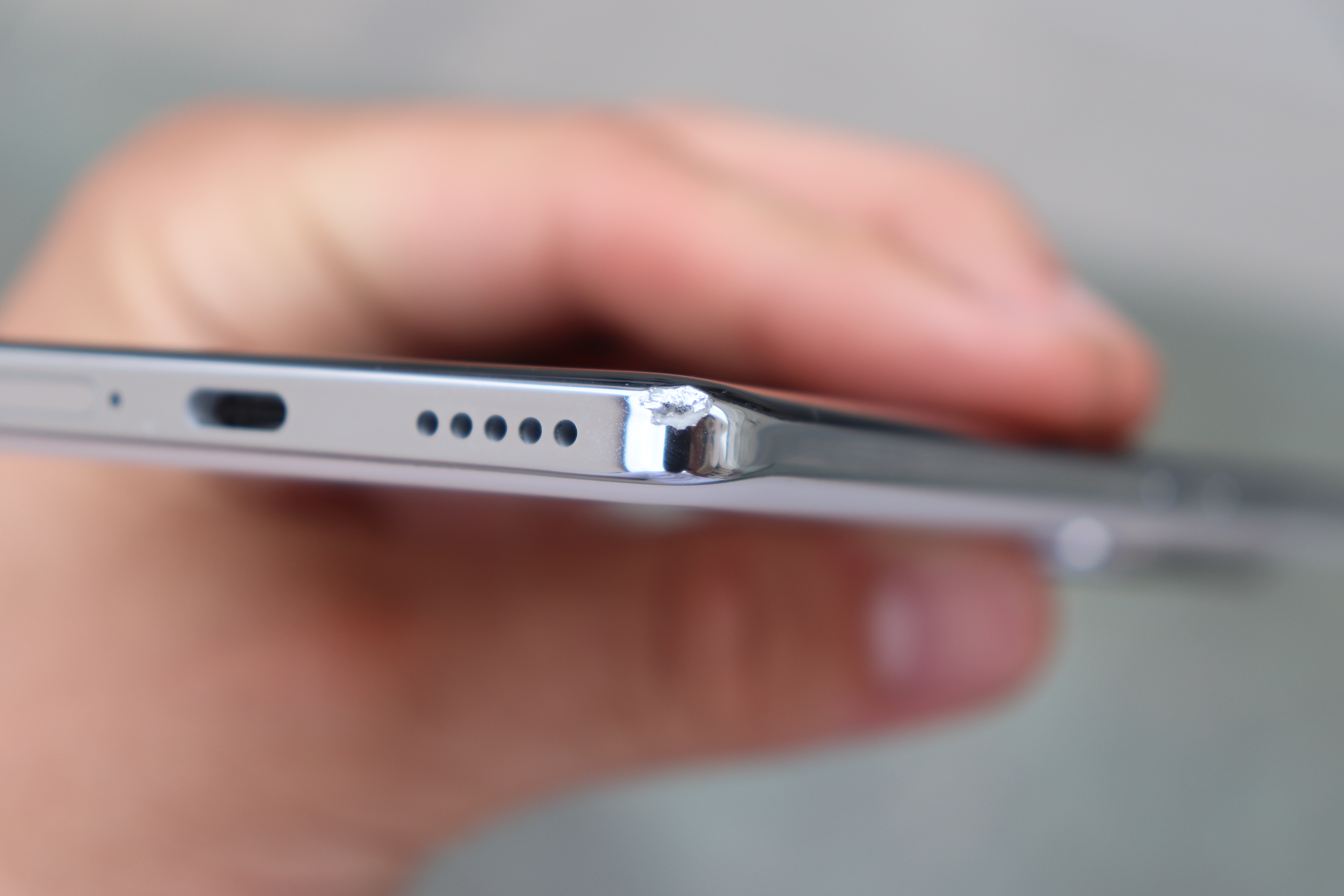 Die Verarbeitung des Honor 200 Pro ist grundsätzlich hervorragend. Die Rückseite fühlt sich insgesamt hochwertig an und das Gerät liegt gut in der Hand. Einzig der glänzende Plastikrahmen wird der sonstigen Haptik nicht gerecht. Mir ist das Gerät einmal aus knapp einem Meter Höhe auf den Rahmen gefallen – die Auswirkungen seht ihr auf den Bildern. Hier hätten wir uns in Anbetracht des Preises einen Metallrahmen gewünscht.