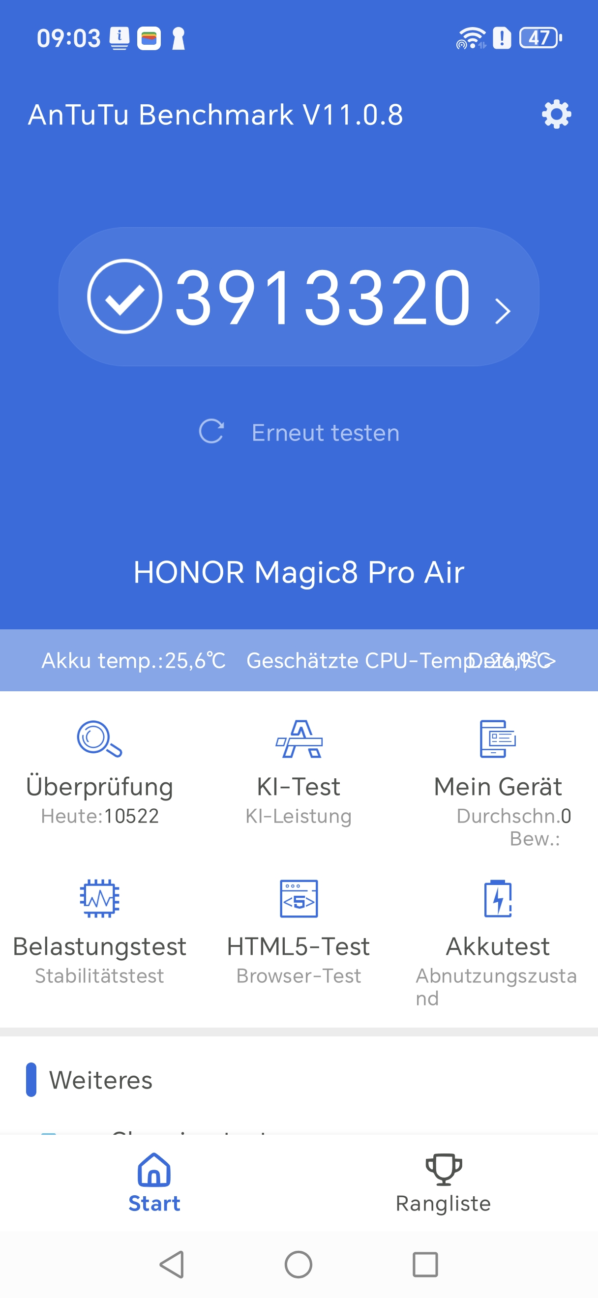 Für den normalen Alltag, Social Media und Apps hat das kaum Relevanz. Das System läuft butterweich und extrem schnell. Aber: Gamer sollten einen großen Bogen um das Gerät machen. Für dauerhafte Höchstleistung fehlt dem Magic 8 Pro Air schlichtweg der Platz zum Atmen.