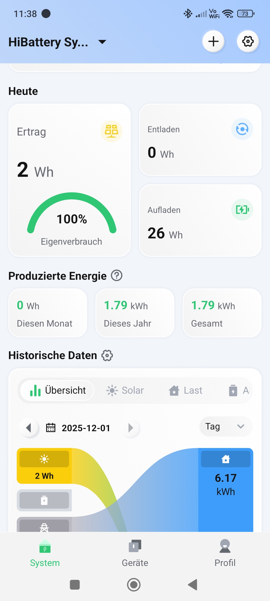 Der Startbildschirm visualisiert die komplette Energieerzeugung und den Stromverbrauch in eurem Haushalt. Ihr erhaltet Informationen über den aktuellen Ladestand, Eingangs- und Ausgangsleistung, Stromverbrauch im Haus (bei Smart-Meter Nutzung), Tagesertrag, Ladung des Akkusystems und den Batteriestand. In der Tagesauswertung könnt ihr genau nachvollziehen, wie viel Strom verbraucht wurde und welchen Beitrag die HiBattery davon kompensieren konnte. Die Statistiken erfassen zudem, aus welcher Energiequelle (angeschlossenes Balkonkraftwerk oder PV-Überschuss) die HiBattery ihre Ladung bezogen hat. Selbstverständlich stehen auch historische Daten von Tag/Monat/Jahr zur Verfügung.