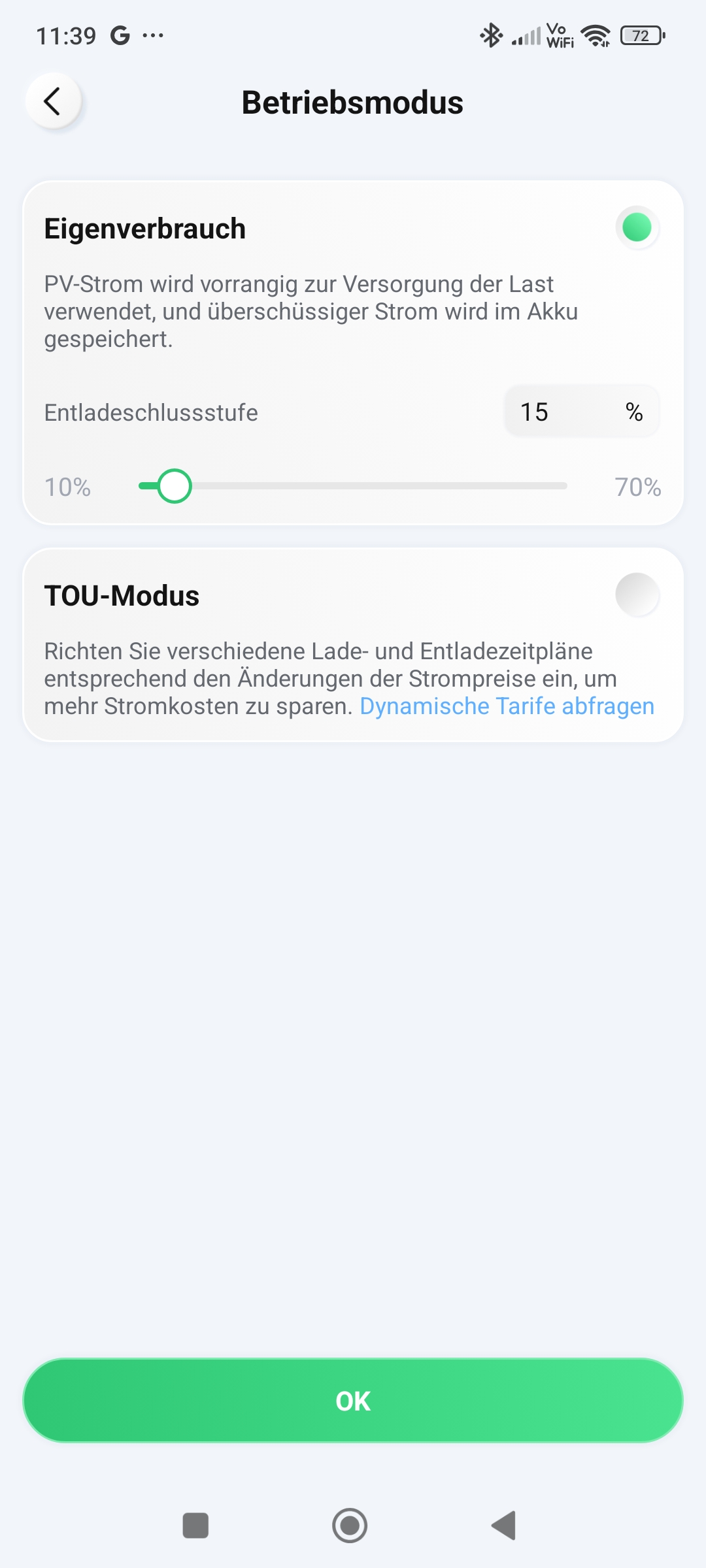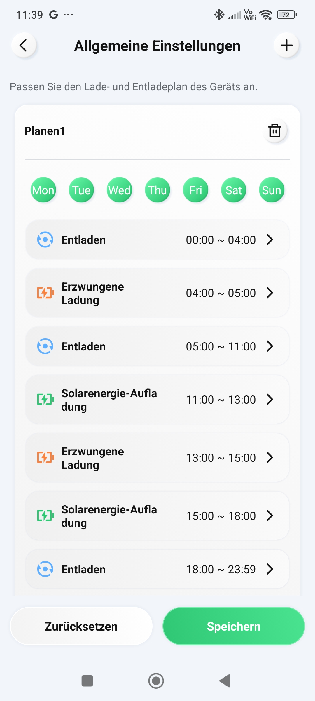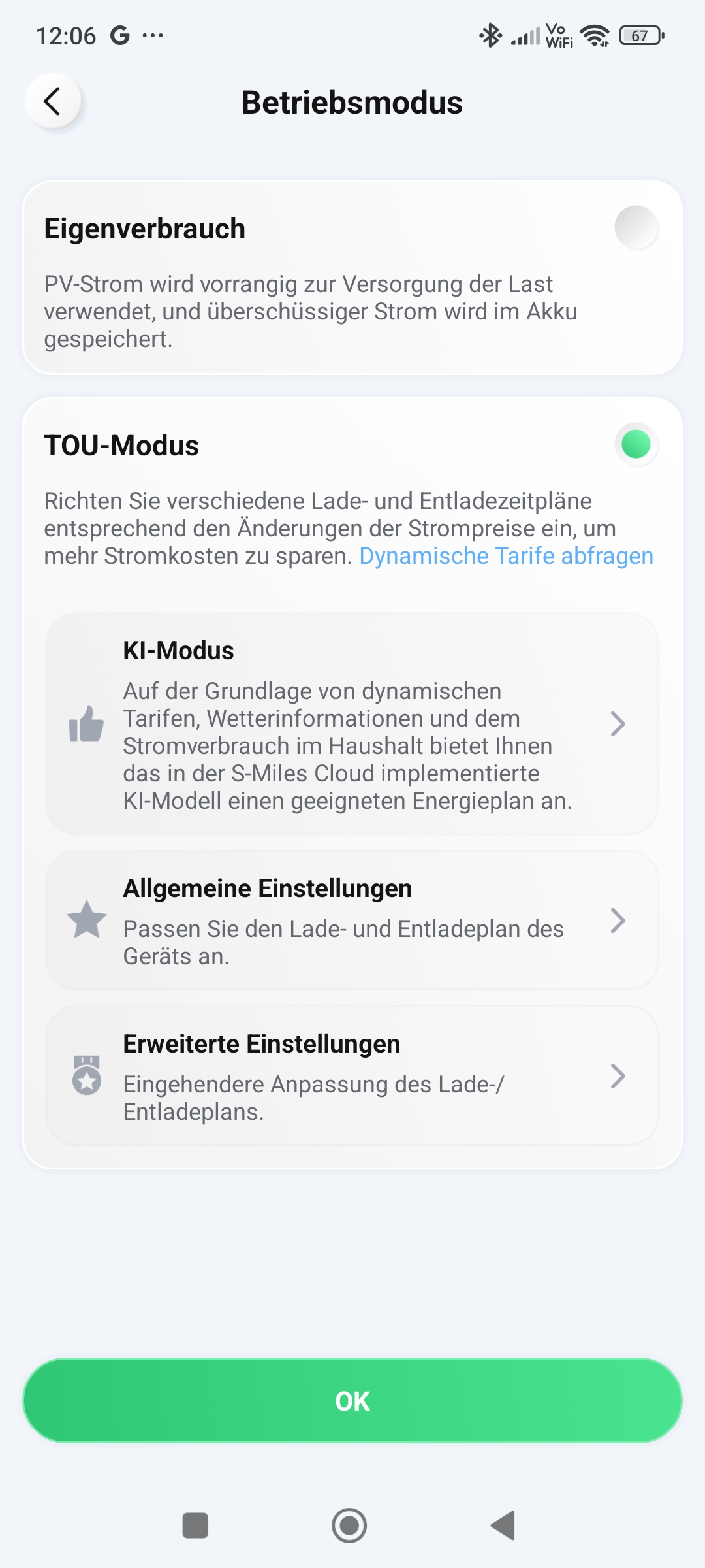 Hoymiles bietet für den Betrieb zwei grundlegende Modi an. Im Eigenverbrauchsmodus erfasst die Hoymiles HiBattery 1920 AC euren Verbrauch und regelt das Einspeiseverhalten mithilfe eines Smart-Meters (Shelly Pro 3EM oder Everhome Ecotracker) komplett selbstständig. Ein immer wiederkehrender Tagesplan kann unter den allgemeinen Einstellungen erstellt werden, der eine minutengenaue Steuerung der Lade- und Entladezeiten mit individuell anpassbarer Leistung ermöglicht. Die erweiterten Einstellungen erlauben die Konfiguration von kompletten Wochenplänen, die gesonderte Einstellungen für jeden Wochentag erlauben. Der KI-Modus kombiniert den Eigenverbrauchsmodus mit der Nutzung von dynamischen Stromtarifen. Dabei werden tagesaktuelle Strompreise (Großhandelspreise von ENTSO-E) in Verbindung mit Wetter und Verbrauchsprognosen analysiert und ein passendes Lade-/Entladeprofil für euer Speichersystem erstellt. Dieser Modus ist wie der Eigenverbrauchsmodus nur mit einem Smart-Meter sinnvoll nutzbar. Andernfalls kann das System euren Tagesverbrauch nicht analysieren und kennt auch euer Verbrauchsverhalten nicht.