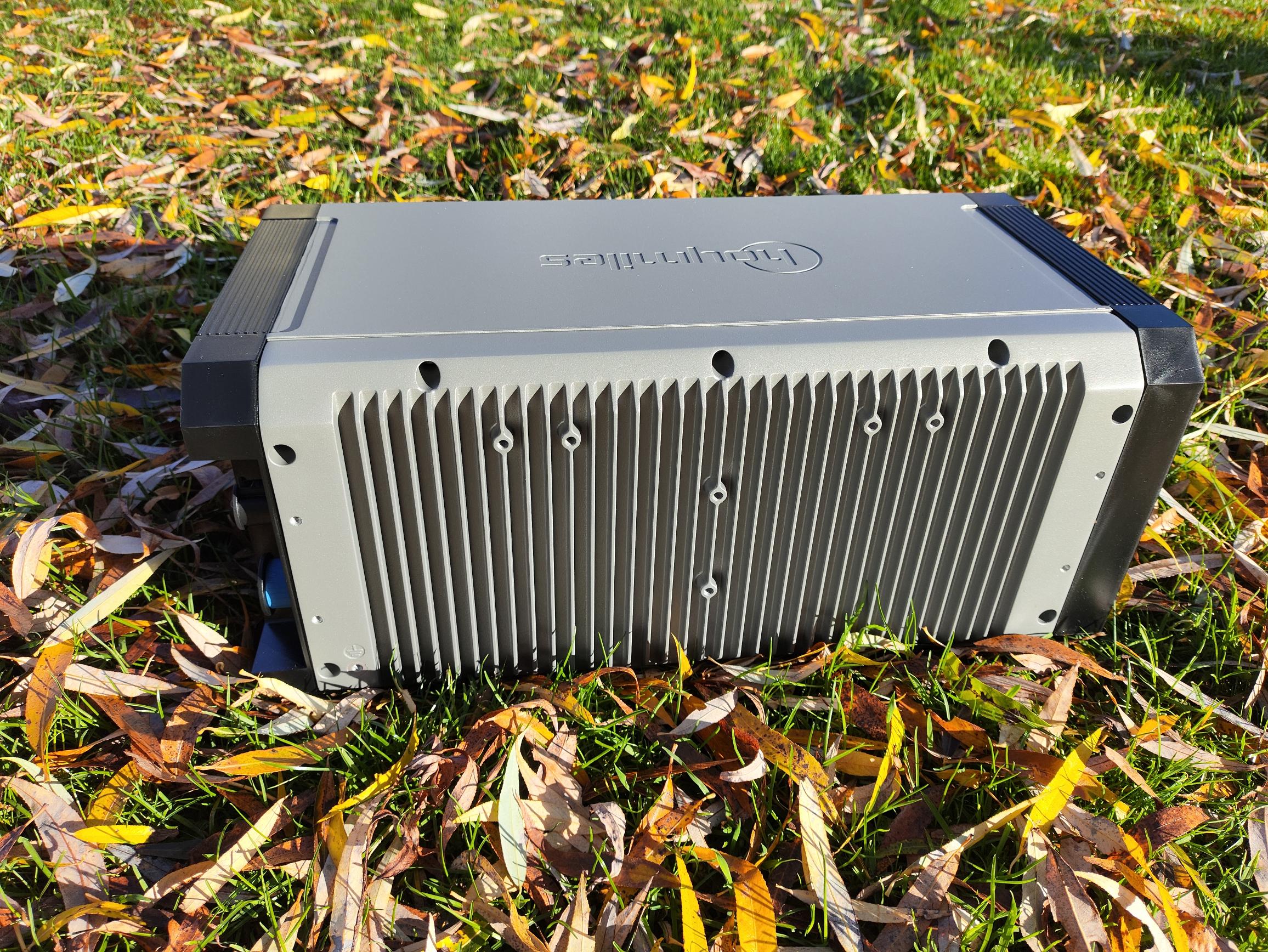 Optisch erfindet sich die Hoymiles HiBattery 1920 AC komplett neu. Das Gehäuse ist für einen Energiespeicher extrem kompakt aufgebaut und besteht fast vollständig aus grauem Aluminium. Lediglich die Seitenteile sind mit Kunststoffabdeckungen versehen. Die Rückseite wird fast vollständig von einem massiven Kühlkörper bedeckt.
