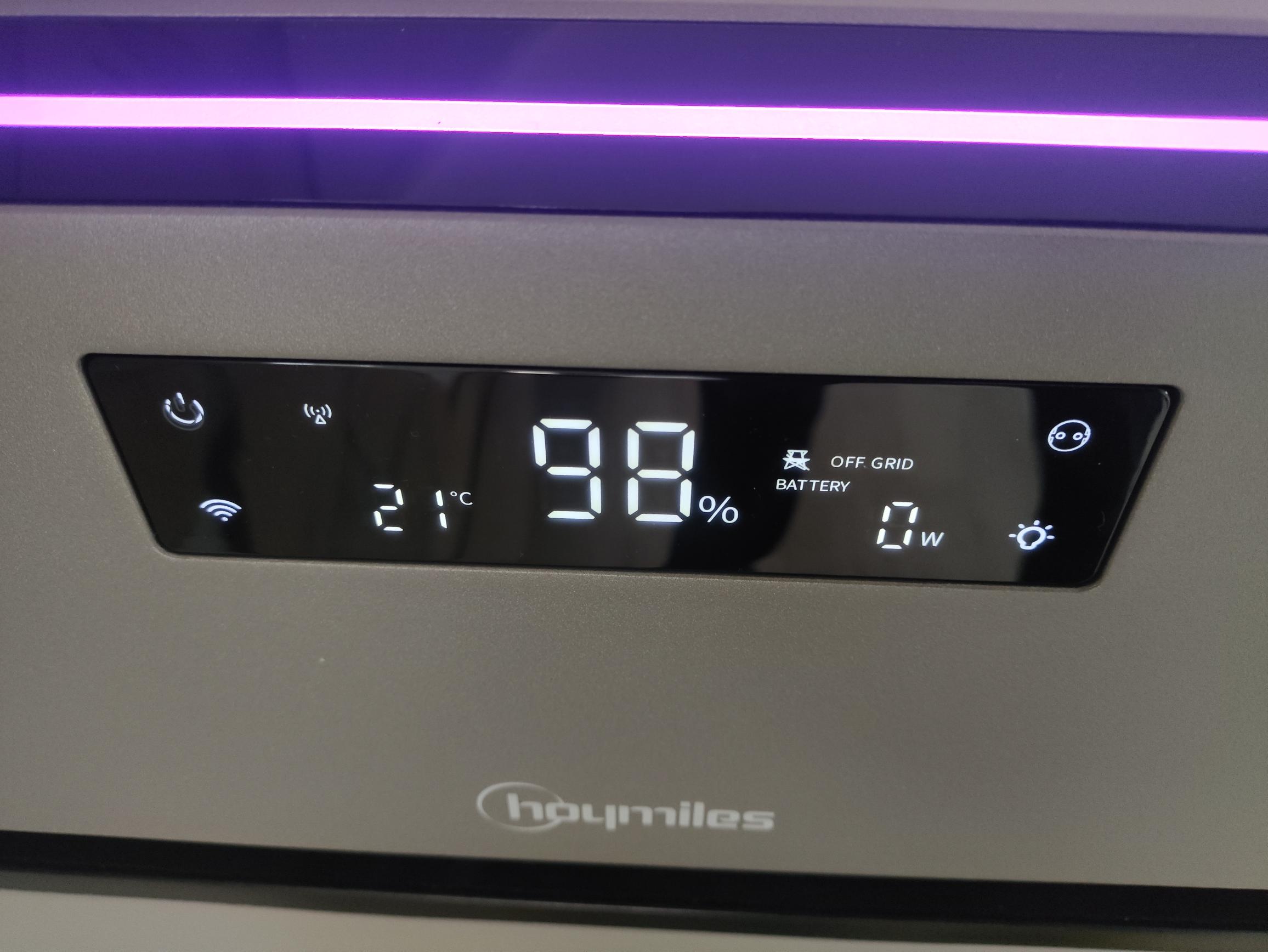 Auf der Front verbaut der Hersteller ein Touch-Display, welches neben dem ON/OFF-Taster Informationen über die Betriebstemperatur, den Akkustand, die Ein- und Ausgangsleistung und die Betriebszustände bereitstellt. Weiterhin lassen sich das WLAN und die Off-Grid-Steckdose über das Display aktivieren/deaktivieren. Der darüberliegende LED-Streifen signalisiert wahlweise den Ladezustand oder kann ein dauerhaftes Leuchten oder verschiedene Farbspiele ausgeben. Sowohl die Farbe als auch die Farbmuster lassen sich in der App und mithilfe des Touch-Displays individuell konfigurieren.