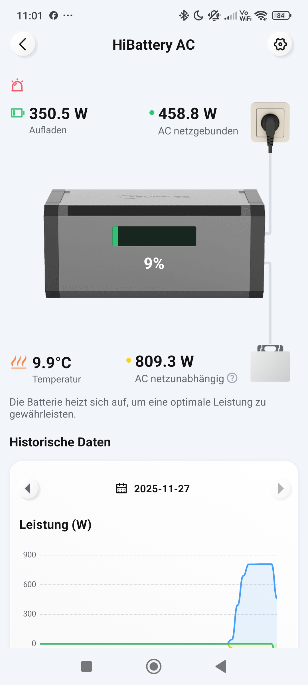 Im Testaufbau wird der Speicher mit einer Leistung von 1.000W geladen, während die überschüssigen 800W in das heimische Stromnetz eingespeist werden. Bei Überschreiten der 1.800W (maximale Eingangsleistung) schaltet die Hibattery die Schuko-Steckdose und somit den externen Wechselrichter ab. Somit wird verhindert, dass mehr als 800W in das Hausnetz eingespeist werden. Die Einspeisung der HiBattery bleibt selbstverständlich weiterhin aktiv und versorgt euer Haus mit Energie. Liegt die Leistung des externen Wechselrichters bei vollständig geladenem Akku unter 800W, wird die überschüssige Energie in das Hausnetz eingespeist und der Wechselrichter bleibt aktiv. Überschreitet diese 800W, wird ebenfalls abgeschaltet. Sobald der Akkustand wieder unter einen Wert von 97% fällt, wird der Wechselrichter erneut aktiviert, der Akku geladen und bis zu 800W in das Hausnetz eingespeist.