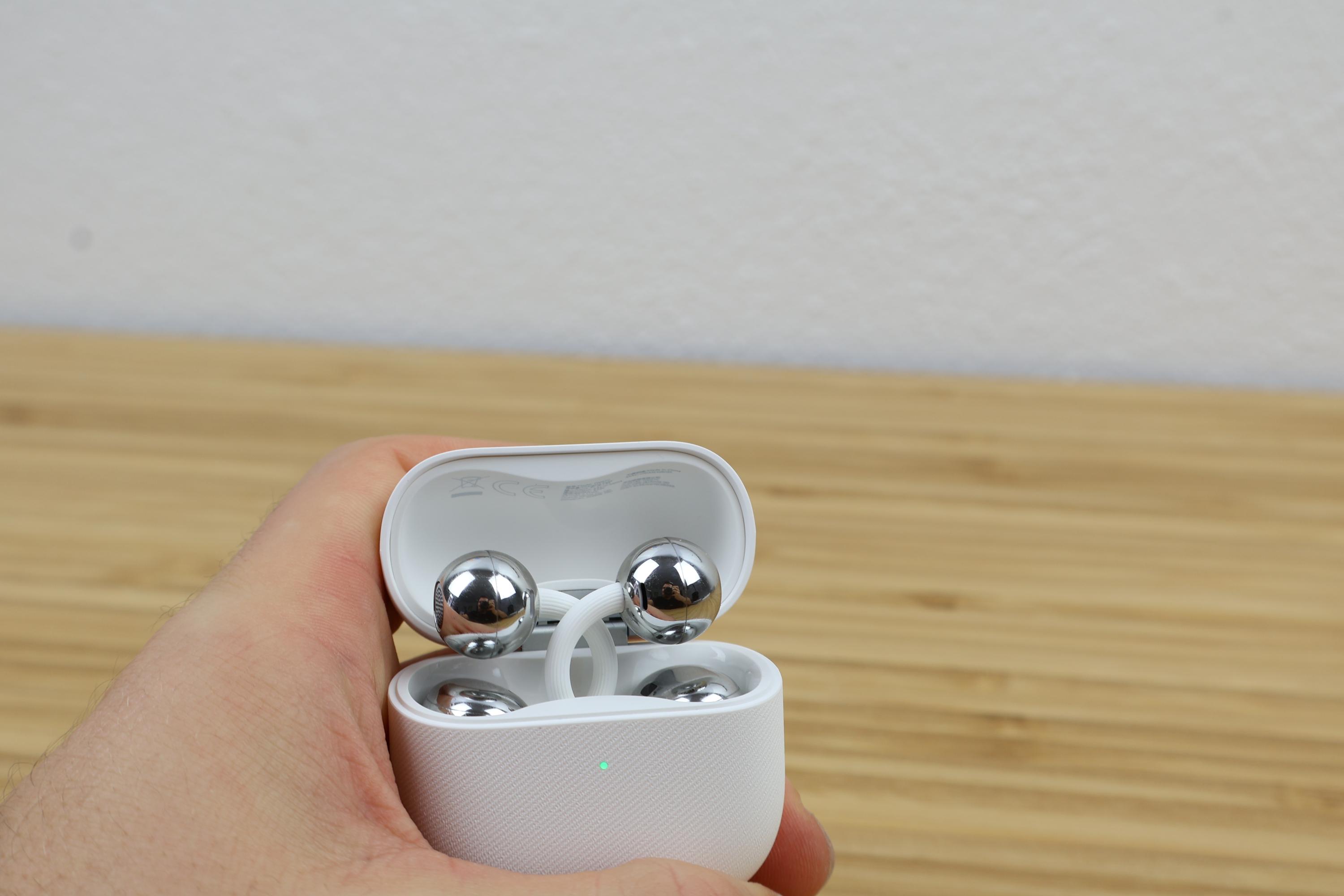 Den minimal größeren Akku habe ich in der Praxis nicht gemerkt, aber mit 80% Lautstärke kam ich abermals problemlos auf 7 Stunden Laufzeit am Stück. Wenn man dann noch dreimal innerhalb von 30–40 Minuten voll nachladen kann, ist man hier wirklich bestens bedient. 10 Minuten reichen laut Huawei sogar für 3 Stunden aus. Die einzelnen Earbuds der Huawei FreeClip 2 haben jedenfalls 60mAh verbaut und die Station 537mAh. Aufgeladen wird das Ladecase wahlweise über USB-C oder aber kabellos auf einem Ladepad oder der Rückseite eures Smartphones. Am Kabel zeigte mein Case nach nur 40 Minuten ein grünes Licht und war wieder voll einsatzbereit.