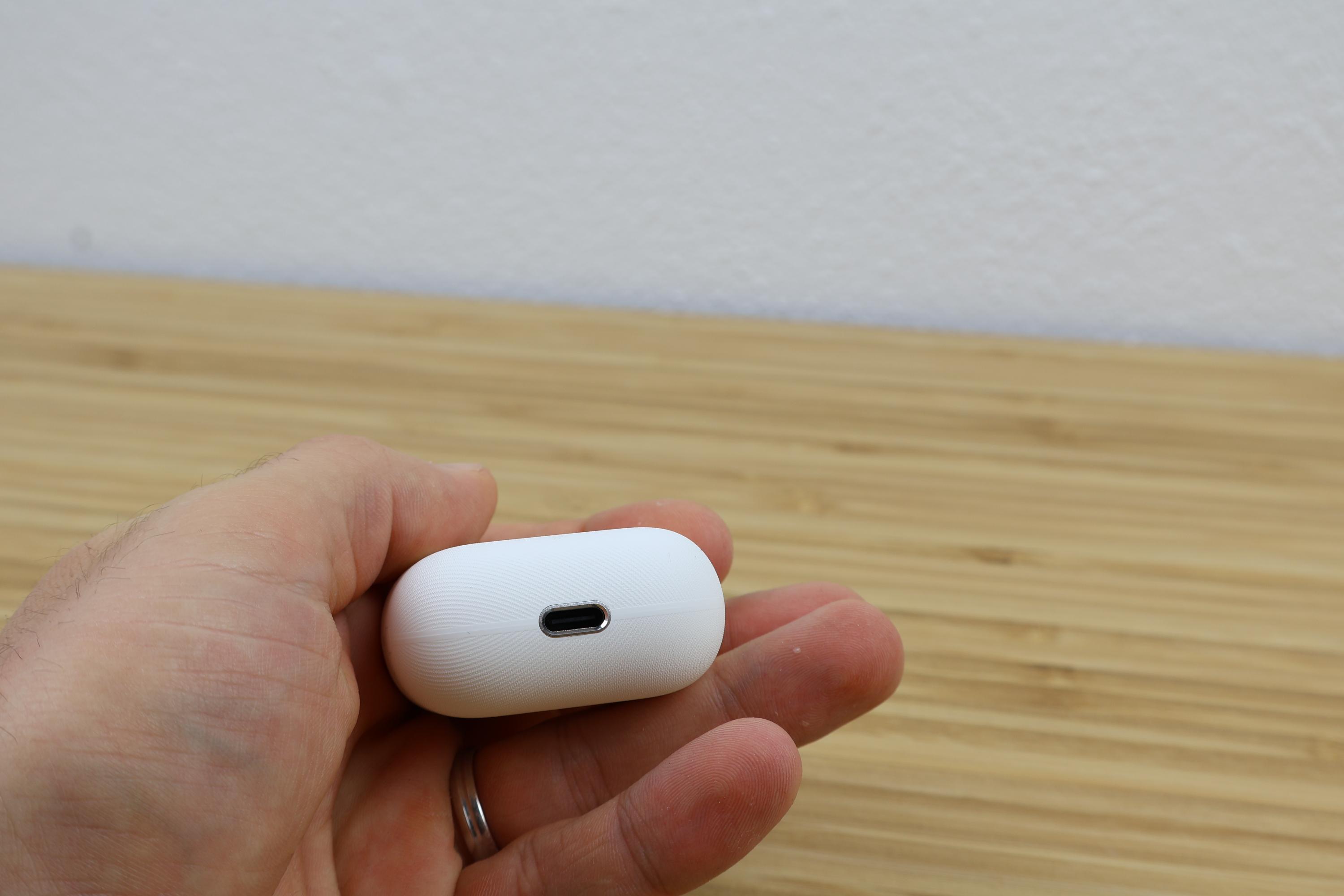 Das Ladecase ist nicht wasserdicht. Bei den FreeClip 2 hat man es etwas geschrumpft auf 50,0 x 49,6 x 25,0 Millimeter. Die 48,5 Gramm mit Kopfhörern im Case sind beim Transport nicht wahrnehmbar, aber auch das alte Case war mit Kopfhörern gerade in der Open-Ear-Welt sehr transportabel. Die Verarbeitungsqualität bezogen auf das Gelenk und den einen Knopf ist völlig in Ordnung. Unten befindet sich ein USB-C Ladeanschluss.