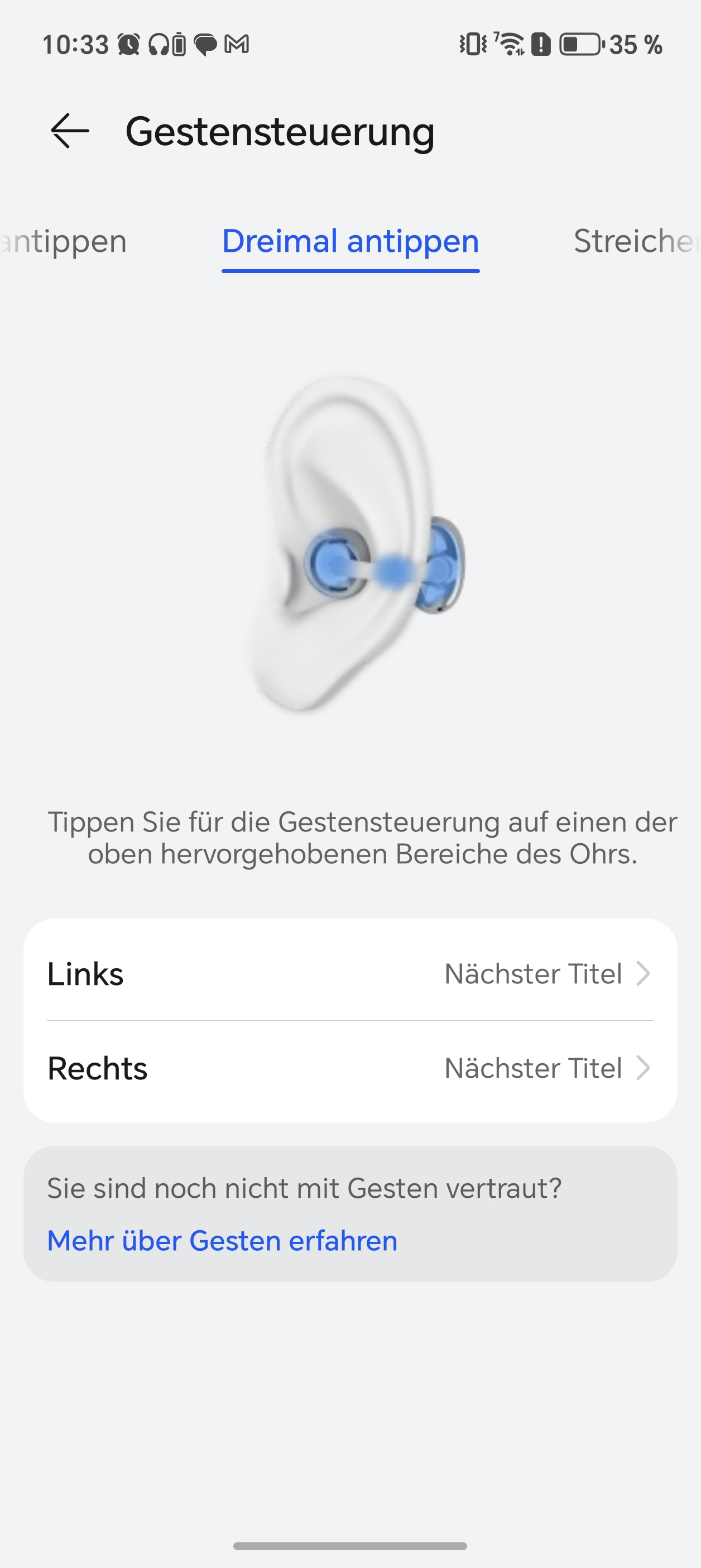 Bei der Steuerung neu ist der Swipe am Gehäuse selbst. Davon bin ich, ähnlich wie von allen Touchbedienungen, kein Fan und auch hier nicht richtig warm damit geworden. Aber für meinen Favoriten, physische Tasten, ist hier auch nicht wirklich Platz und letztendlich funktioniert es in der Praxis. Dennoch habe ich so selten wie möglich (außer mal Telefonanruf entgegennehmen) auf die Funktionen am einzelnen Earbud zurückgegriffen. Wenn man denn will, hat man jetzt jedenfalls nochmals mehr Möglichkeiten, und das klappt auch mit dem zweimal und dreimal Antippen ebenso wie mit dem Swipe ganz gut. Folgendes ist verfügbar: