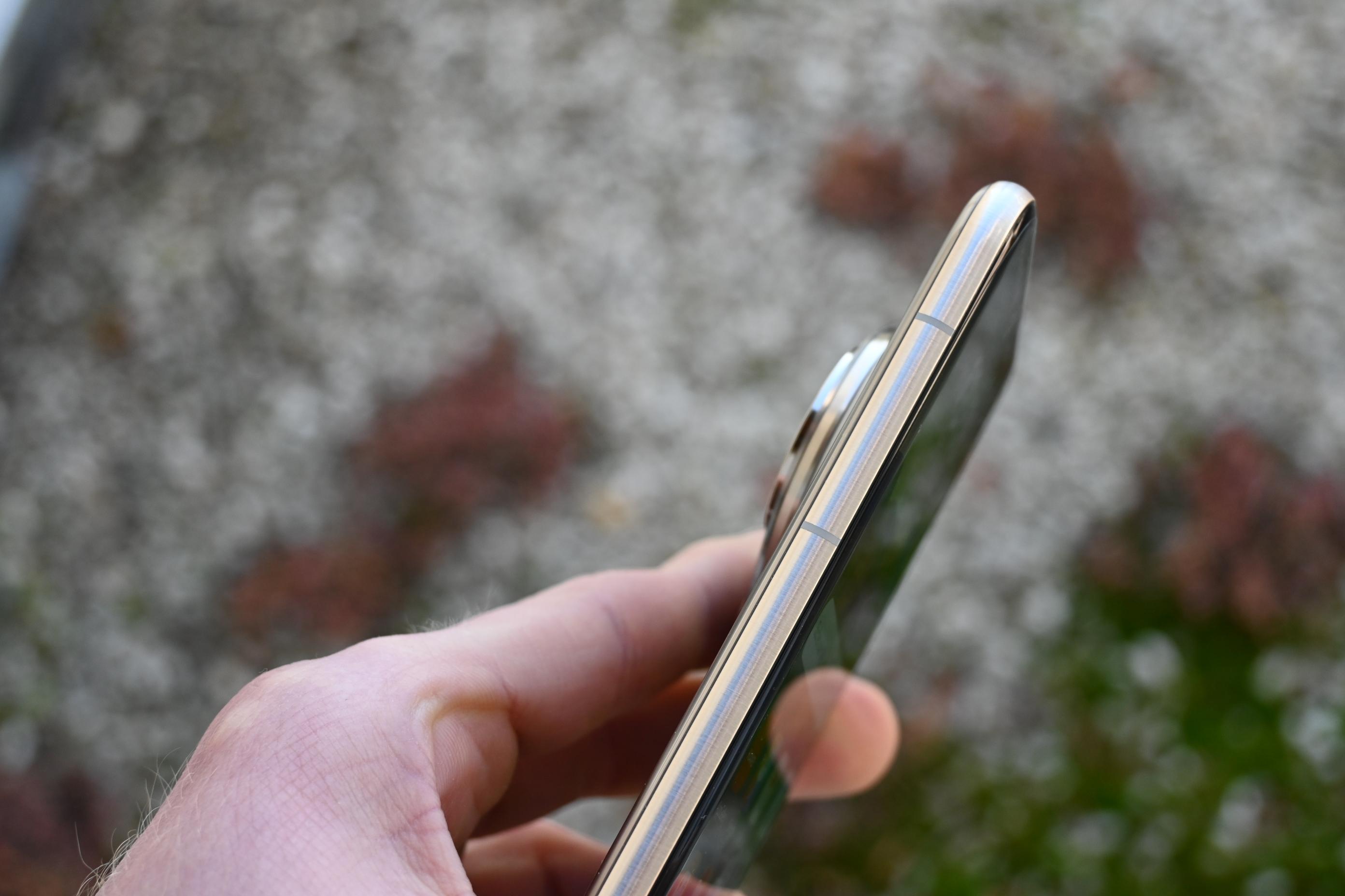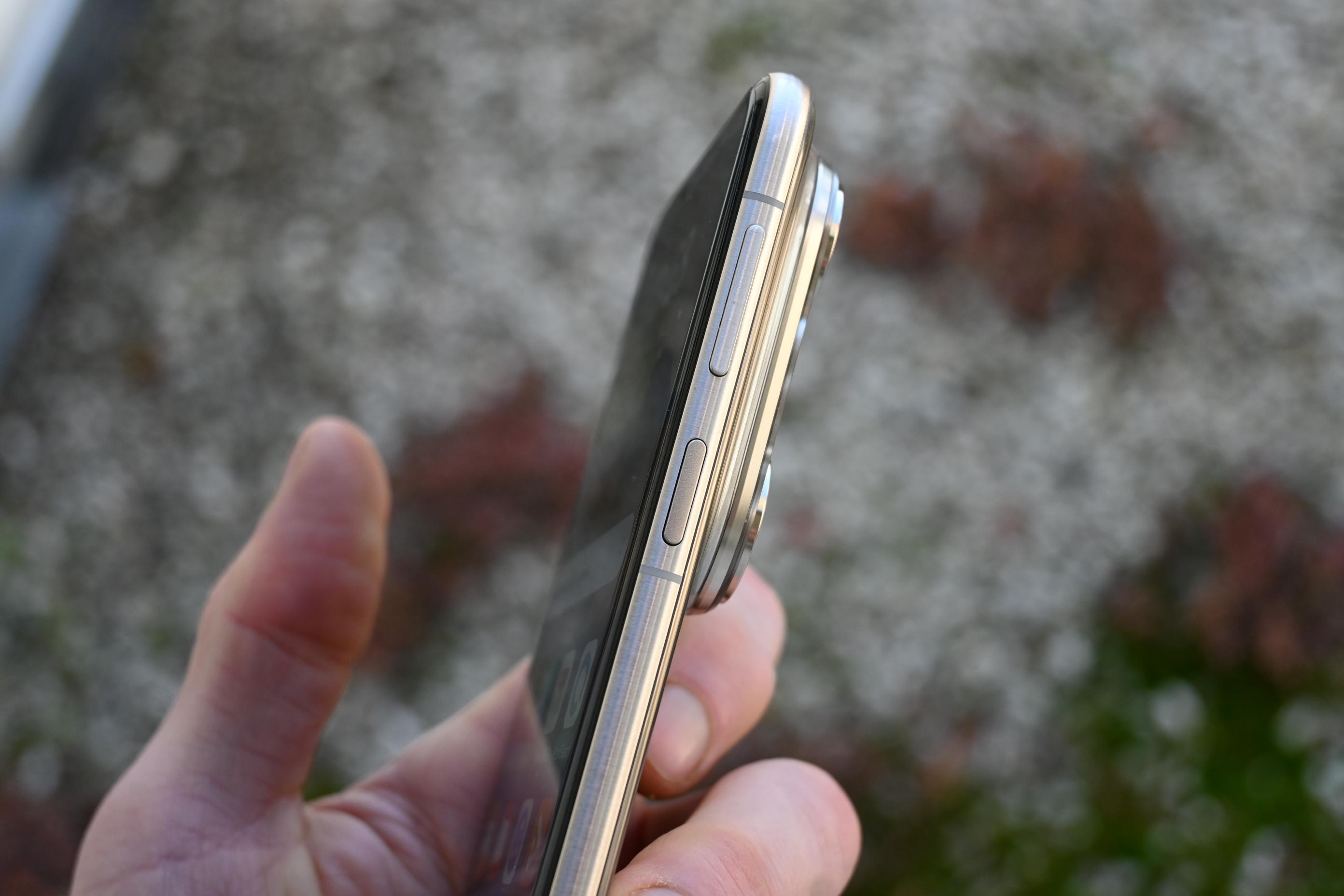 Wie es sich für ein Flaggschiff gehört, sind die Displayränder dünn. Die Frontkamera sitzt unauffällig in einer kleinen Punch-Hole. Ein dominierendes Designelement ist das riesige, dreieckige Kameragehäuse auf der Rückseite, das auch den LED-Blitz beherbergt. Das Modul macht das Smartphone spürbar kopflastig. Die Linsen selbst stehen gewaltige 8 Millimeter aus dem Gehäuse hervor. Damit ist das Handy an dieser Stelle doppelt so dick. Die mitgelieferte Hülle kaschiert dies jedoch halbwegs.