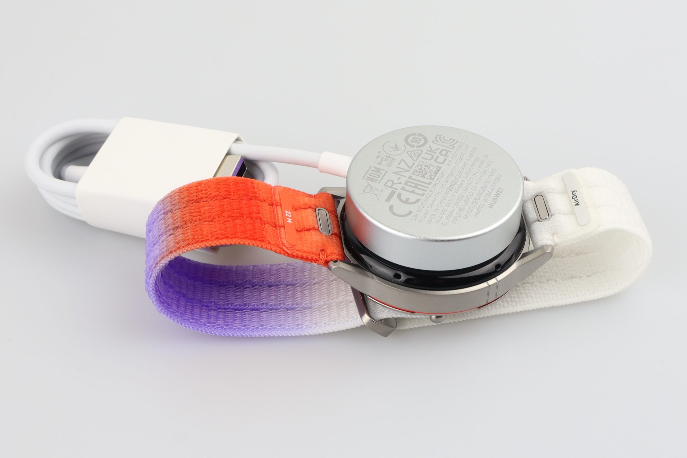 Ein Pluspunkt der Huawei Watch GT Runner 2 ist der Lieferumfang. Neben der Uhr, den üblichen Schnellstartanleitungen und der magnetischen Ladestation (mit fest integriertem USB-A-Kabel) legt der Hersteller löblicherweise direkt zwei verschiedene Armbänder bei. In unserer Variante befand sich neben einem gewebten AirDry-Nylonarmband mit Klettverschluss auch ein perforiertes Fluorelastomer-Armband. Das Stoff-Armband lässt sich nach schweißtreibendem Cardio super auswaschen und ist nach 20 Minuten schon trocken. Ein bisschen gelblich verfärbt hat sich das weiße Band allerdings nach einem Monat Praxiseinsatz.