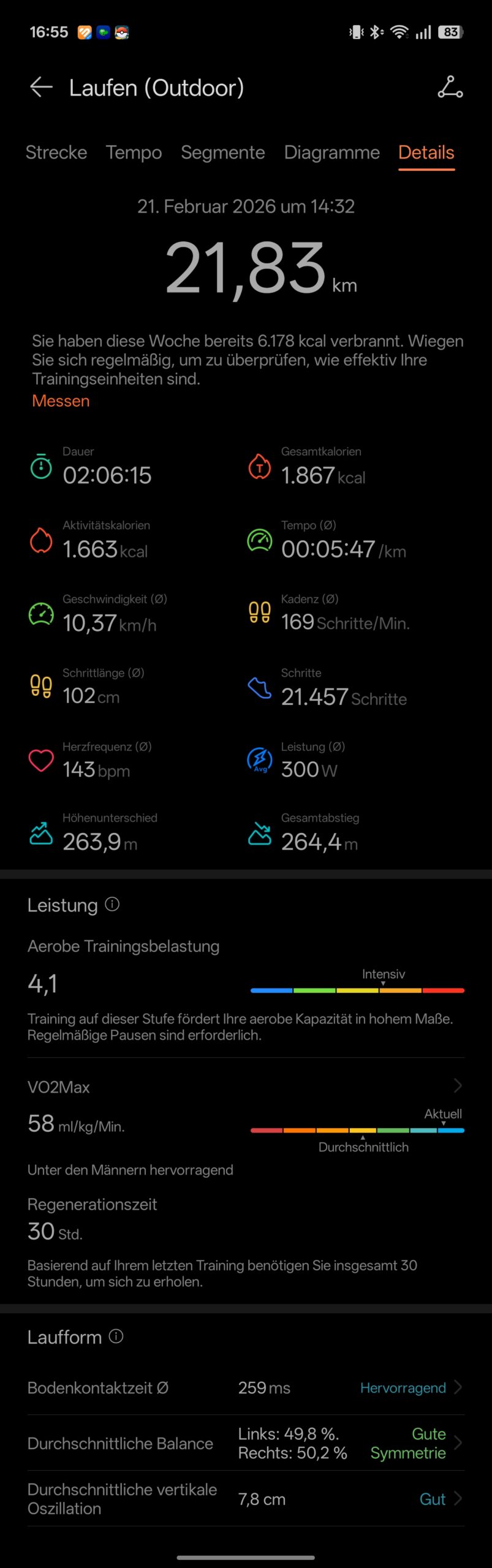 Diese Puls-Diskrepanz schlägt sich am Ende natürlich 1:1 in der Kalorienberechnung nieder. Während sich Uhr und Gurt auf der Laufstrecke absolut einig sind, kappt die Smartwatch den Verbrauch beim Krafttraining mal eben um fast die Hälfte (404kcal vs. 746kcal), weil sie die tatsächliche kardiovaskuläre Last schlichtweg nicht „sieht“. Beim Laufen oder Fahrradfahren sind sich Smartwatch und Brustgurt fast einig (Handgelenk meist ~2bpm weniger), was super ist.