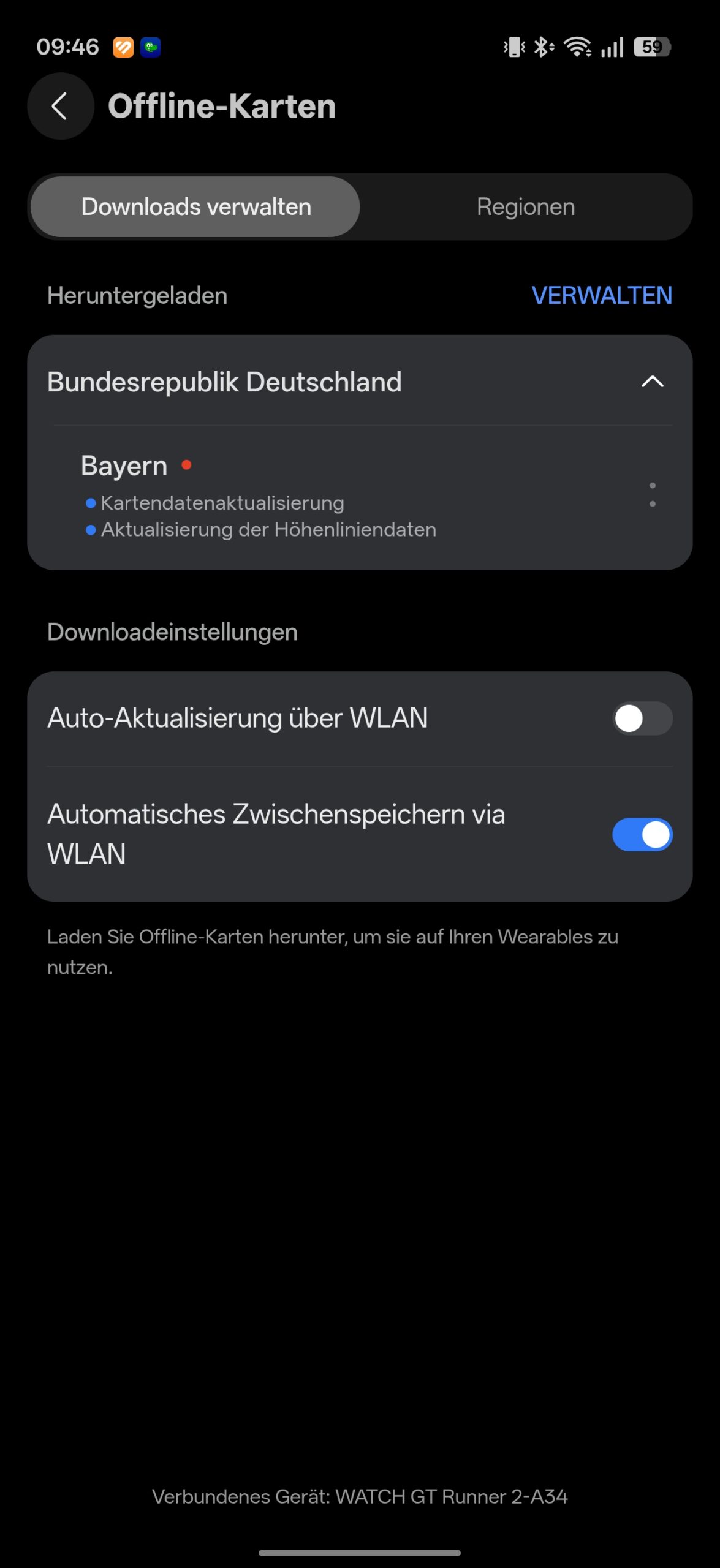 Die bereits erwähnte 3D-Floating-Antennenarchitektur mit Dual-Band-GNSS (L1 + L5) leistet hervorragende Arbeit. Die Positionsbestimmung erfolgt im Freien binnen weniger Sekunden. In dicht bebauten Städten oder bewaldeten Gebieten liefert die Uhr sehr präzise Routenverläufe, die denen teurerer Konkurrenten in nichts nachstehen. Zwar gibt es an schwierigen architektonischen Knotenpunkten minimale Abweichungen, diese bewegen sich jedoch im absoluten Toleranzbereich. In der Würzburger Innenstadt sind mir ein paar Meter verloren gegangen, dafür gab es auf dem Rad durch das Umland und Wälder quasi keine Diskrepanz. Zudem unterstützt die Uhr Offline-Karten und den Import von GPX-Dateien zur eigenständigen Navigation. Die Karten wählt ihr einfach in der App aus (z.B. ein Bundesland in Deutschland), dann habt ihr beim Outdoor-Training immer eine Karte parat. Routen importiert ihr z.B. einfach per Komoot: Beim Wandern oder Joggen wirklich eine Bereicherung, denn so müsst ihr nicht mit dem Smartphone hantieren.