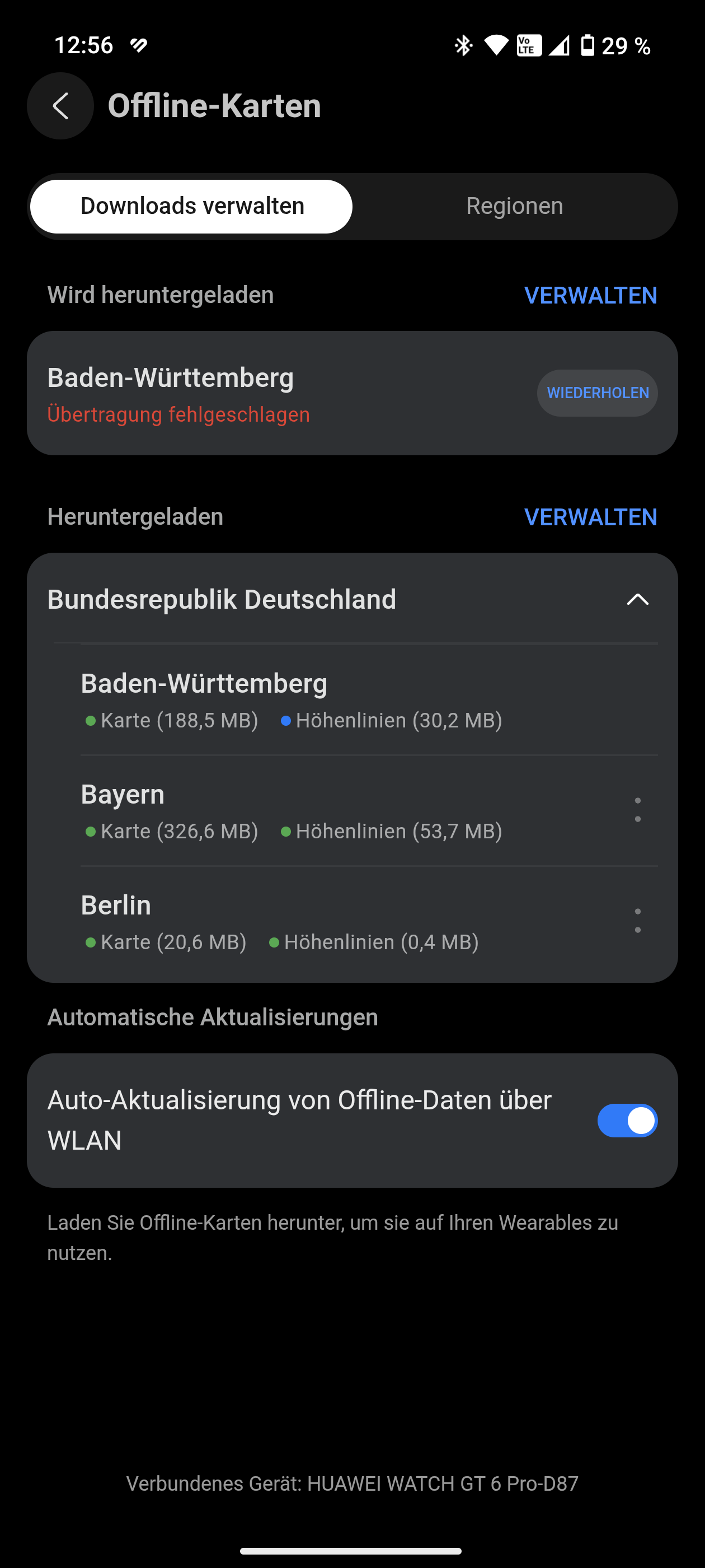 Für die Konnektivität sind Bluetooth 6.0 und NFC an Bord. Ein vernünftiger Bezahldienst fehlt bei Huawei. Hier nutzt ihr Quickoo. Jonas hat das im Test der Huawei Watch GT6 schon recht passend erklärt, denn es ist einfach kompliziert. Wer seine Musikbibliothek auf der Uhr speichern möchte, kann das dank 64GB Speicherplatz tun. Die Dateiübertragung per Bluetooth dauert allerdings recht lange. So braucht es beispielsweise gut 15 Minuten, um die Offlinekarte eines deutschen Bundeslandes (z. B. Bayern mit 400MB und Höhenlinien) zu übertragen.
