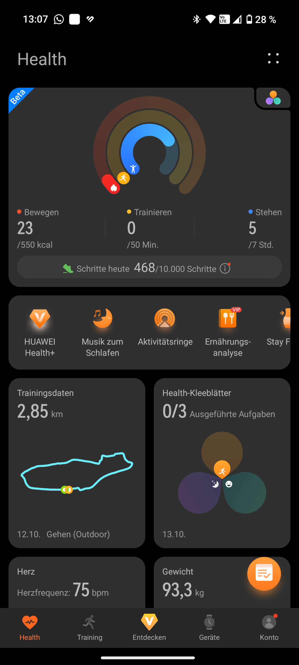 Die Huawei Health App ist die zentrale Anlaufstelle für alle erfassten Daten und für Android und iOS verfügbar. Es empfiehlt sich, die .apk direkt vom Hersteller herunterzuladen (hier bei Huawei). Updates werden dann in der App selbst angezeigt.