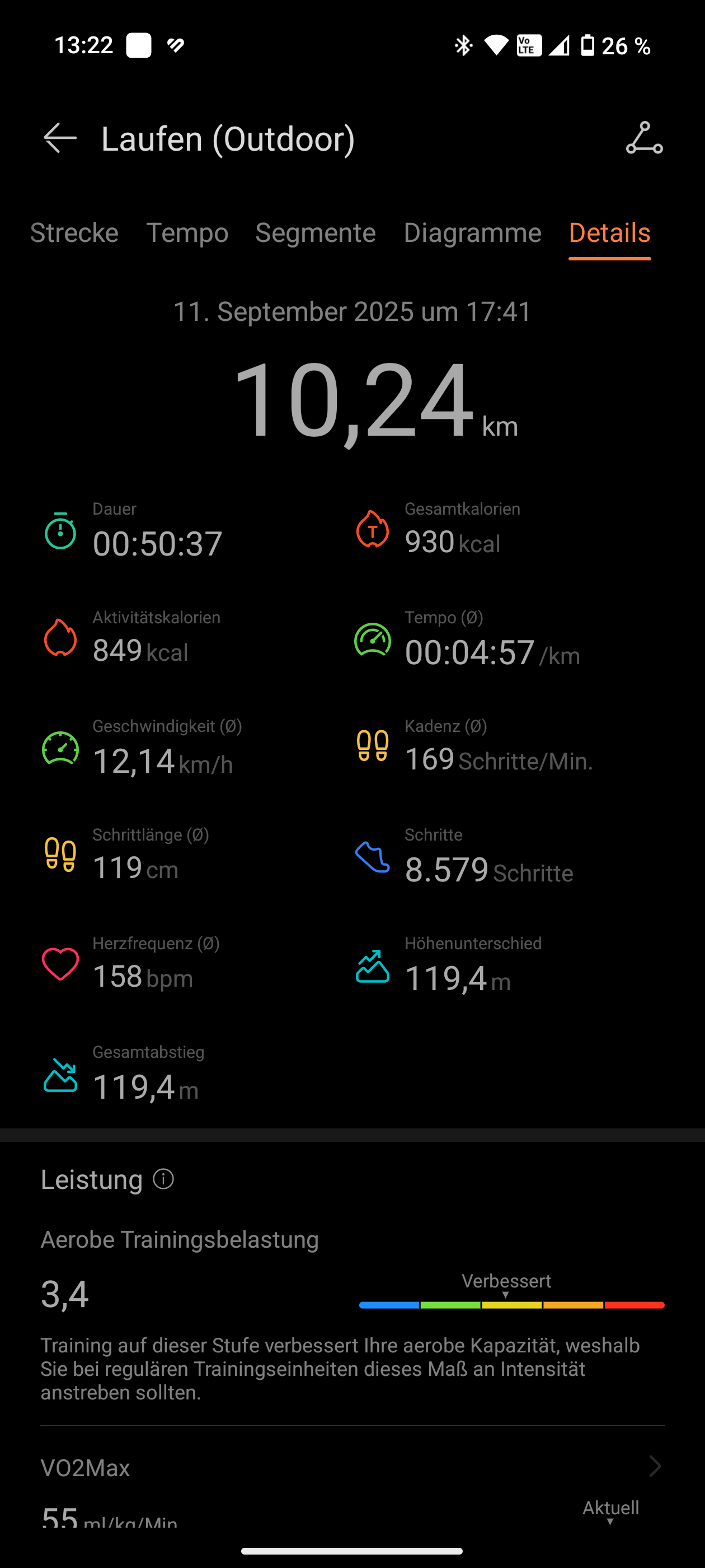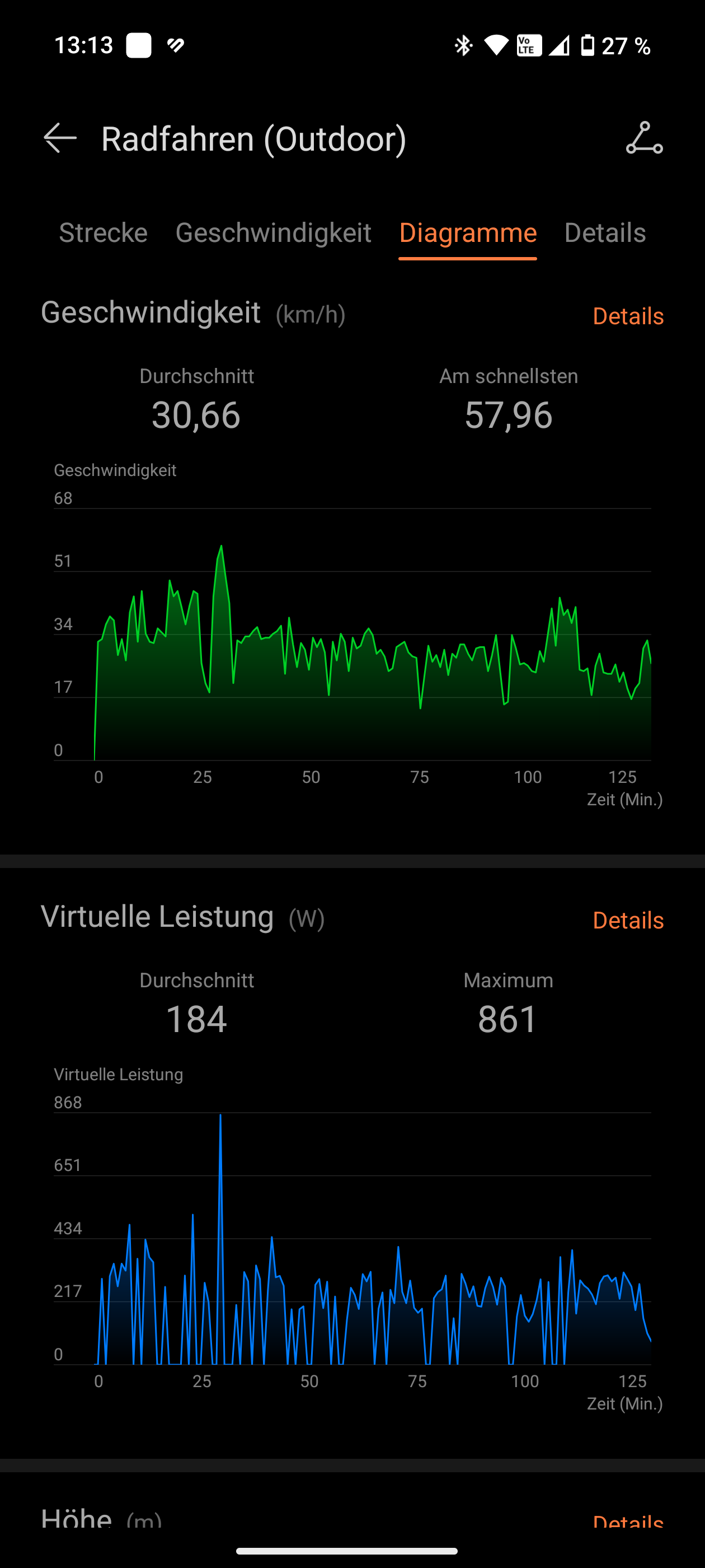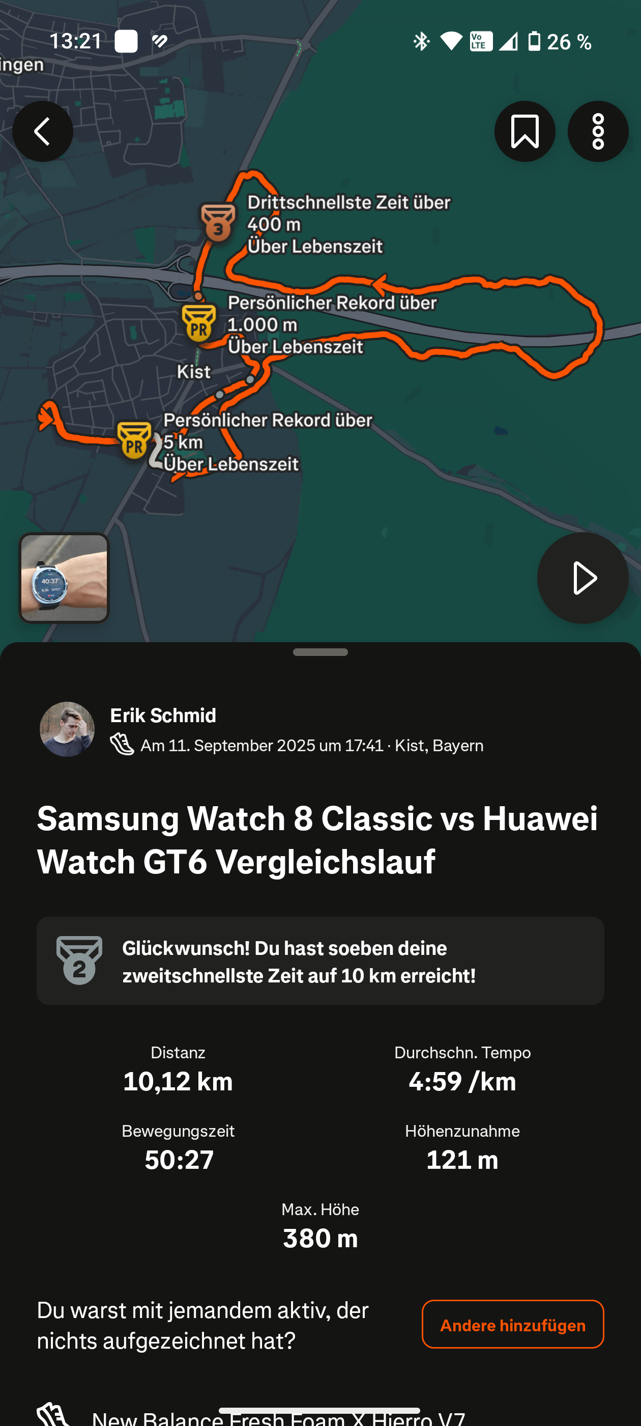 Die Huawei Watch GT6 Pro arbeitet exzellent. Im Vergleich mit einem Radcomputer war die aufgezeichnete Strecke deckungsgleich. Selbst ein Smartphone mit Dual-Band-GPS wird von der Smartwatch übertroffen, indem sie Kurven genauer nimmt und an Gebäuden (schwierig für GPS) entlangläuft.