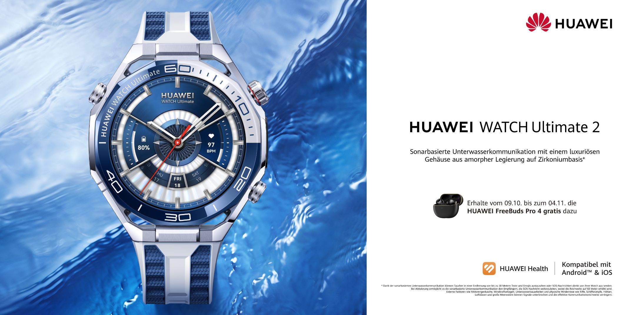 Die Huawei Watch Ultimate 2 ist ab sofort direkt beim Hersteller zu einer unverbindlichen Preisempfehlung ab 899€ in Schwarz erhältlich. Die blaue Version kostet 999€. Zum Marktstart bietet Huawei eine Einführungsaktion: Mit dem Coupon erhaltet ihr 10% Rabatt. Zusätzlich legt der Hersteller bis zum 4. November 2025 die Huawei FreeBuds Pro 4 (zum Test) (im Wert von ca. 150€) sowie eine kostenlose Verlängerung der Herstellergarantie auf drei Jahre bei.