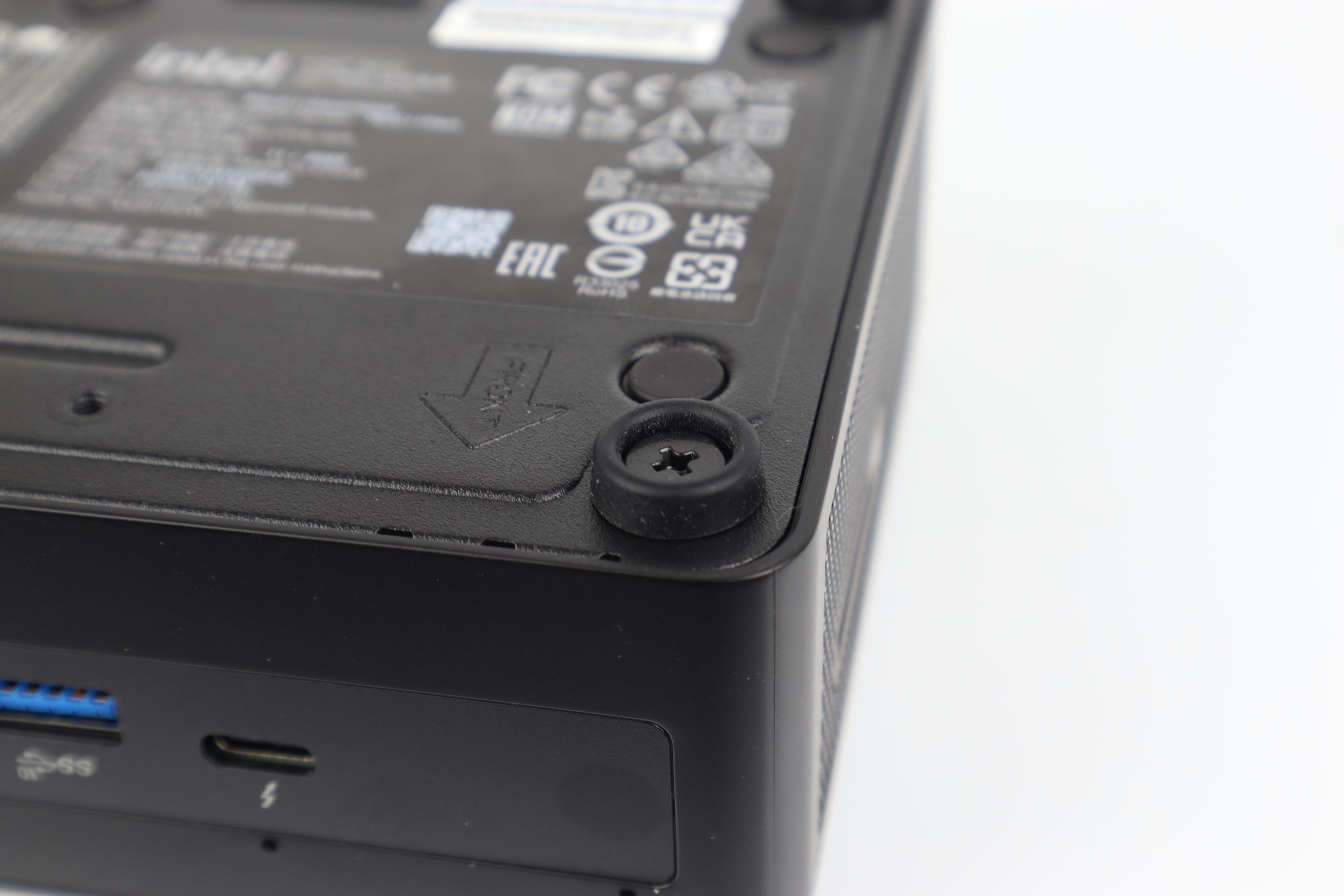 Das komplett in Schwarz und Grau gehaltene Gehäuse steht auf vier Gummifüßen, die jeweils von einer Schraube gehalten werden. Wenn man diese vier Schrauben entfernt, kann man auch die Metallplatte abnehmen. Der Intel NUC 11 wirkt zweifelsohne stabil und hochwertig und erinnert an die Nachbauten des bekannten China-Herstellers Geekom.