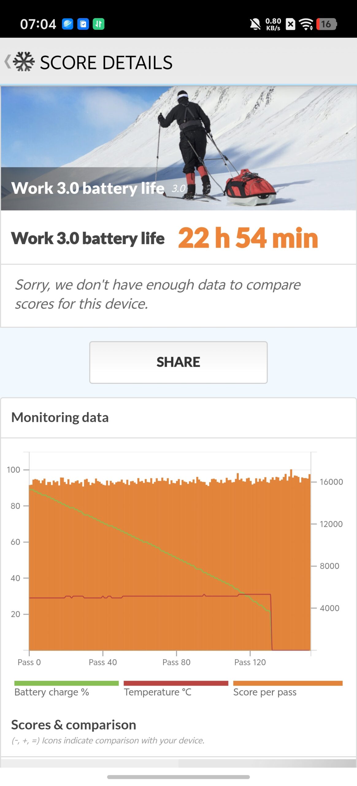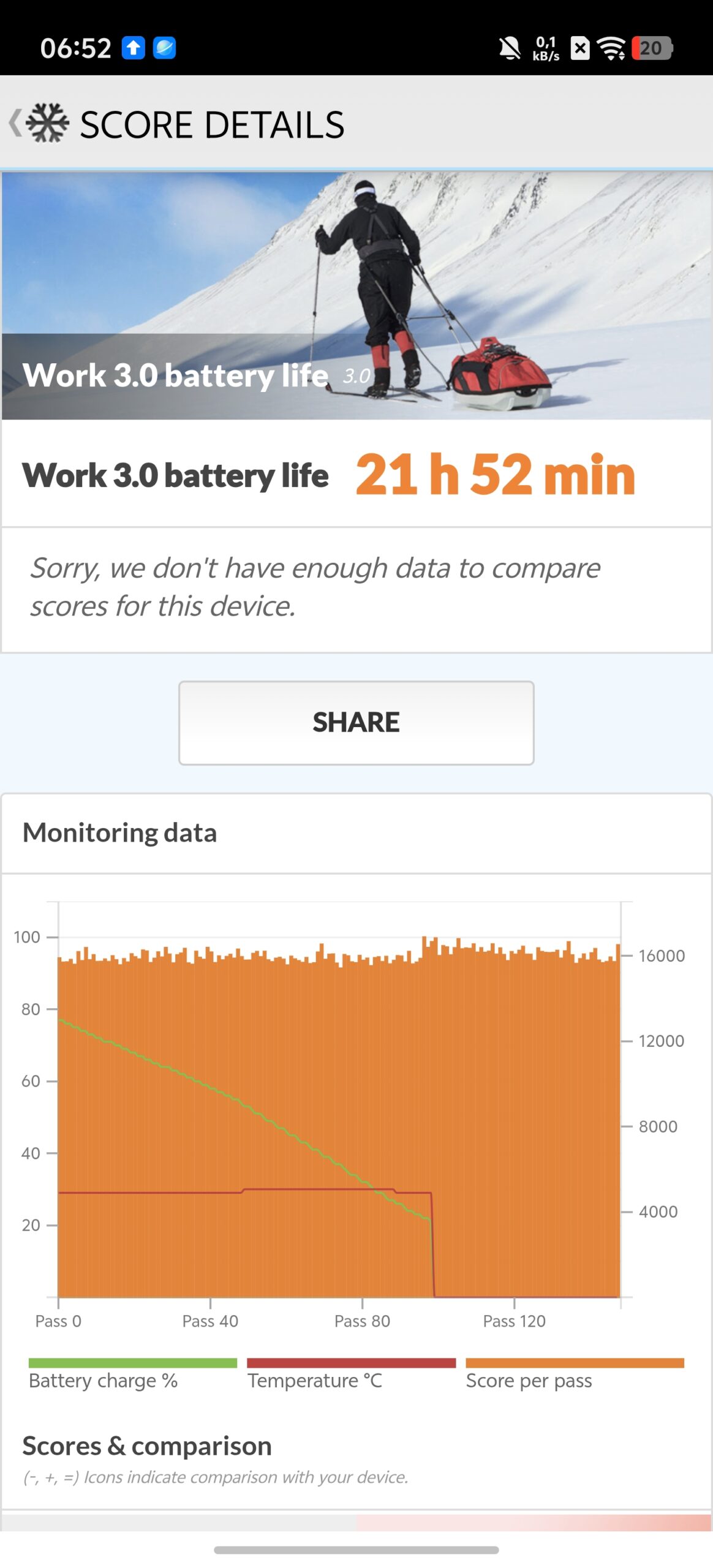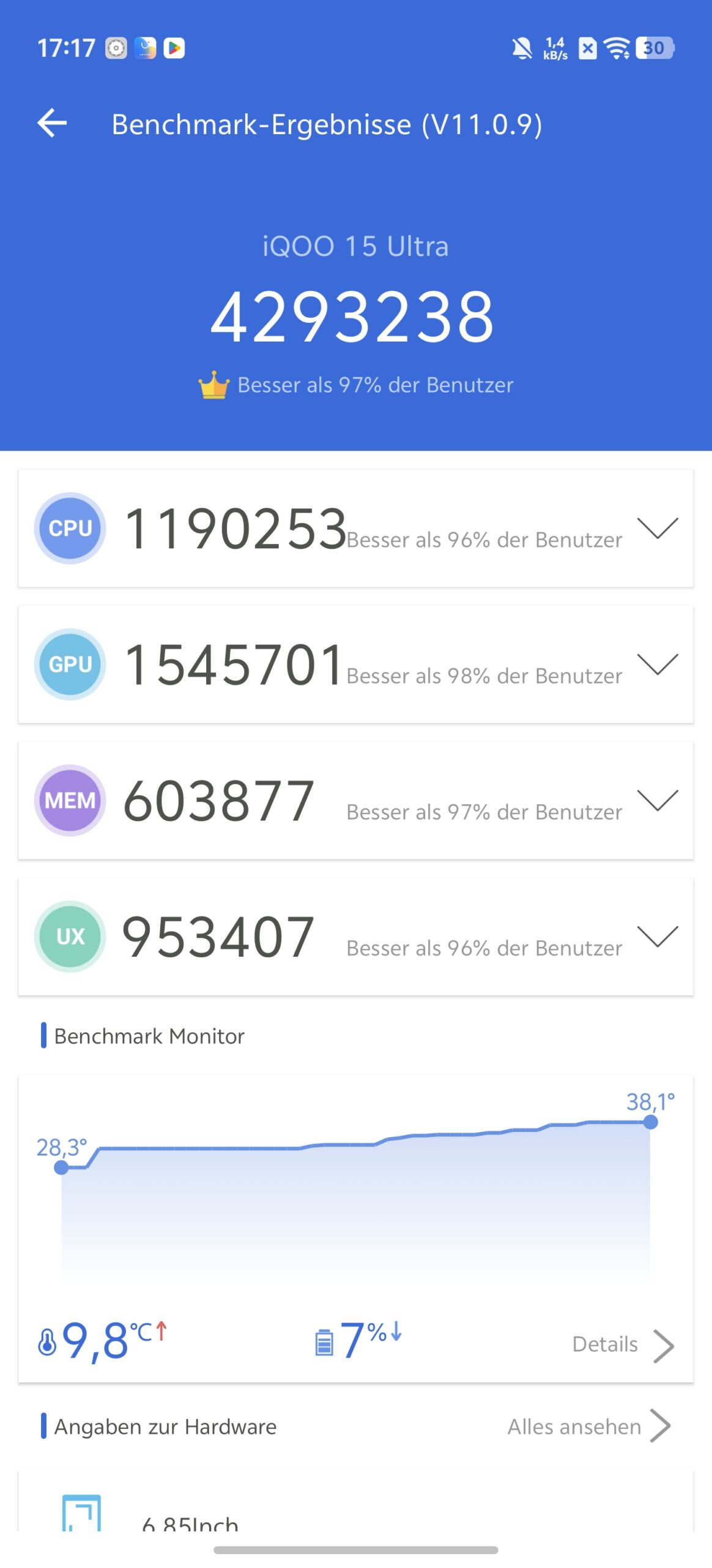 Auch im Akku-Benchmark bestätigt sich dieses Bild. Im 60-Hertz-Modus hielt das Smartphone knapp 23 Stunden durch. Damit landet es im internen iQOO-Ranking aber hinter dem 15er trotz größerem Akku. Im Automatik-Modus wendet sich das Blatt hingegen und das 15 Ultra schneidet mit knapp 22 Stunden deutlich besser ab als das in der Akkugröße unterlegene iQOO 15.