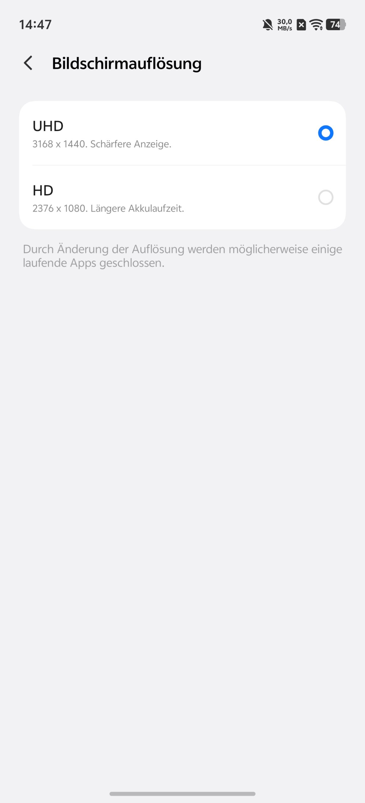 Das OLED-Panel auf der Vorderseite misst 6,85 Zoll und löst mit 3168 x 1440 Pixel auf. Daraus resultiert eine Pixeldichte von 508 Pixel pro Zoll, wodurch das Display gestochen scharf ist. Wer auf die Auflösung verzichten mag und eher auf eine gesteigerte Akkulaufzeit bedacht ist, kann in den Einstellungen auf eine HD-Auflösung von 2376 x 1080 Pixel herunterregeln. Das ist aber sichtbar weniger scharf und der Effekt auf die Akkulaufzeit ist gering. Dank 144 Hertz ist die Darstellung von Inhalten zu jedem Zeitpunkt flüssig. Mittels LTPO-Technologie passt das Smartphone die Bildwiederholungsrate dynamisch zwischen 1 und 144 Hertz an die angezeigten Inhalte an. Alternativ steht auch ein 60-Hertz-Modus zur Verfügung. Das Gerät erreicht die vollen 144 Hertz nur in einzelnen Spielen, im System ist bei maximal 120 Hertz Schluss. Neben diesen eher technischen Einstellungsmöglichkeiten ermöglicht das System auch Farbanpassungen jeglicher Art. Zusätzlich zu drei vordefinierten Farbmodi gibt es auch die Möglichkeit, die Farbtemperatur stufenlos einzustellen.