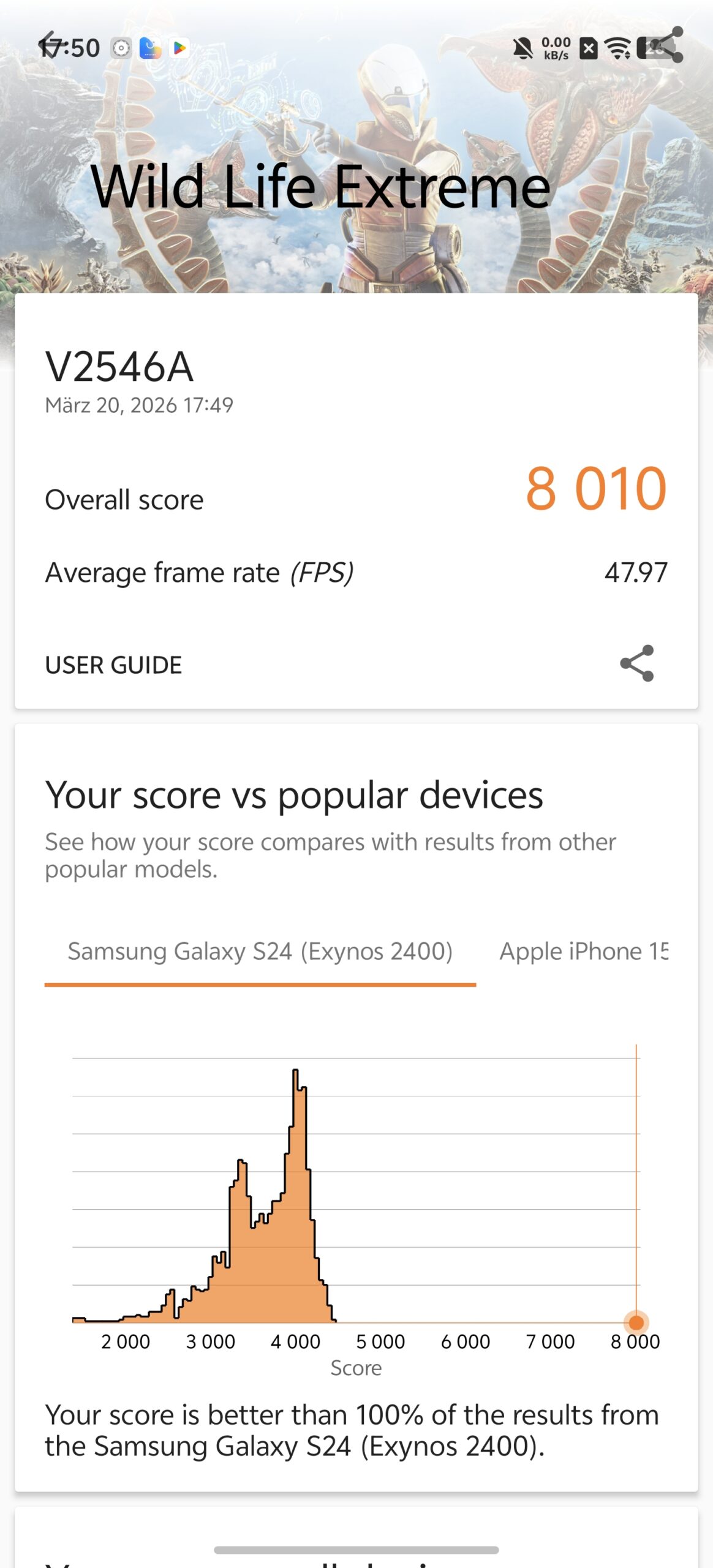 Im Alltag hat das iQOO 15 Ultra keinerlei Probleme. Sämtliche Apps starten und schließen blitzschnell und ihr bringt das Gerät nie an seine Grenzen. Selbst längere Sessions PUBG oder Asphalt Legends auf höchsten Grafikeinstellungen zwingen das Gerät lange nicht in die Knie. Auch mit deaktiviertem Lüfter erwärmt sich das Gerät im Alltag nicht. Selbst bei grafikfordernden Spielen entsteht nur eine minimale Wärmeentwicklung. Ihr nehmt sie zu keiner Zeit als störend wahr. Die Benchmarkergebnisse unterstreichen die Erlebnisse im Alltag deutlich. Andere Geräte sehen hier einfach alt dagegen aus. Unser Gerät mit 16GB/1TB erreicht einen neuen Bestwert im Antutu-Benchmark und lässt auch das Xiaomi 17 Ultra mit gleichem Prozessor deutlich hinter sich.