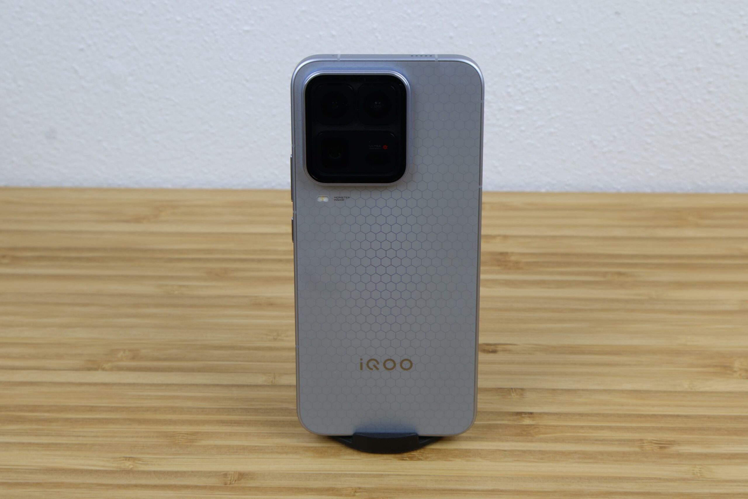 Mit Abmessungen von 163,7 x 76,8 x 8,7 Millimeter und einem Gewicht von 227 Gramm habt ihr es mit einem großen und schweren Gerät zu tun. Es entspricht den Abmessungen des Xiaomi 17 Ultra (zum Test). Wer ein handliches Gerät sucht, ist hier also definitiv an der falschen Adresse. Anders als bei Xiaomis Ultra-Smartphone kommt das iQOO 15 Ultra in einem etwas unauffälligeren Design daher. Auf der Glasrückseite prangt kein übergroßes Kameraelement, die Linsen sitzen in einem eher schlichten Quadrat in der linken oberen Ecke. Das einzige Auffällige hier ist eine kleine LED, die als Benachrichtigungs- und Ladestandsanzeige verwendet werden kann. Im Rahmen des Kamera-Elements verstecken sich die ersten Lüftungsschlitze. Zudem besitzt die Rückseite ein dezentes Wabenmuster. Ansonsten ist das Design eher unauffällig: Eckiger Aluminiumrahmen, flaches Display und symmetrische Bildschirmränder.