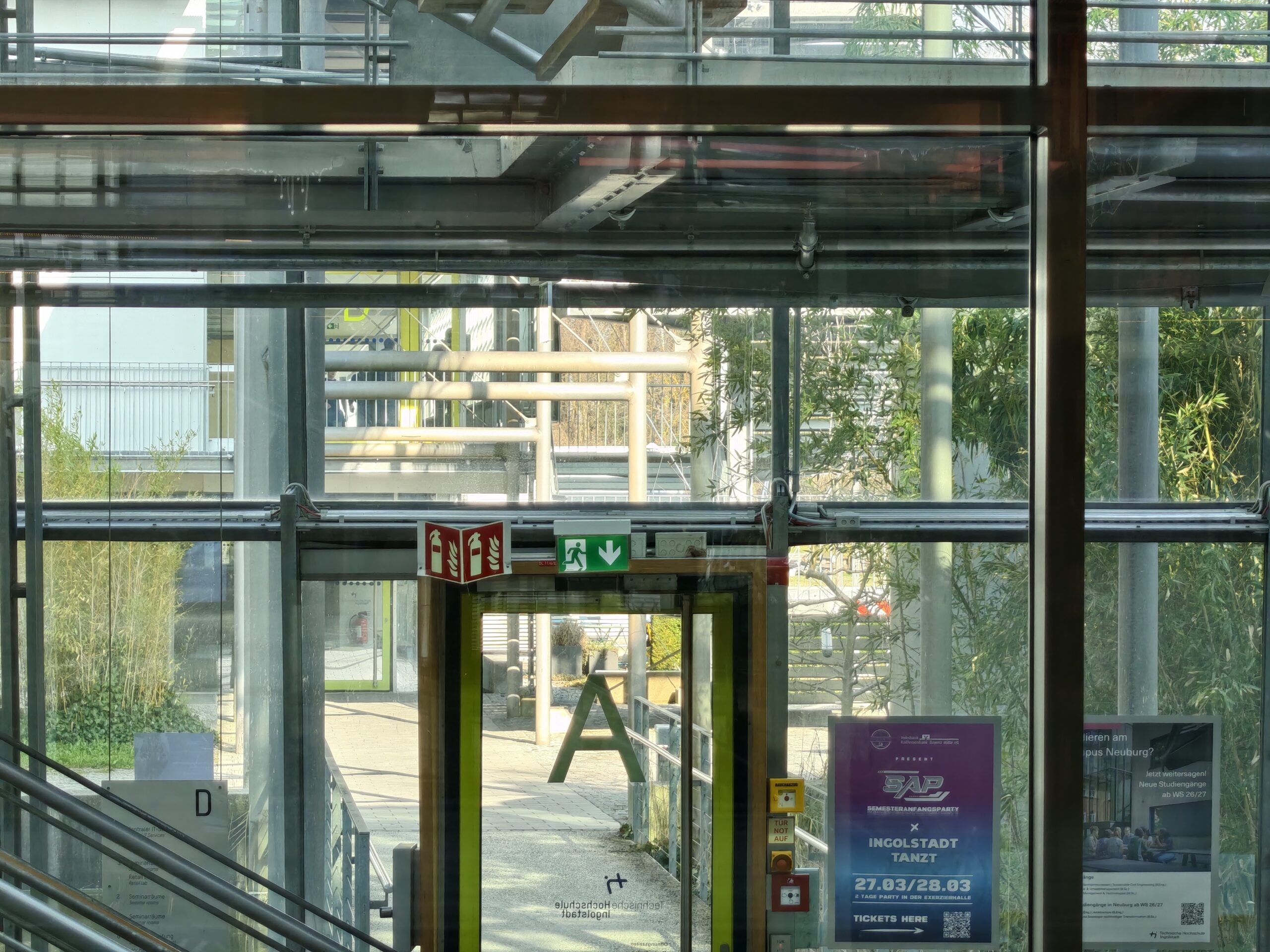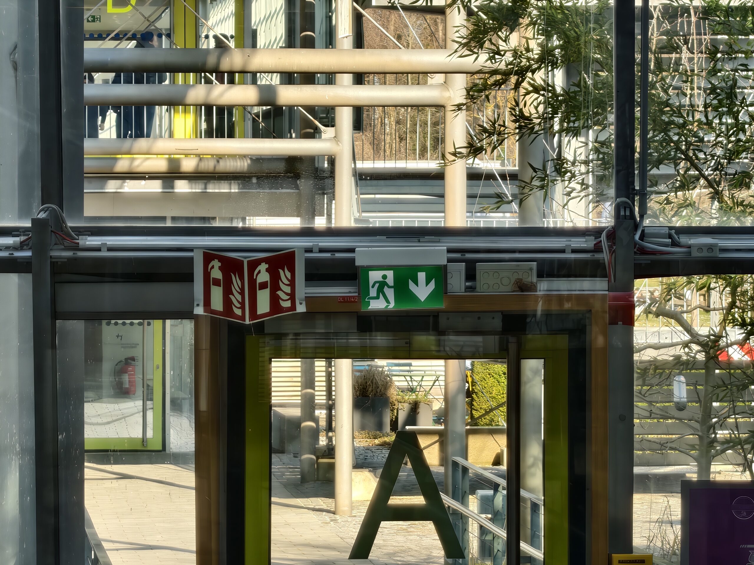 Die folgende Bilderstrecke bildet einige Zoomstufen zwischen 3-facher und 100-facher ab. Hier ist ab 20-facher Vergrößerung eine deutliche Weichzeichnung zu erkennen und es schleichen sich Artefakte ins Bild, die nicht ganz der Wahrheit entsprechen. Zu erkennen ist das etwa an den Schriftzeichen neben dem Notausgang-Schild: