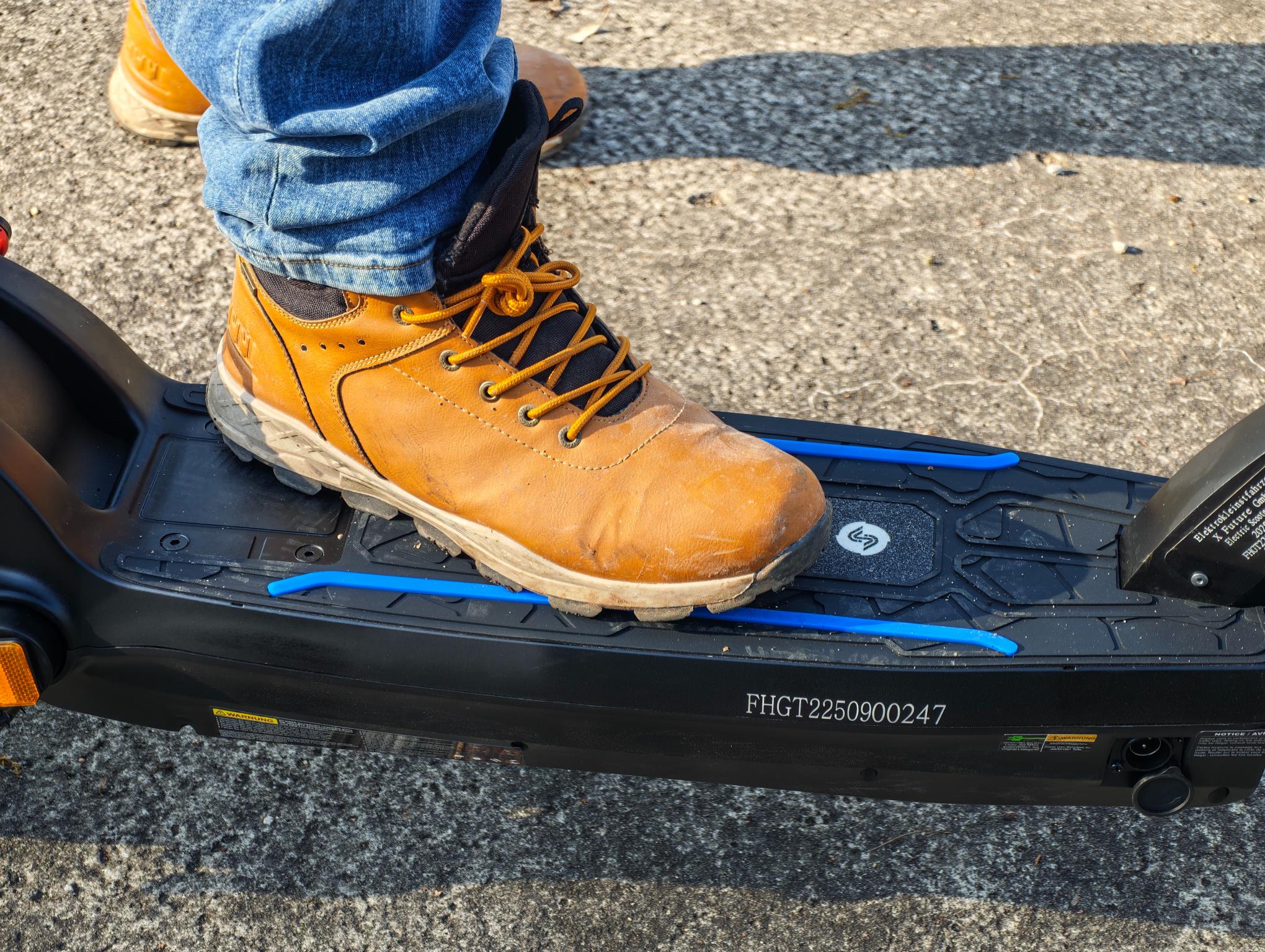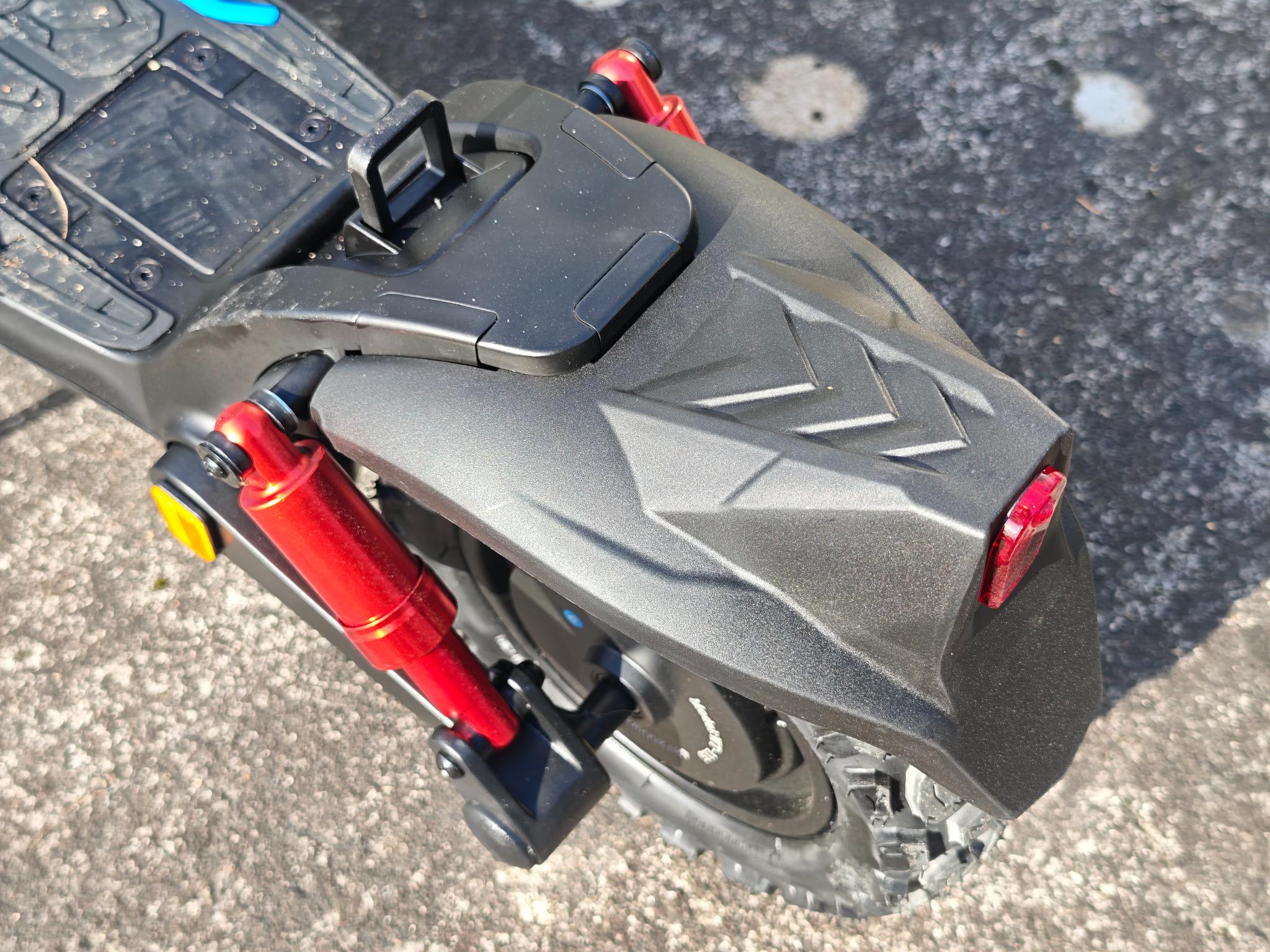 Der GT2 rollt auf wuchtigen 11 Zoll Geländeluftreifen (mit Schlauch, 2,5 bar). Im echten Offroad-Einsatz sind diese Reifen genial und haben im Test selbst starken Schlamm und Dreck bewältigt. Auf normalem Asphalt zeigen sich jedoch Schwächen: Die groben Stollen verursachen starke Vibrationen, bieten bei Nässe wenig Grip und verlängern den Bremsweg bei hohem Tempo.